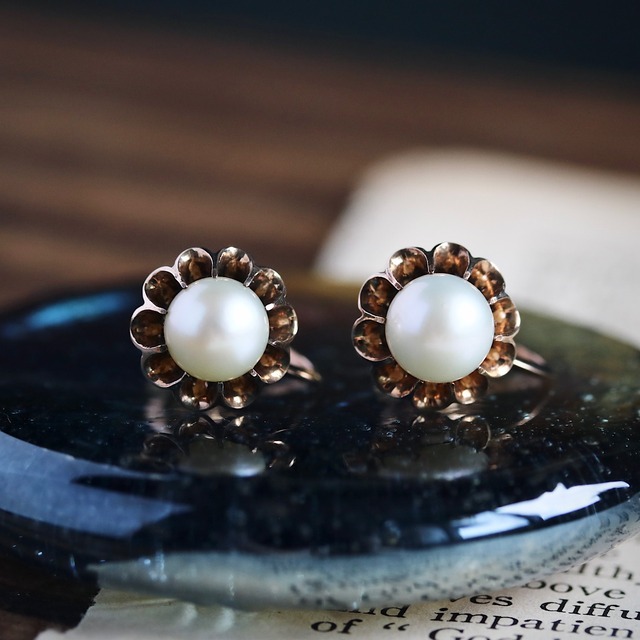 K10 あこや真珠 菊爪デザイン ヴィンテージイヤリング