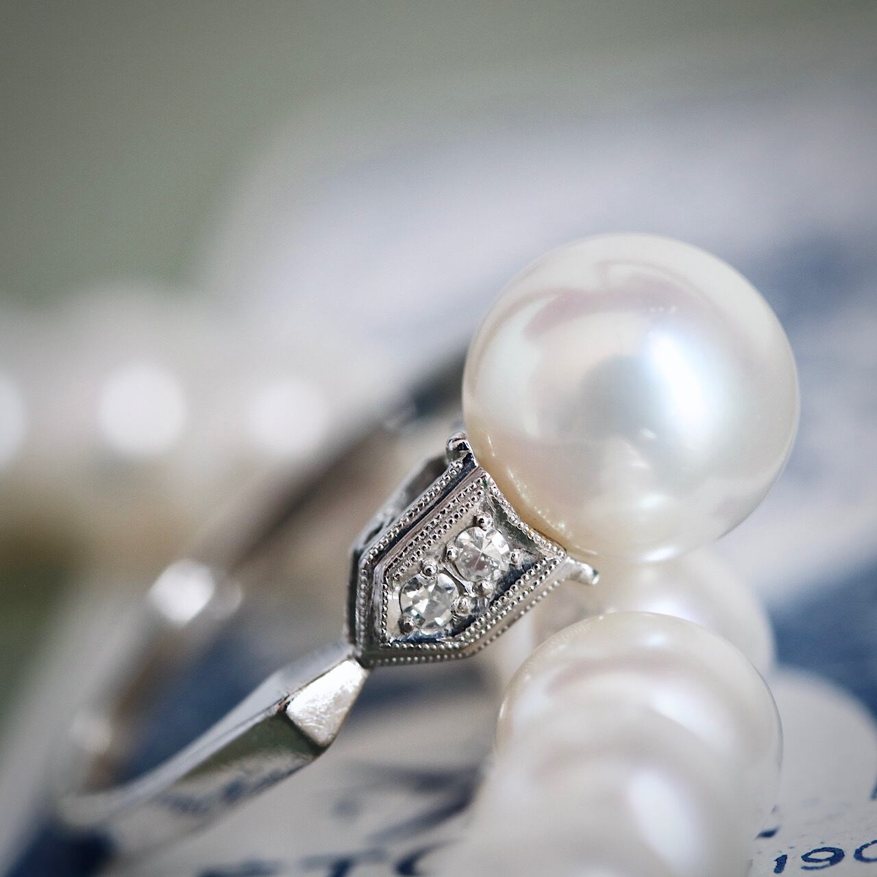 ミキモト製 K14WG あこや真珠とシングルカットダイヤモンドのヴィンテージリング。