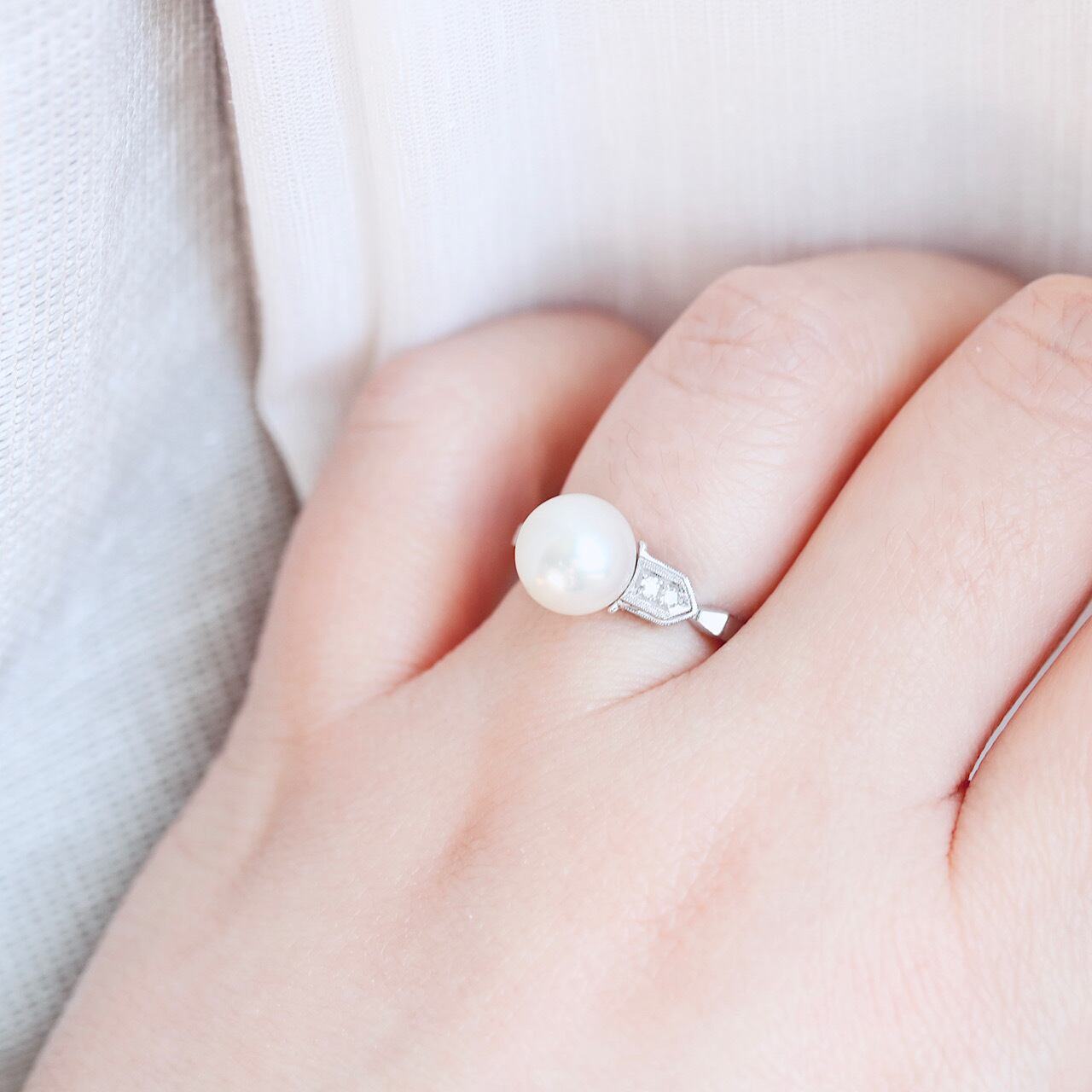 ダイヤモンド付きの華やかなデザインのパールリングは、ひとつでも存在感がありコーディネートの主役になります。