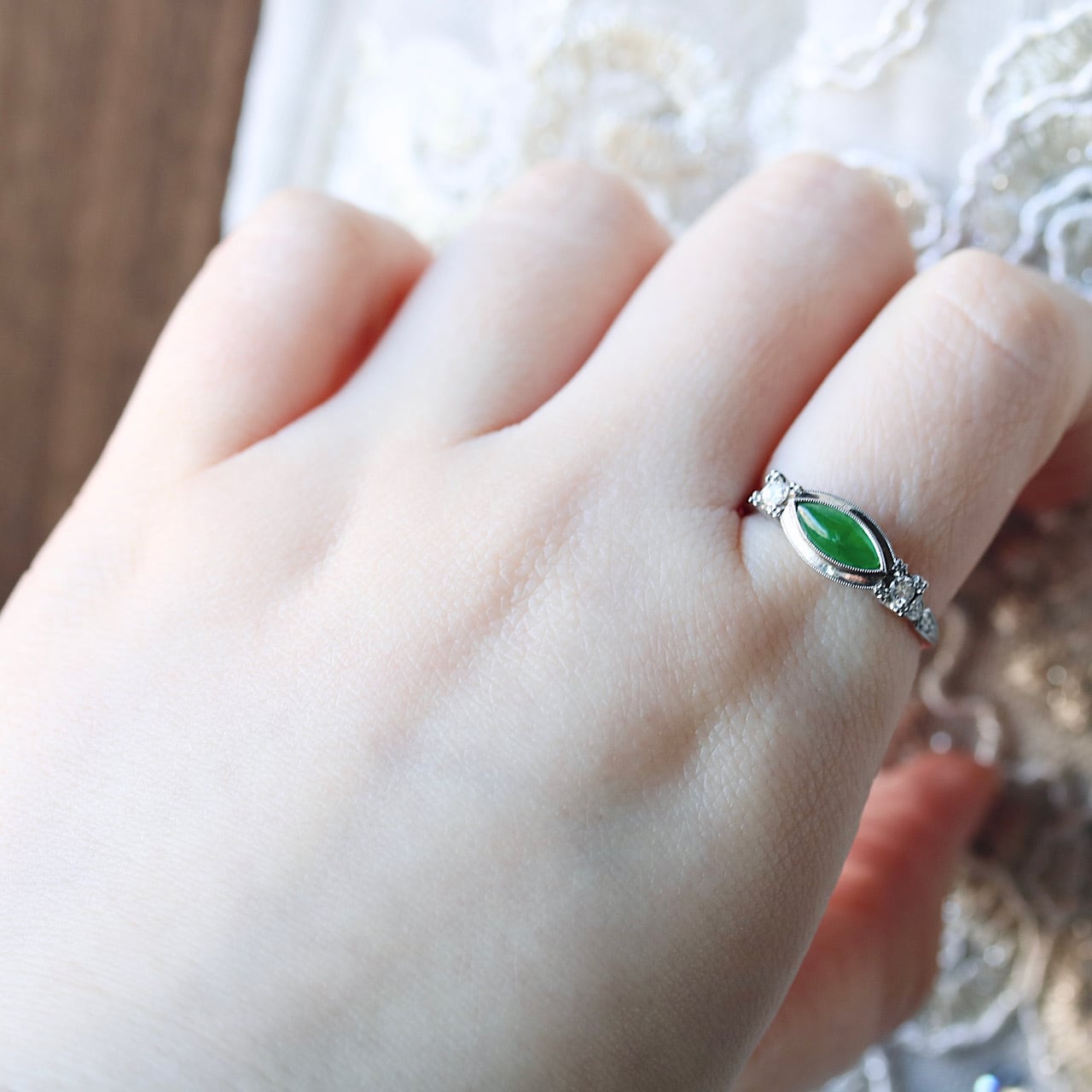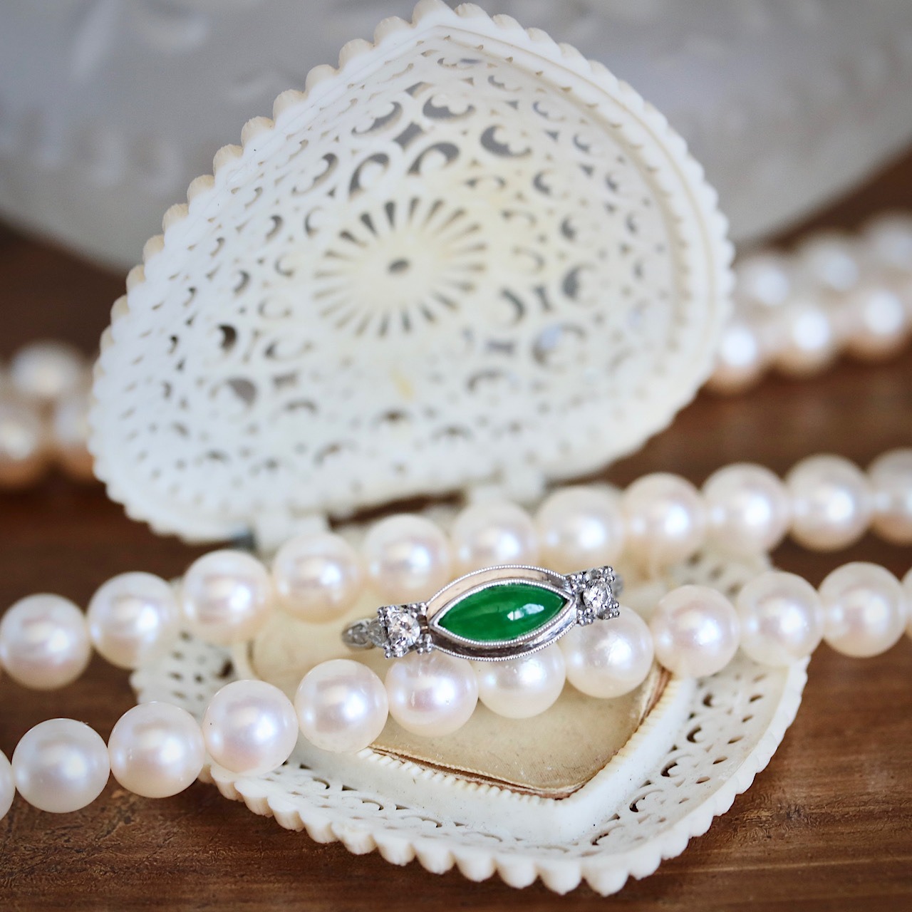 マーキスカットの翡翠を横向きに配置した、なかなか珍しいデザインです。