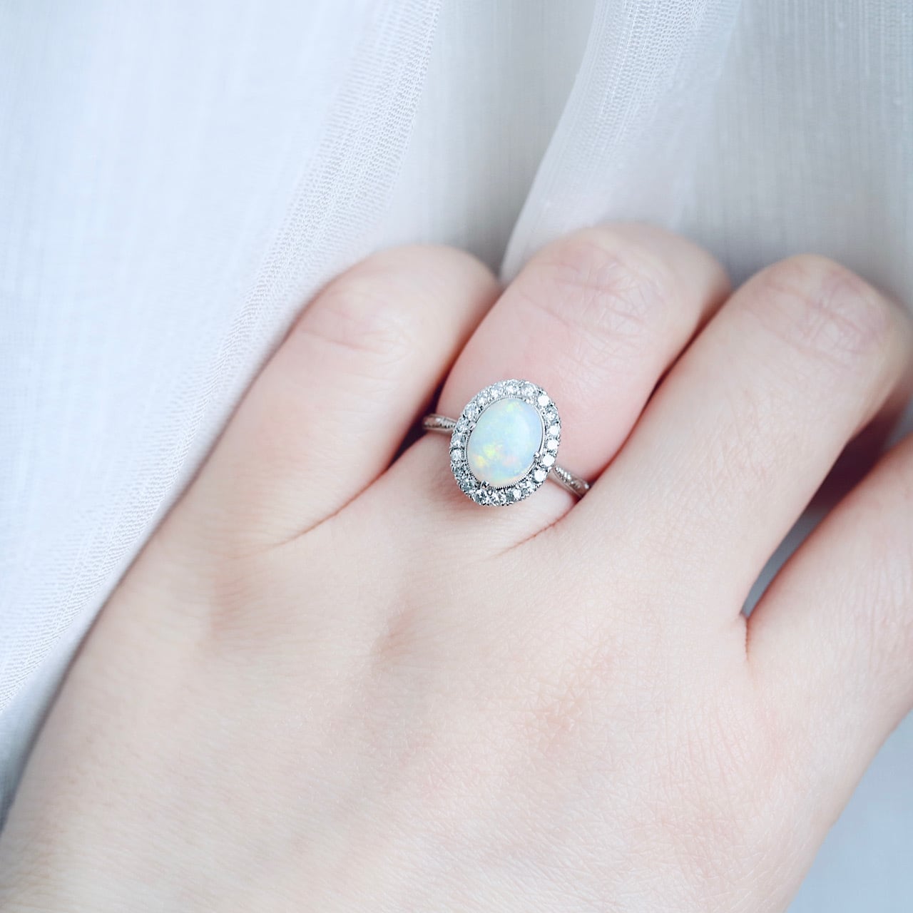 中心にはカボションカットの美しい天然オパールがセットされ、その周りを取り囲むように配置されたダイヤモンドが上品かつ華やかなリングです。