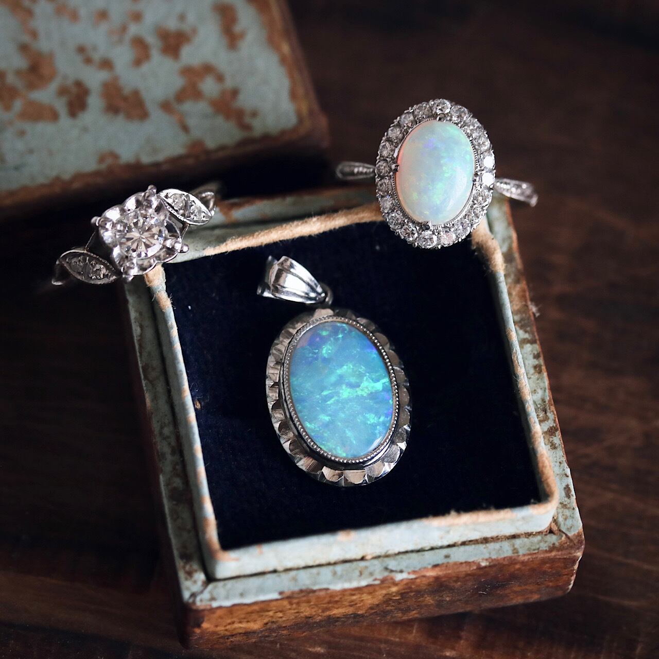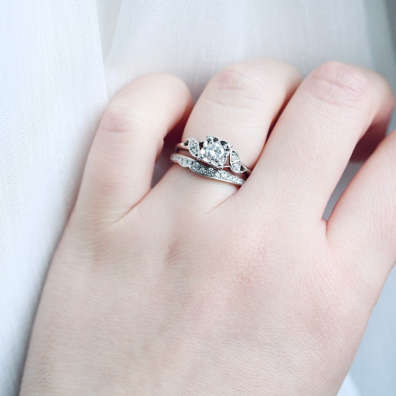 可憐なお花モチーフ、プラチナと華やかな輝きのダイヤモンドの組み合わせが大人可愛いヴィンテージリングです。