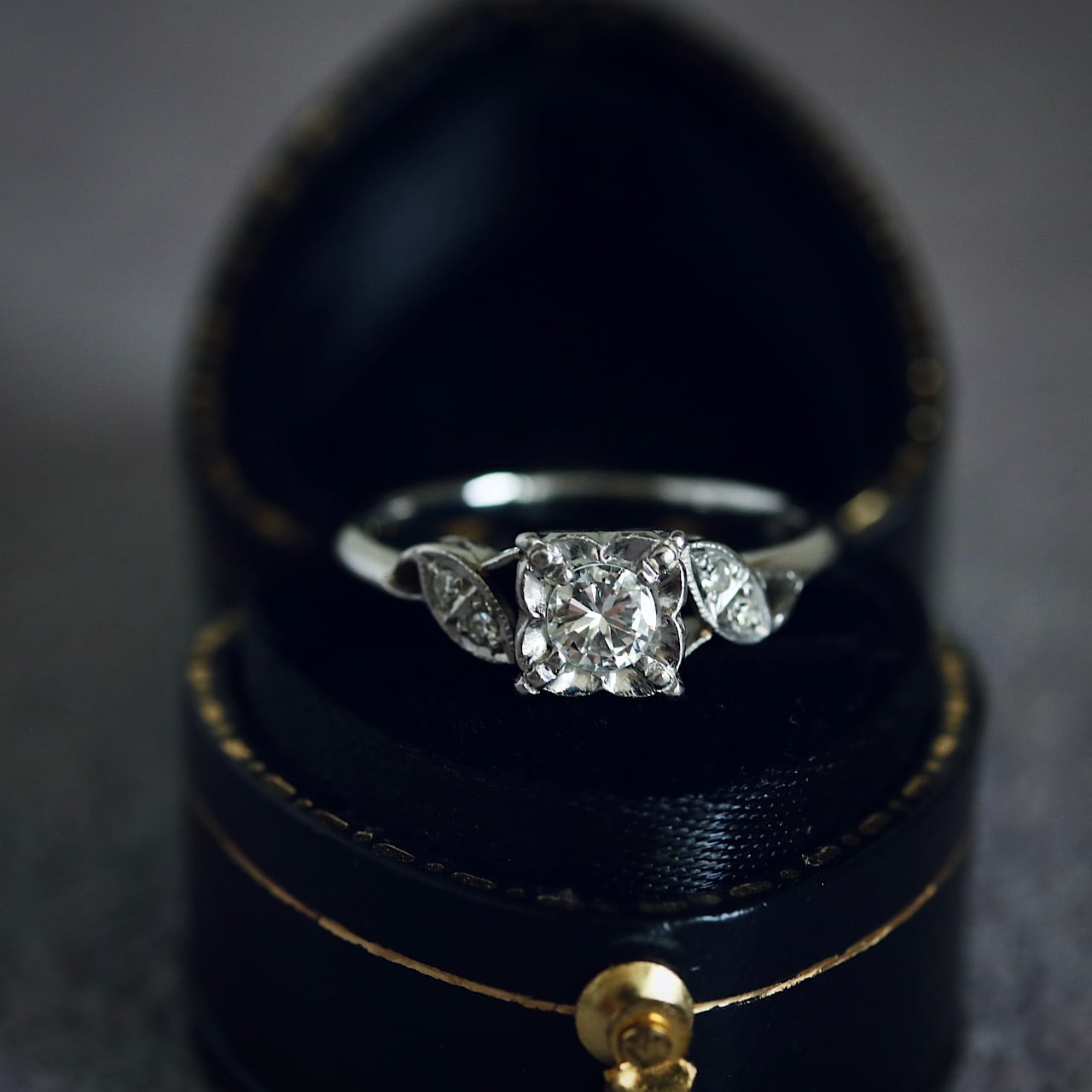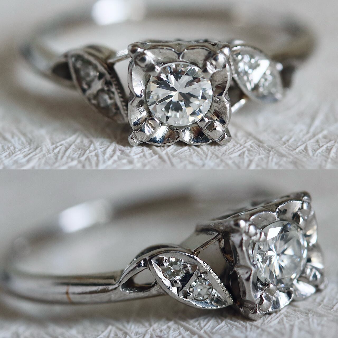 メインのダイヤモンドは無色で綺麗なもので、シャンクにはシングルカットのメレダイヤモンドが使用されています。