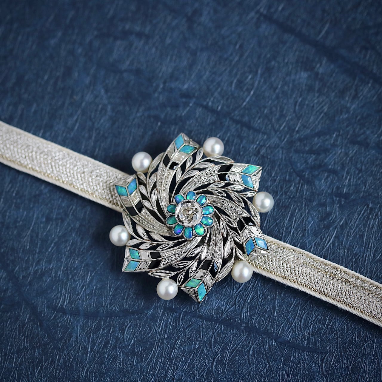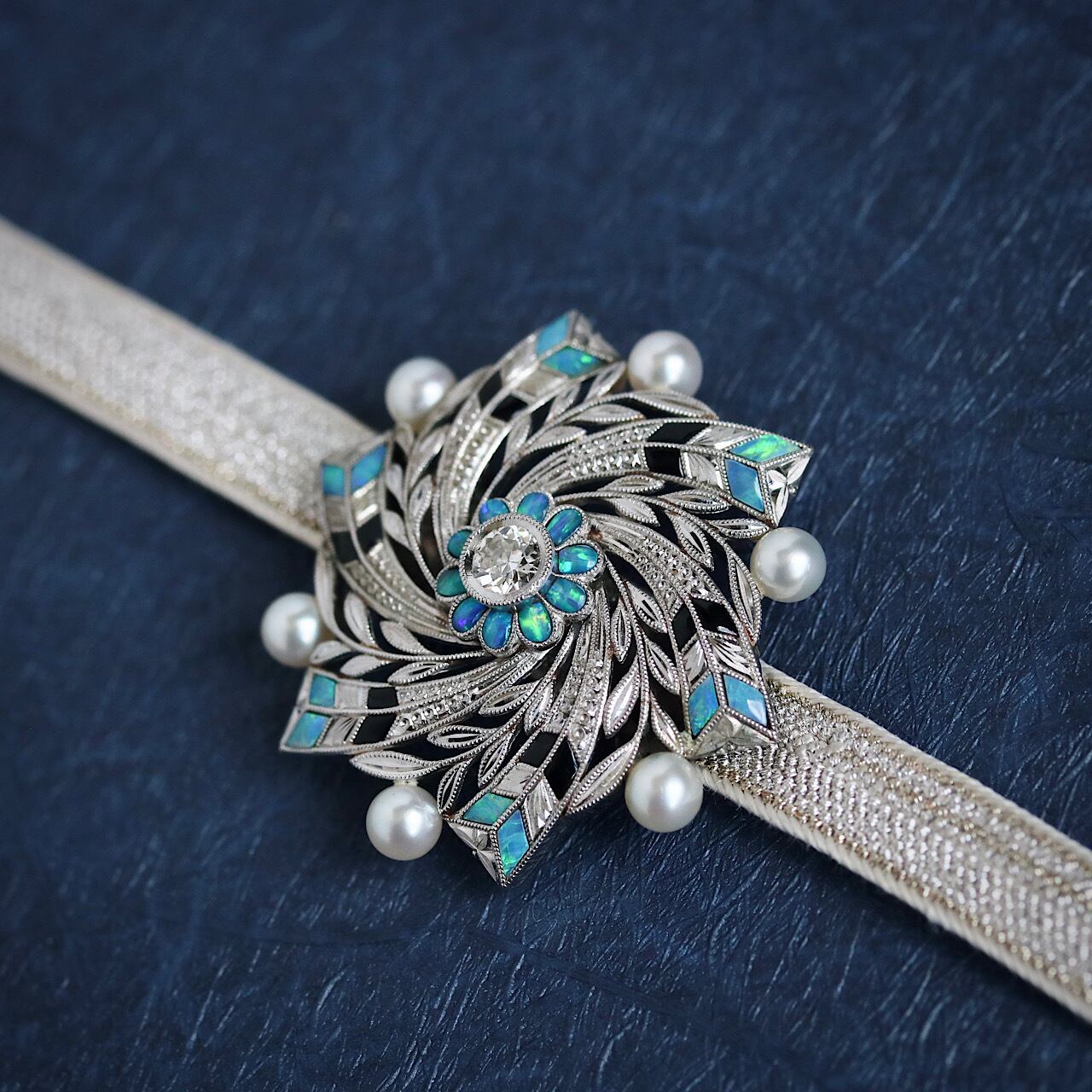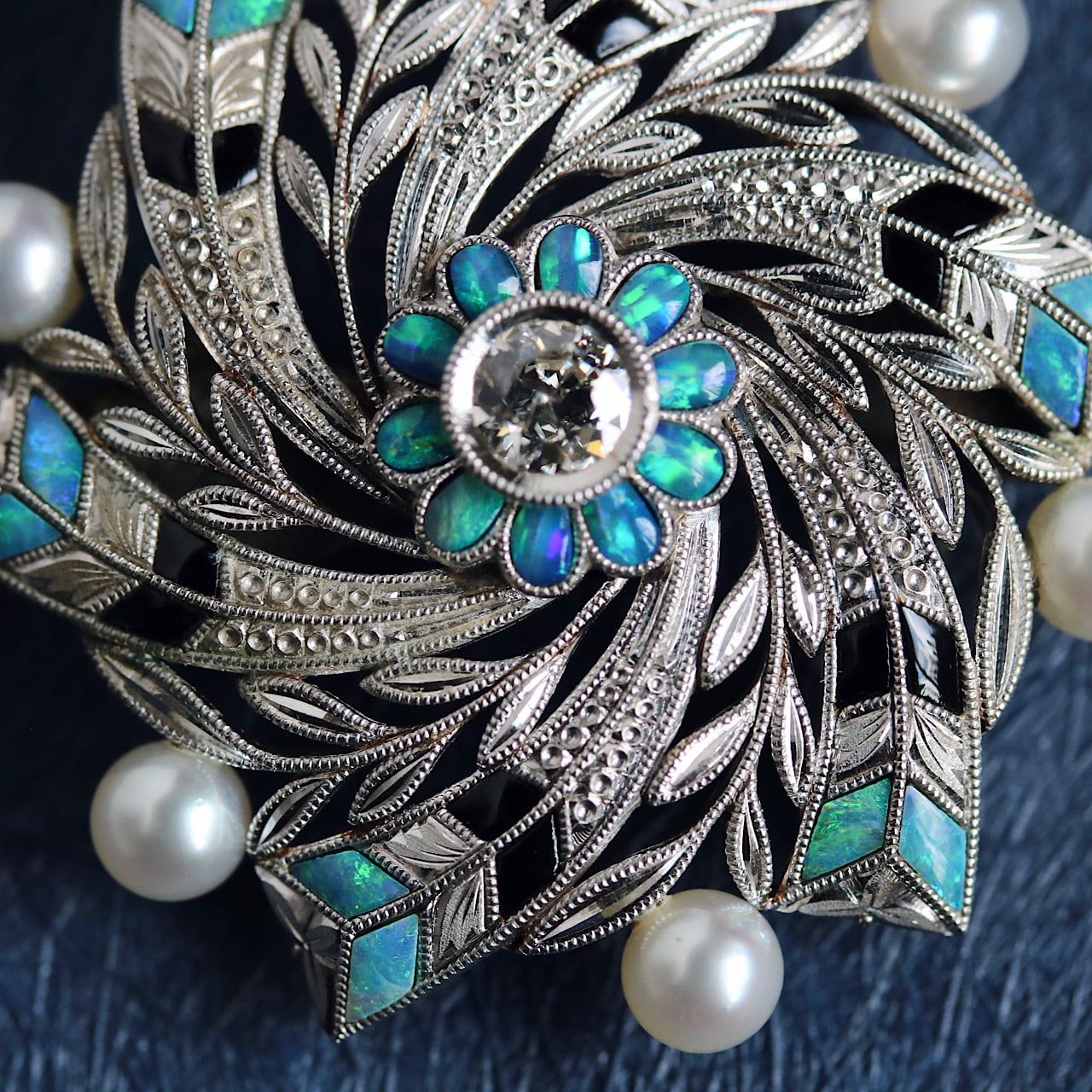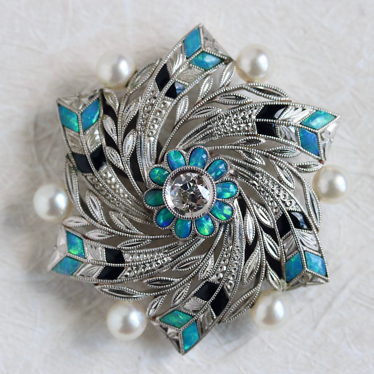 天然オパールやダイヤモンド、あこや真珠やオニキスなどの美しい宝石が贅沢に使用された、大正時代から昭和初期頃の高級帯留めになります。