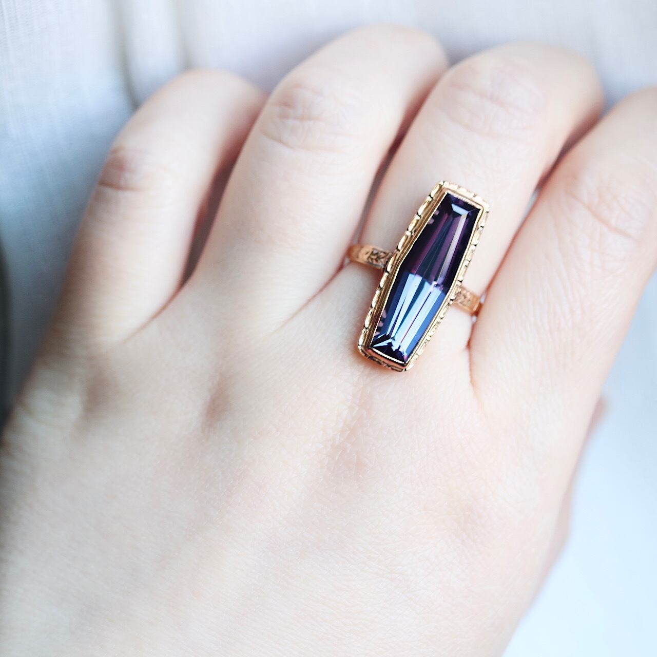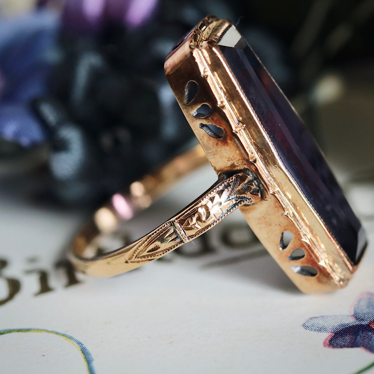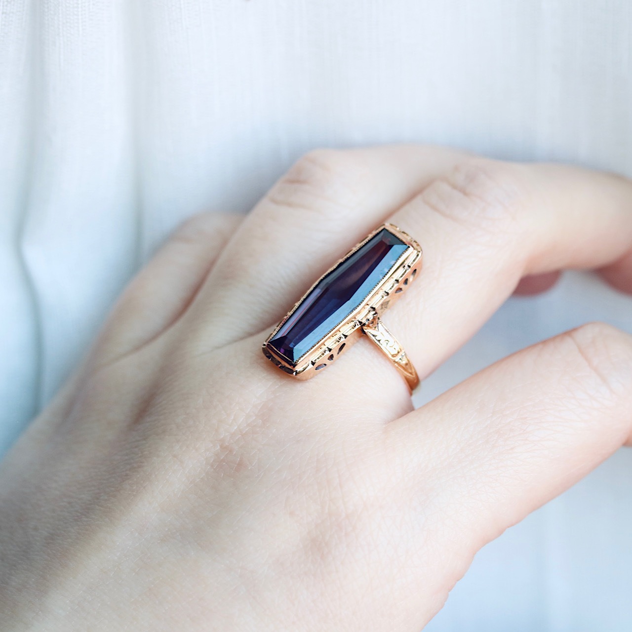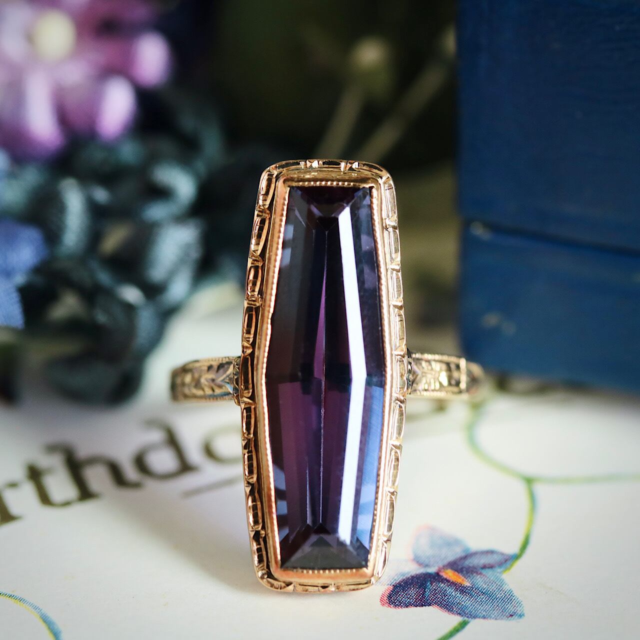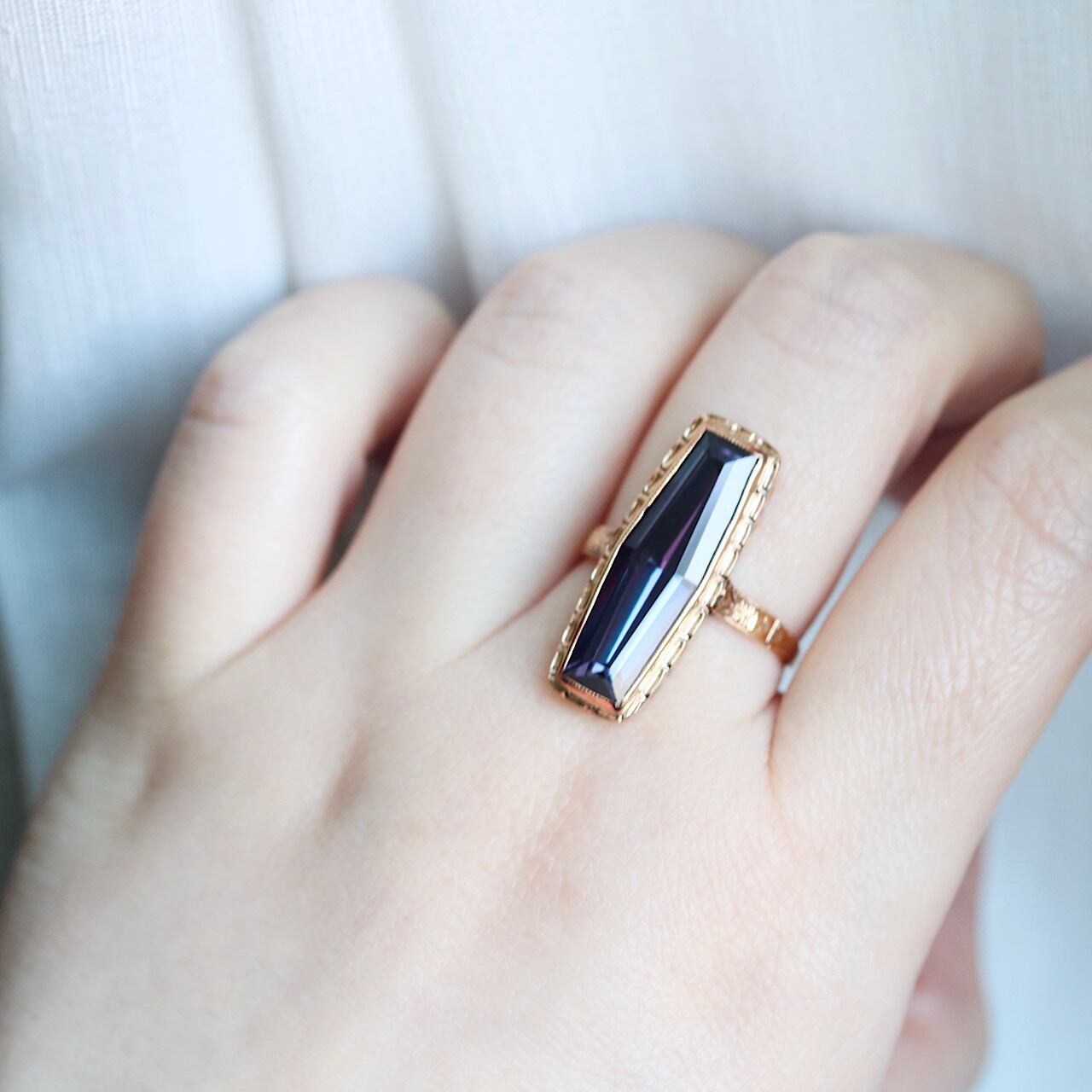 鮮やかなパープルの合成石が目を引く、額縁デザインが特徴のヴィンテージリング。