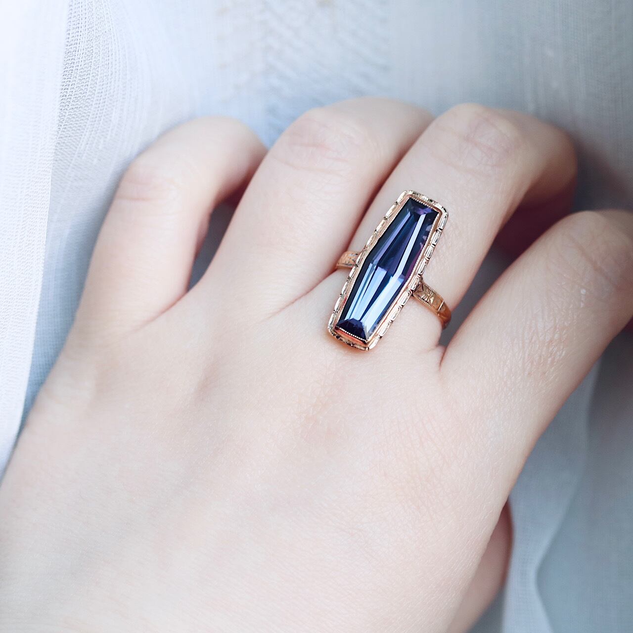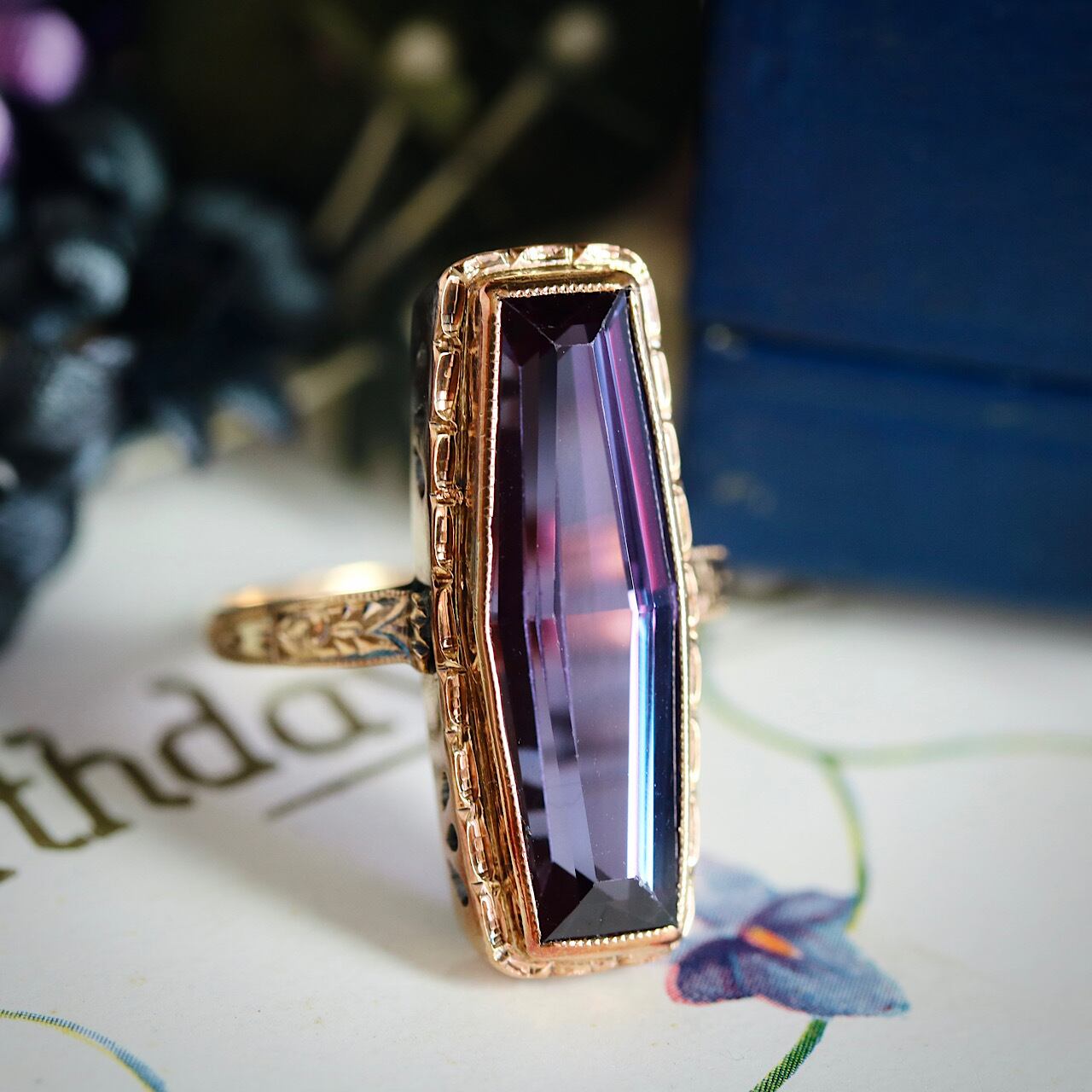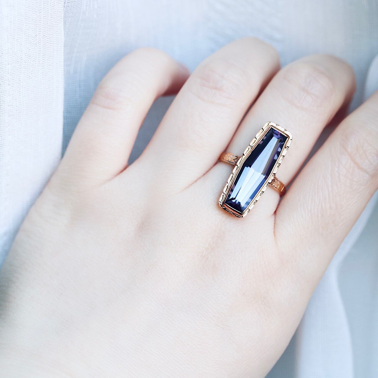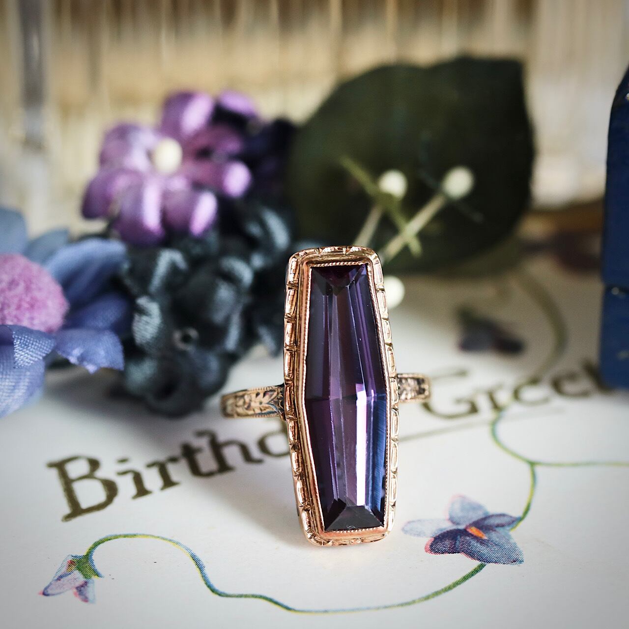 鮮やかなパープルの合成石が目を引く、額縁デザインが特徴のヴィンテージリング。
