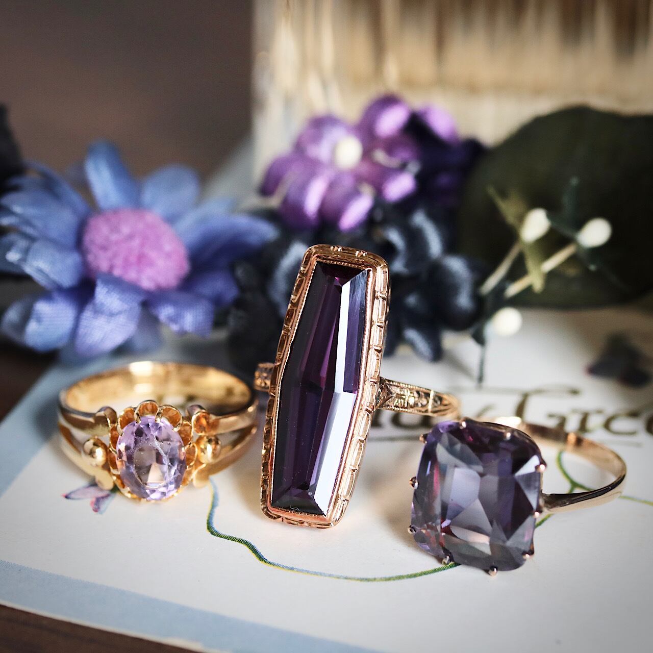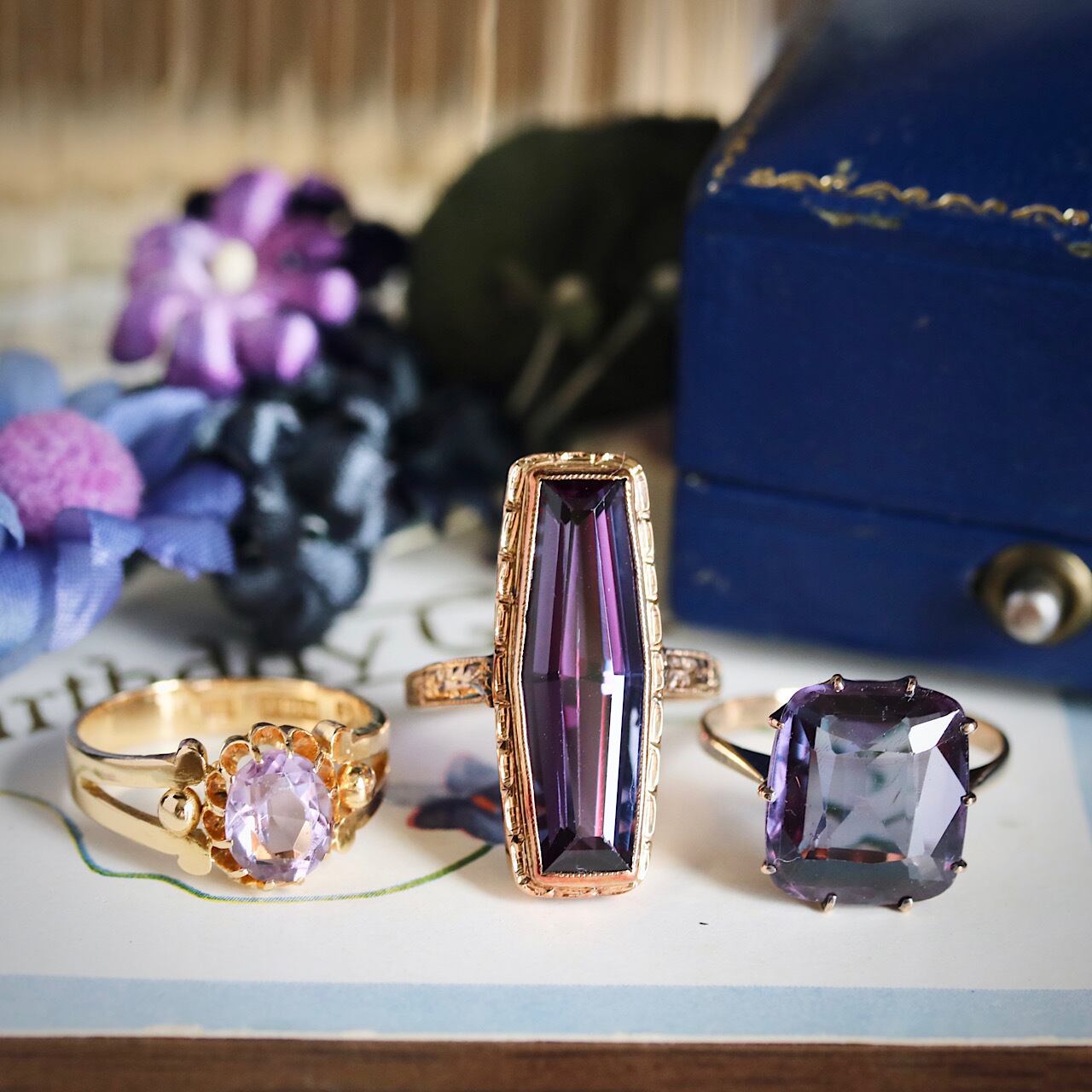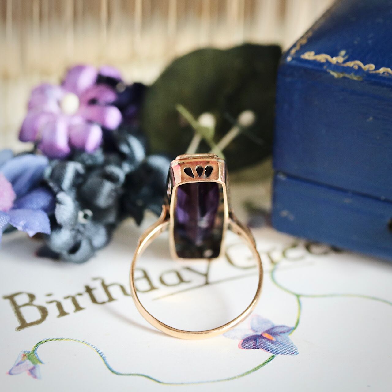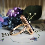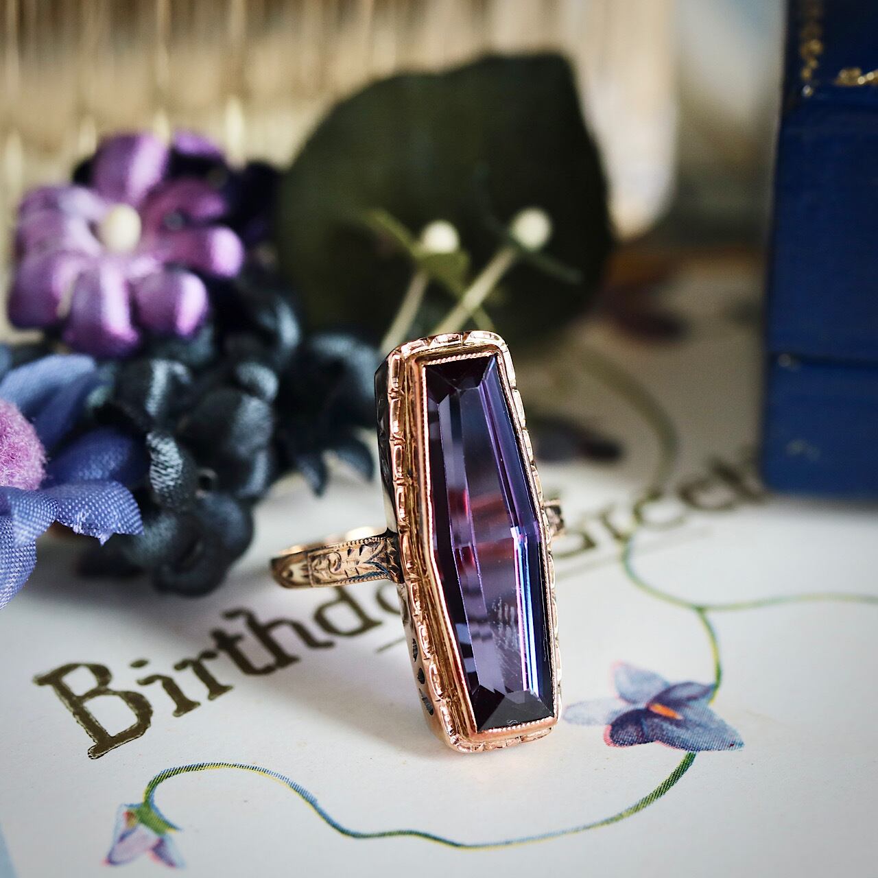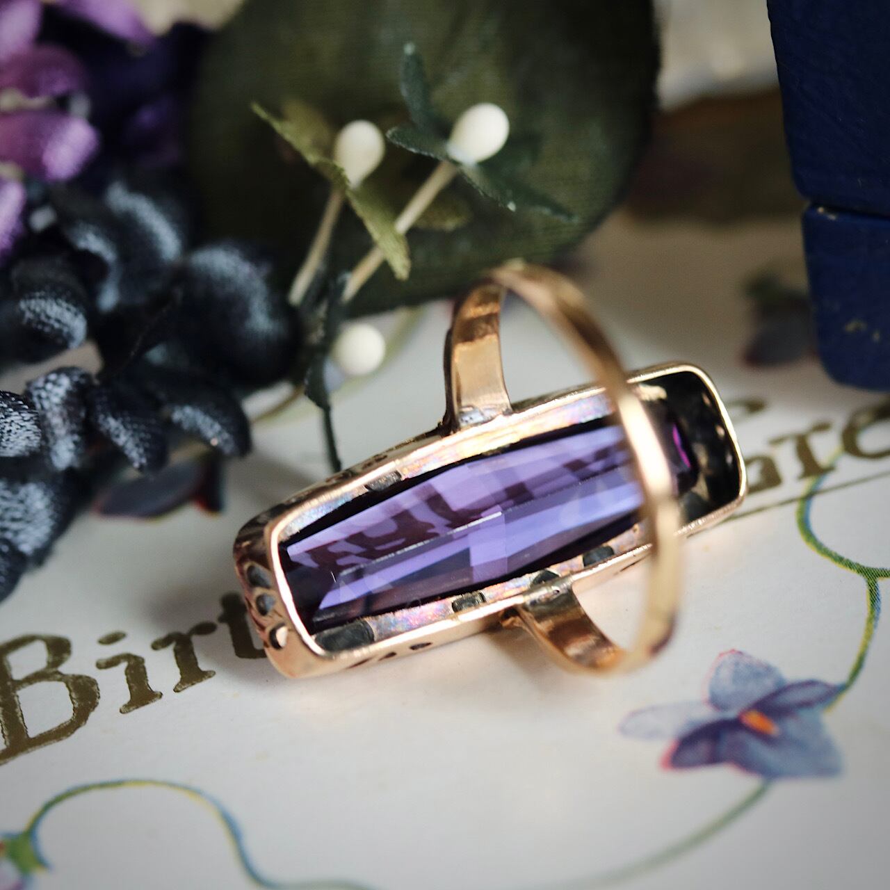 鮮やかなパープルの合成石が目を引く、額縁デザインが特徴のヴィンテージリング。