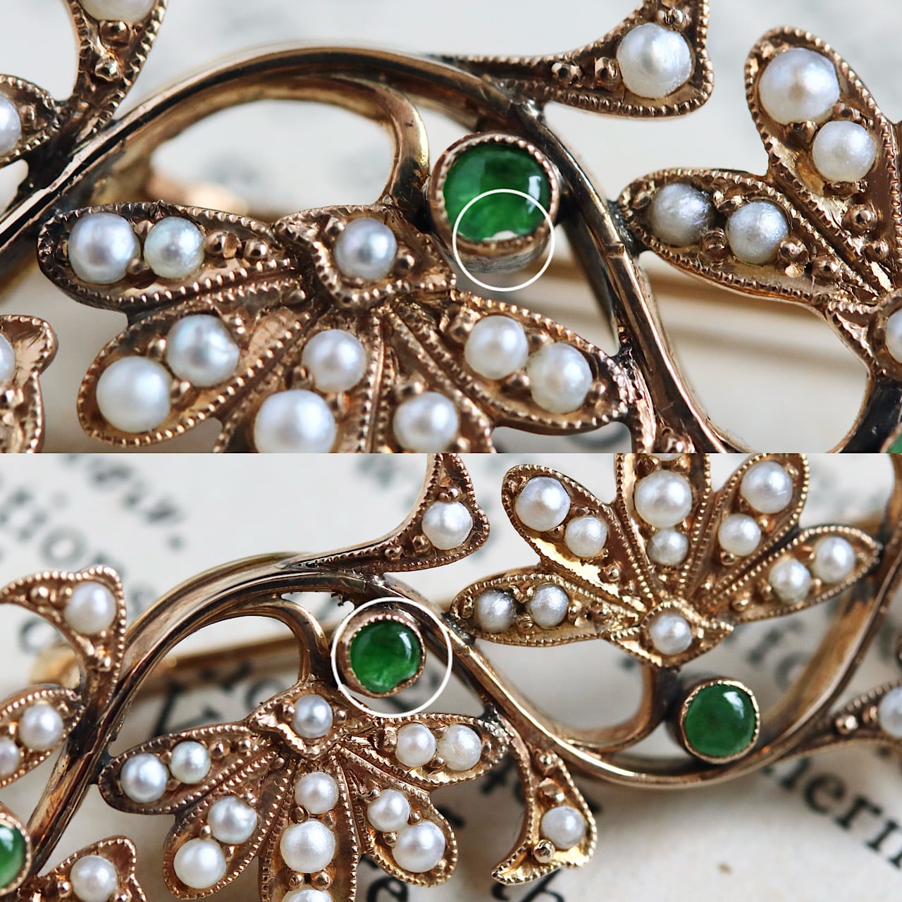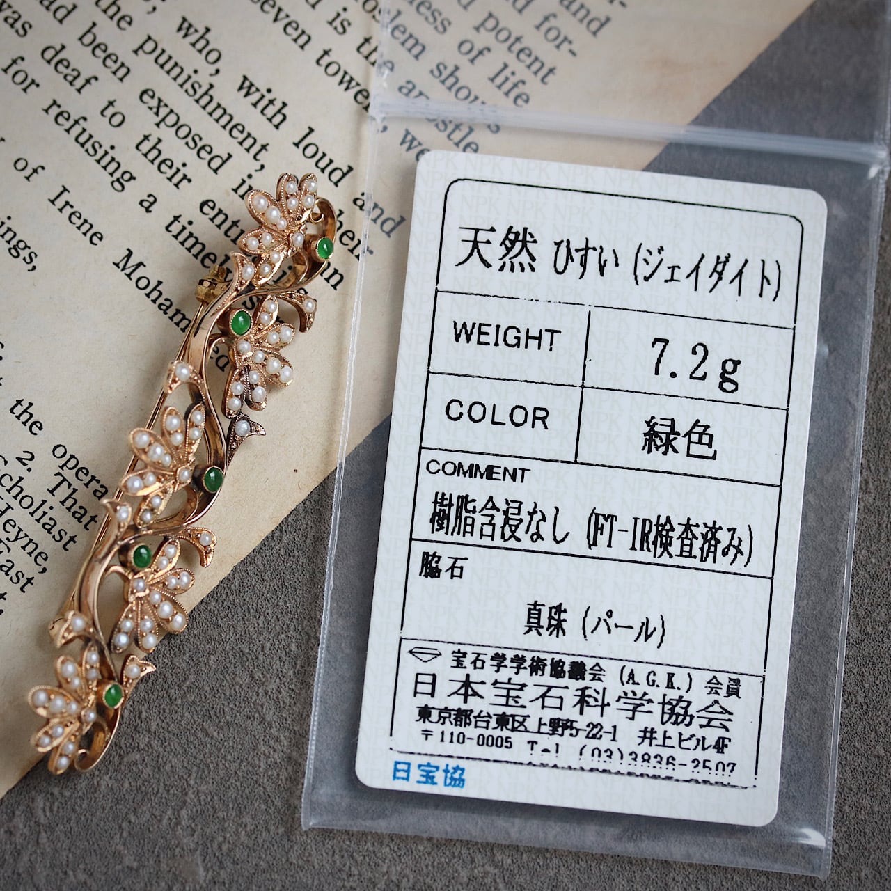 【貴重】K14 芥子パール 天然翡翠 アール・ヌーヴォー ブローチ ソーティングメモ付