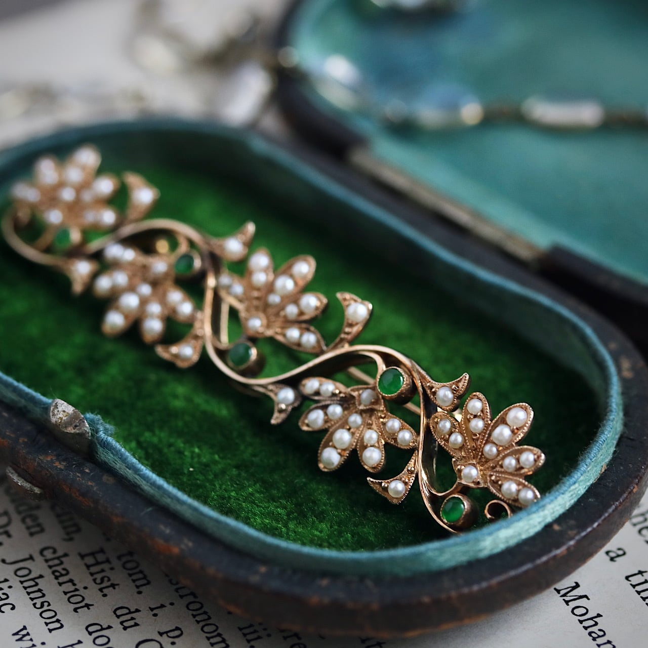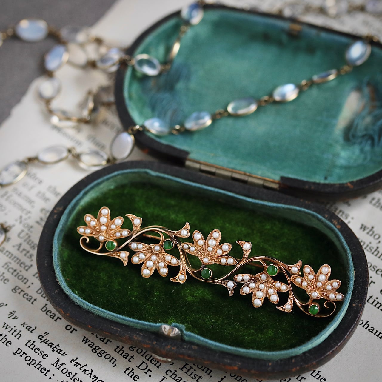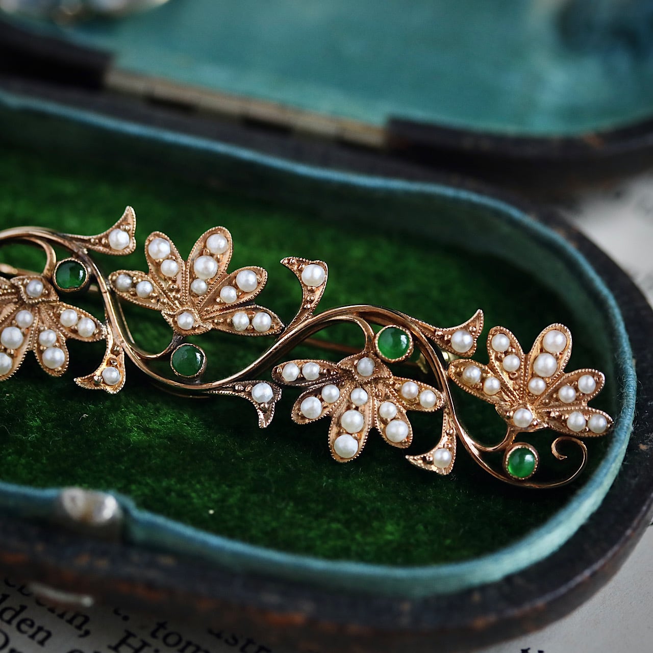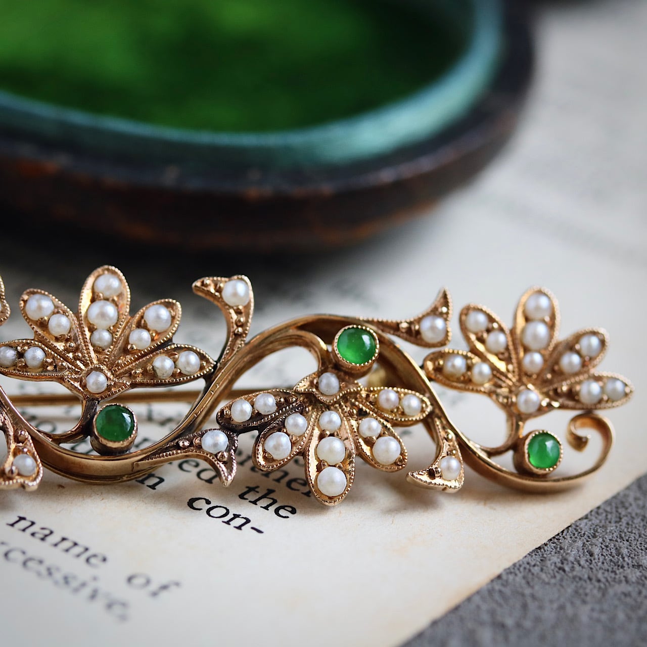 K14 芥子パール&天然翡翠 蔦モチーフのアール・ヌーヴォーブローチ。