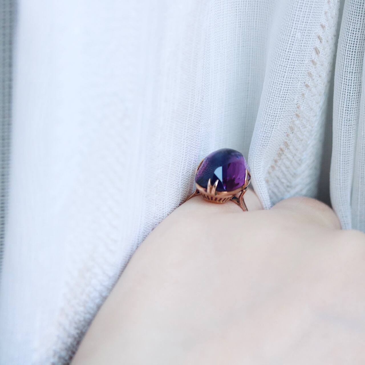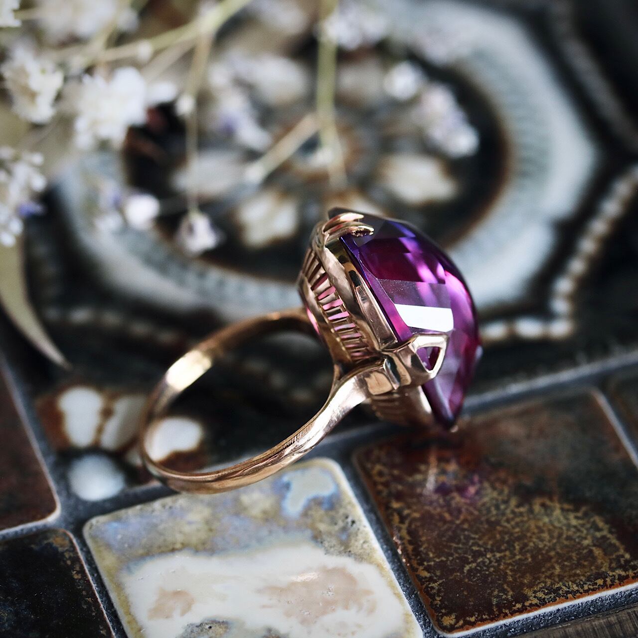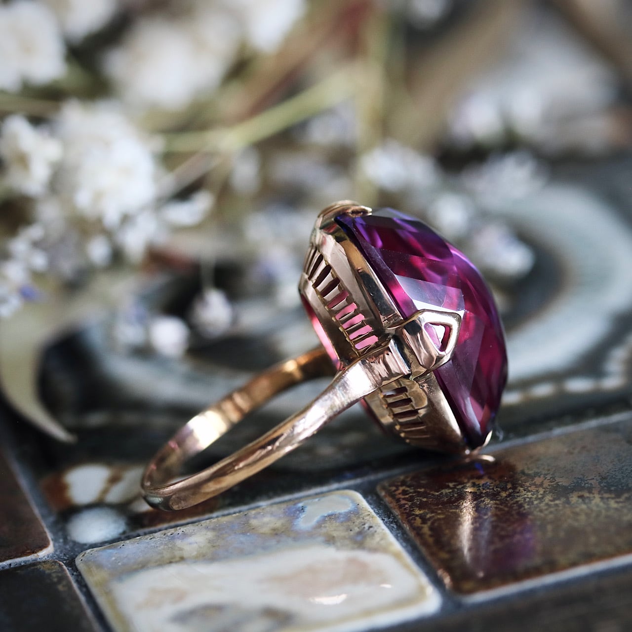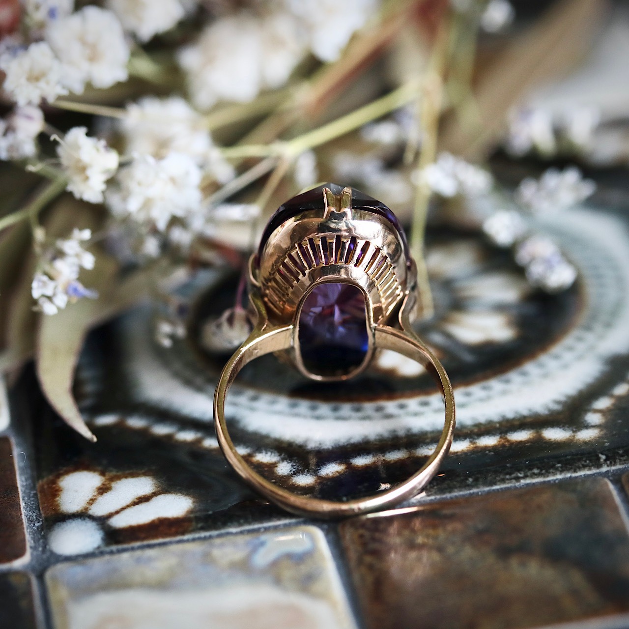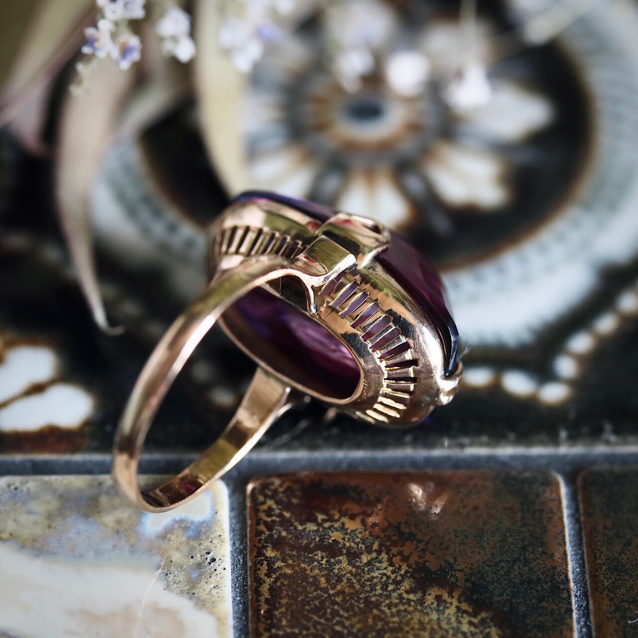 大きな合成パープルサファイアが煌めく、美しい千本透かしデザインのヴィンテージリングです。