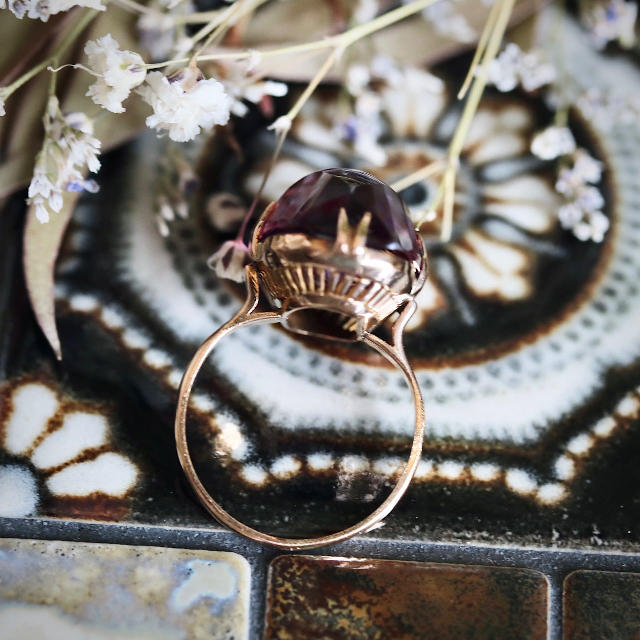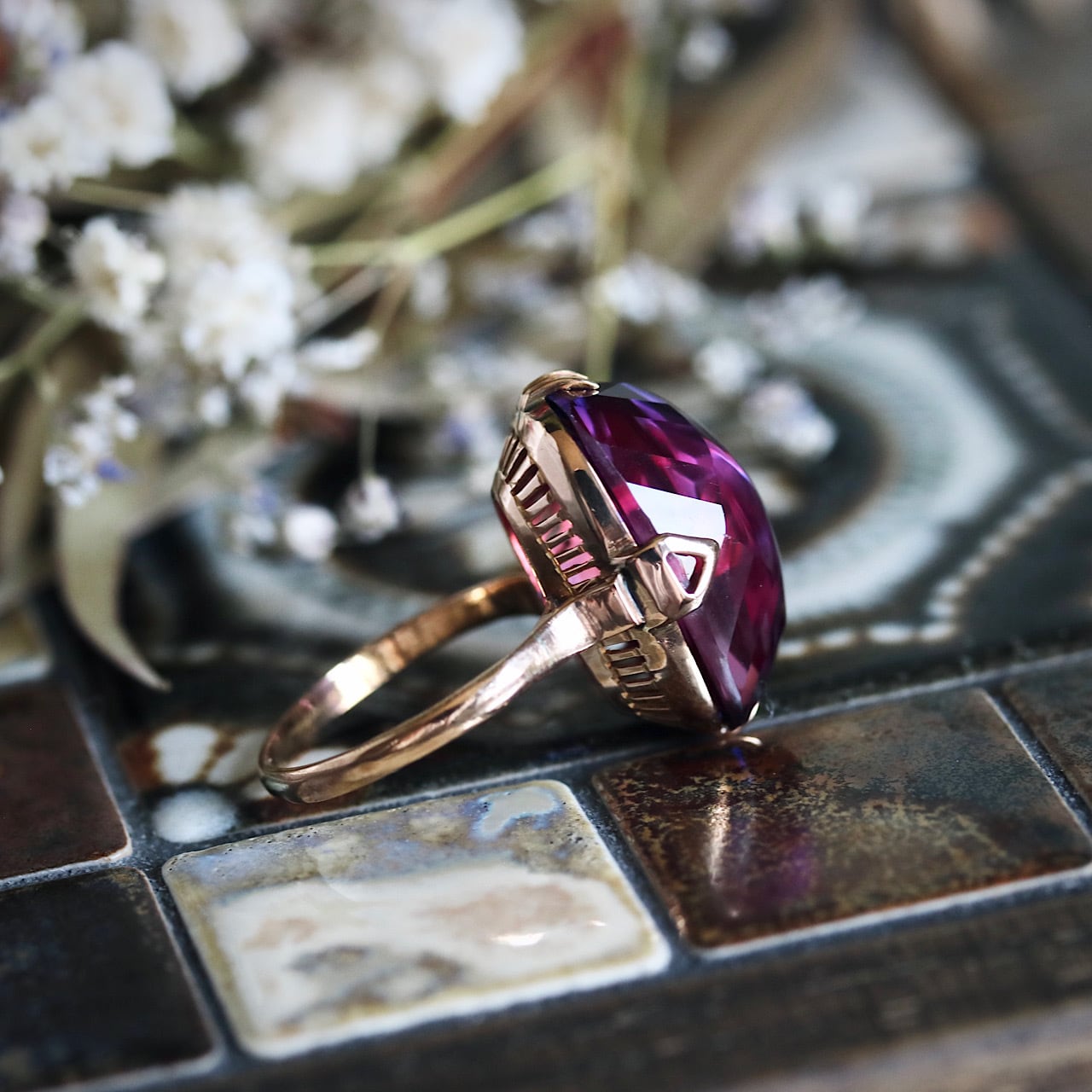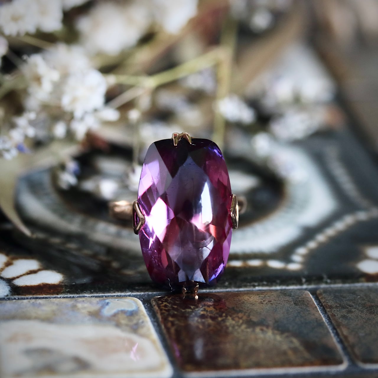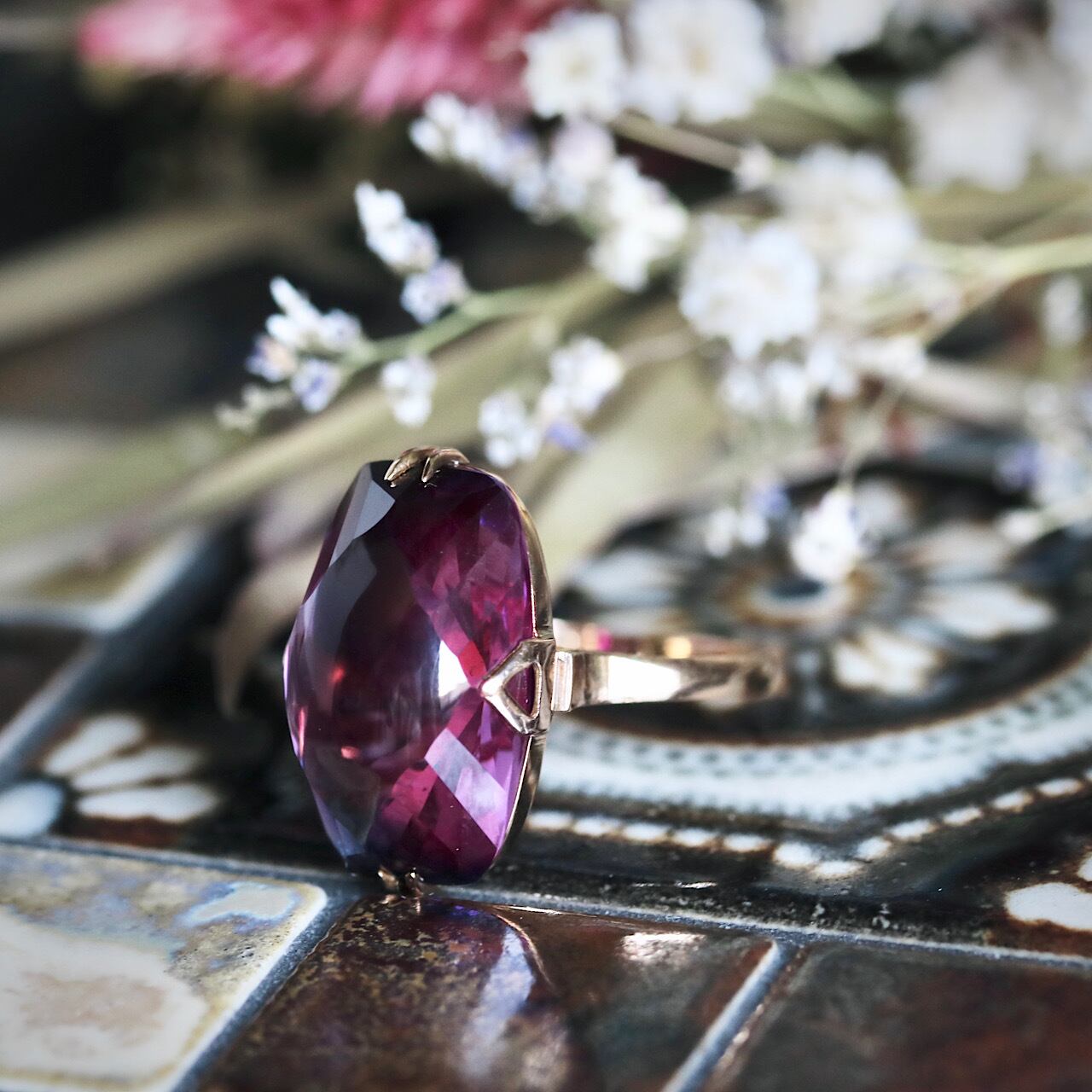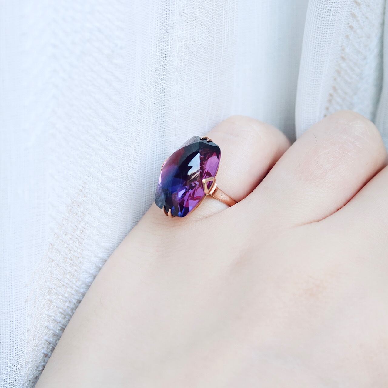 大きな合成パープルサファイアが煌めく、美しい千本透かしデザインのヴィンテージリングです。