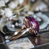 珍しいカットの合成パープルサファイアは、ぷっくりと厚みのある瑞々しい質感とキラキラとした多面カットの煌めきが合わさり、まるで葡萄ゼリーのような涼しげな印象。