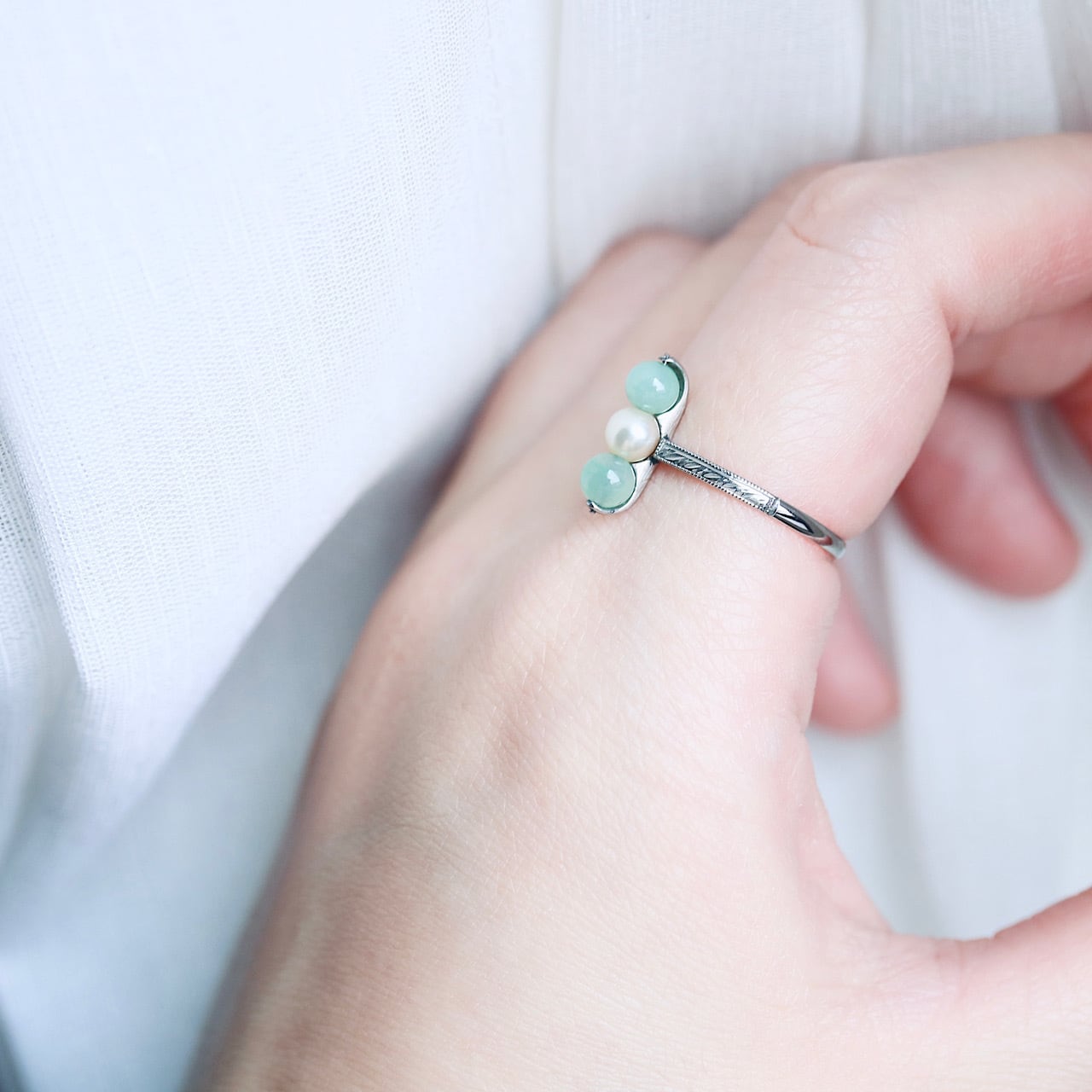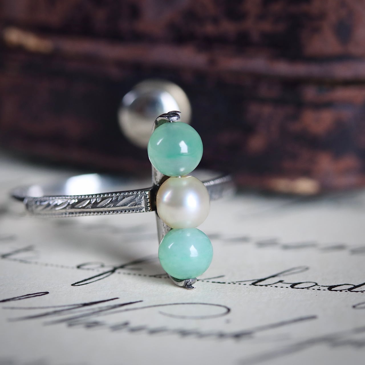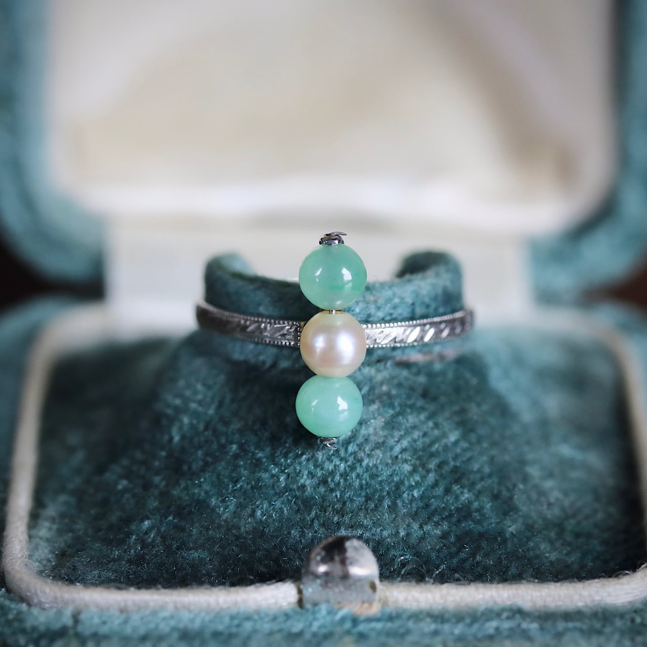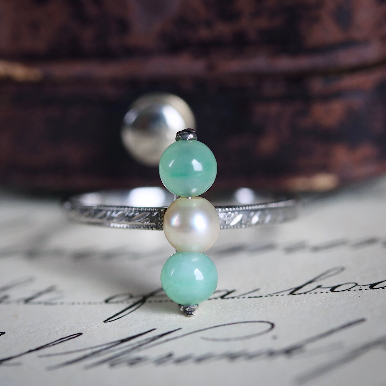 中心に小さなあこや真珠、上下に天然翡翠が並んだ縦長デザインのアールデコリング。