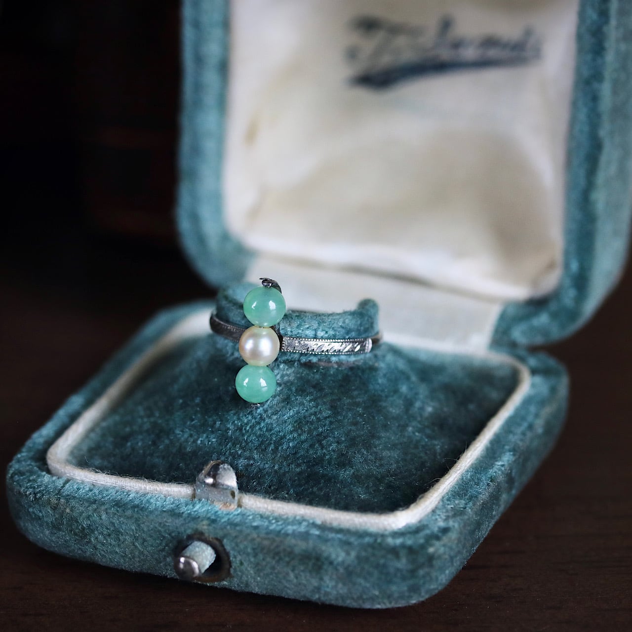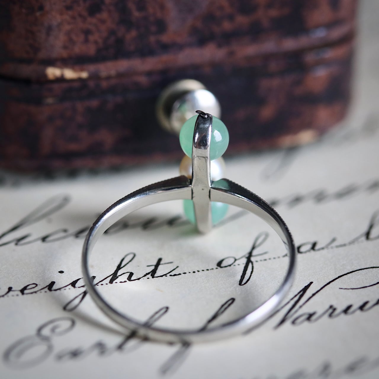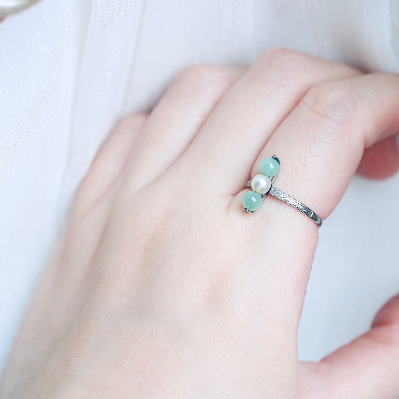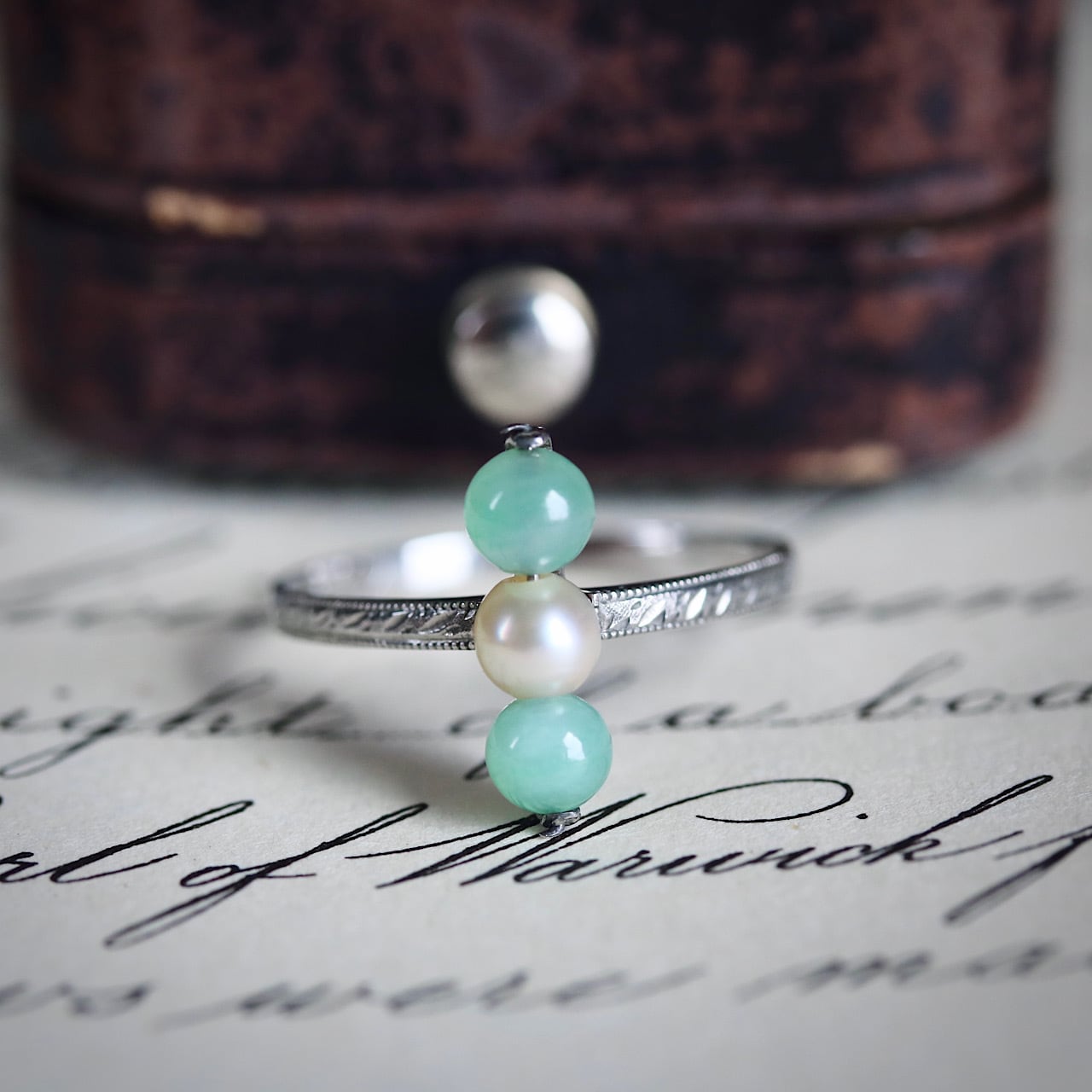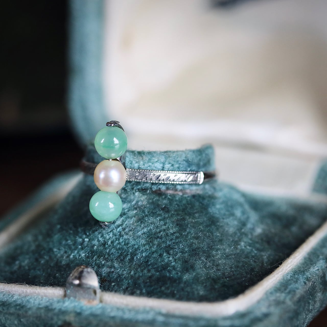 中心に小さなあこや真珠、上下に天然翡翠が並んだ縦長デザインのアールデコリング。