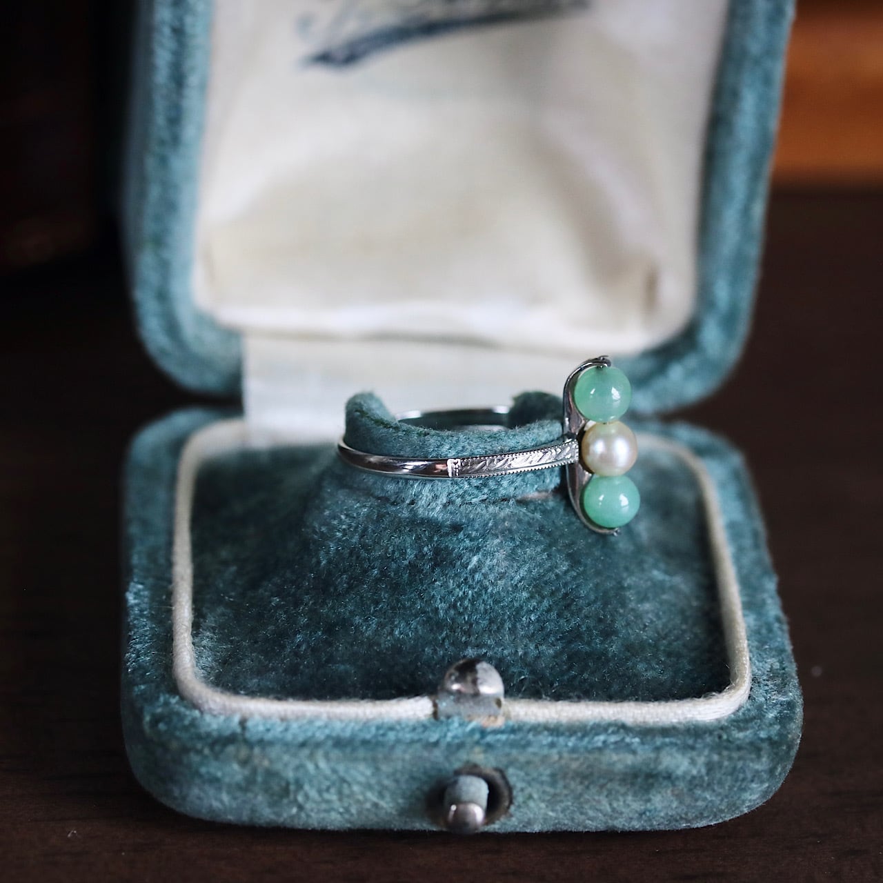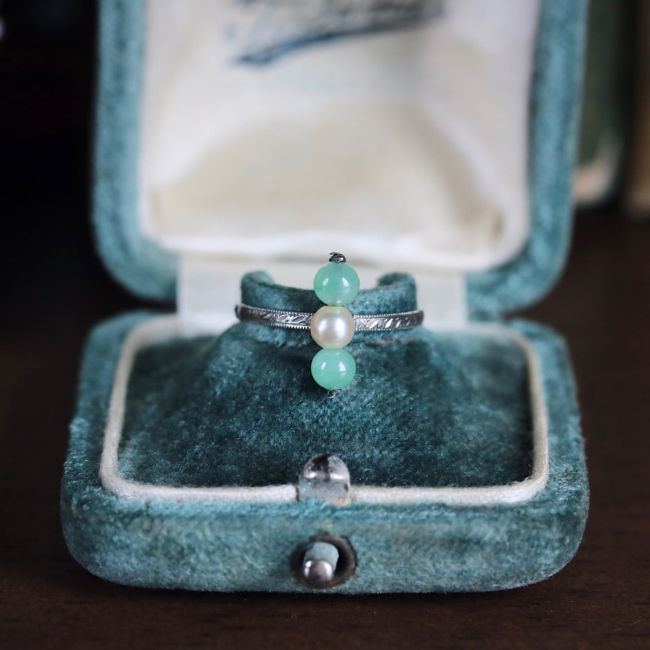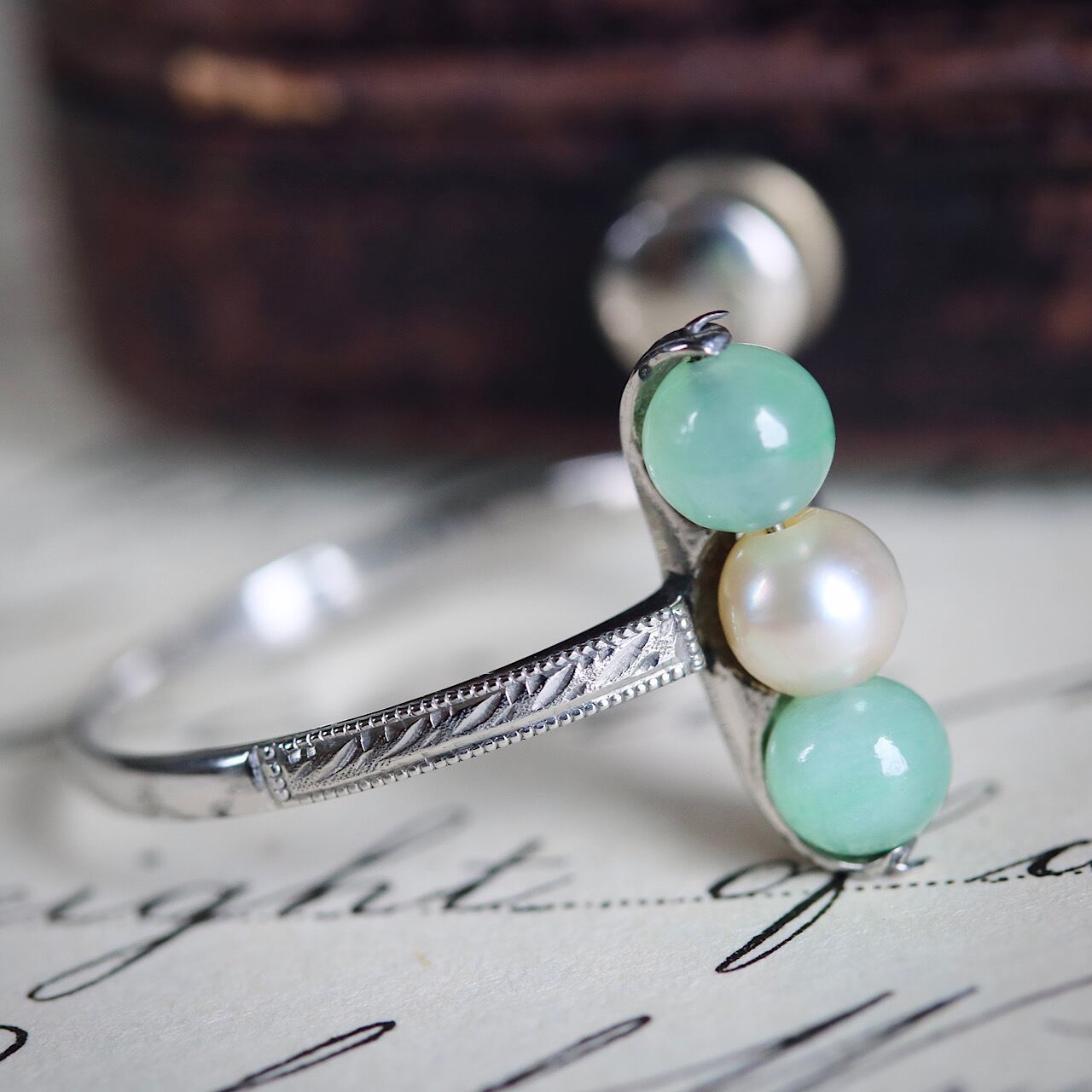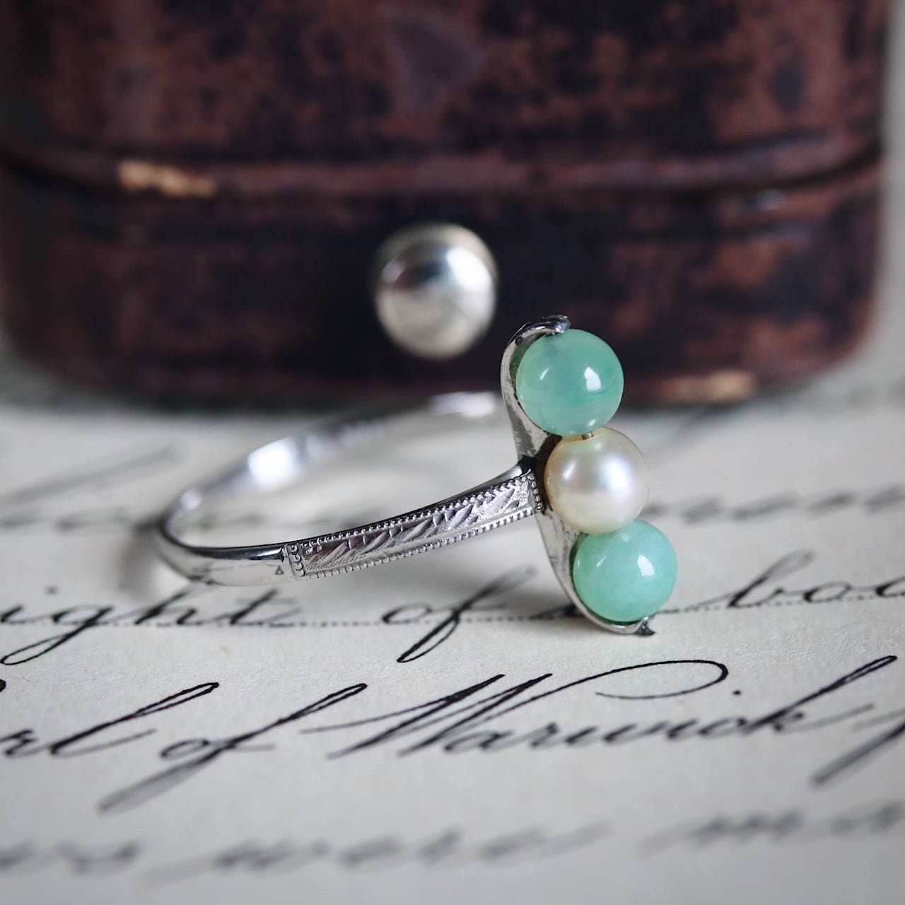 中心に小さなあこや真珠、上下に天然翡翠が並んだ縦長デザインのアールデコリング。