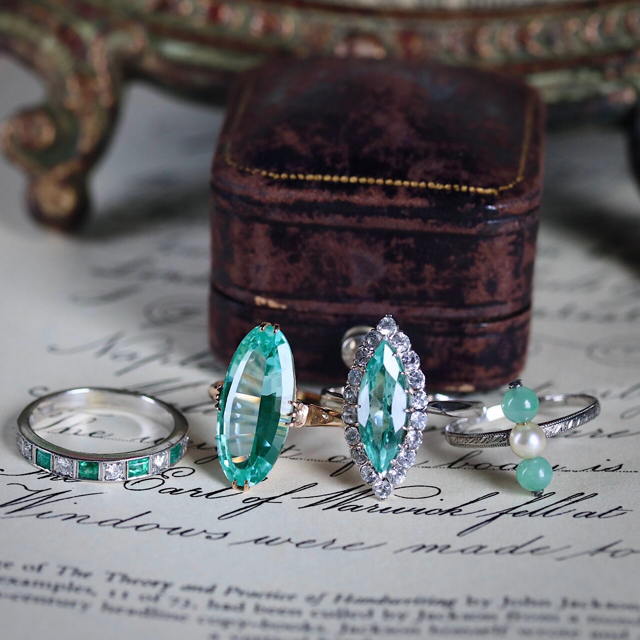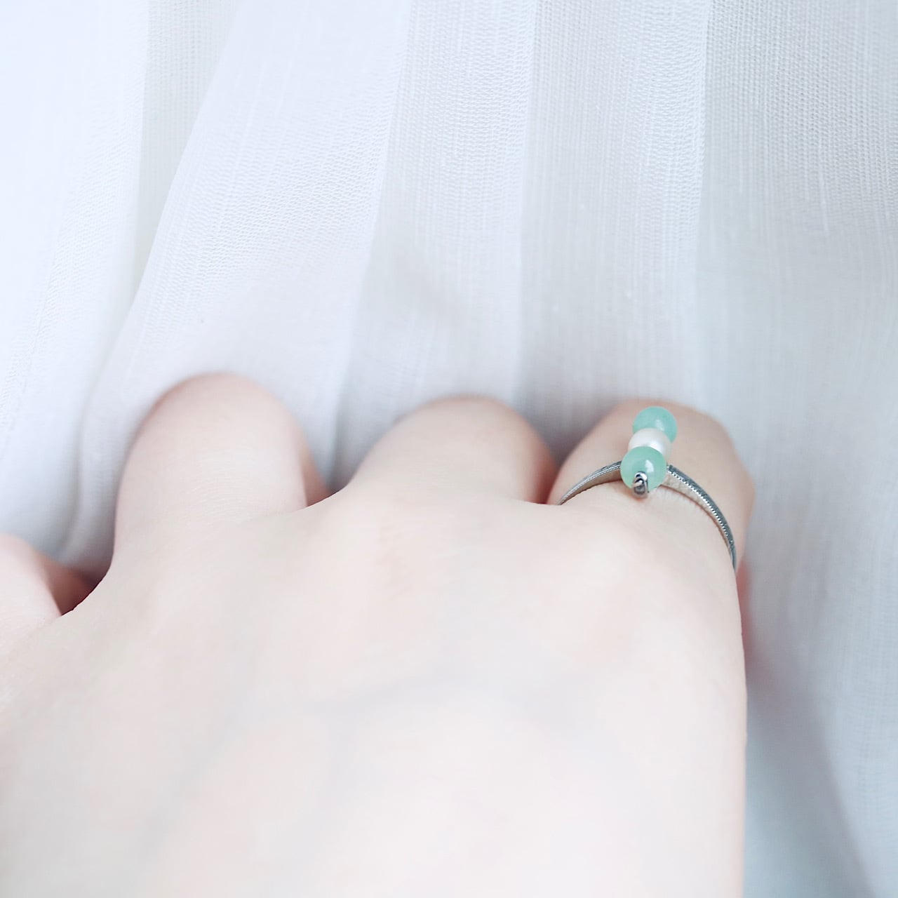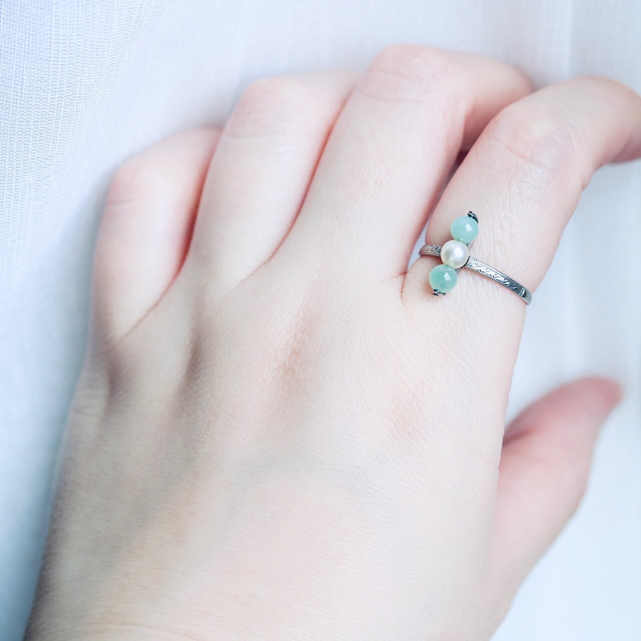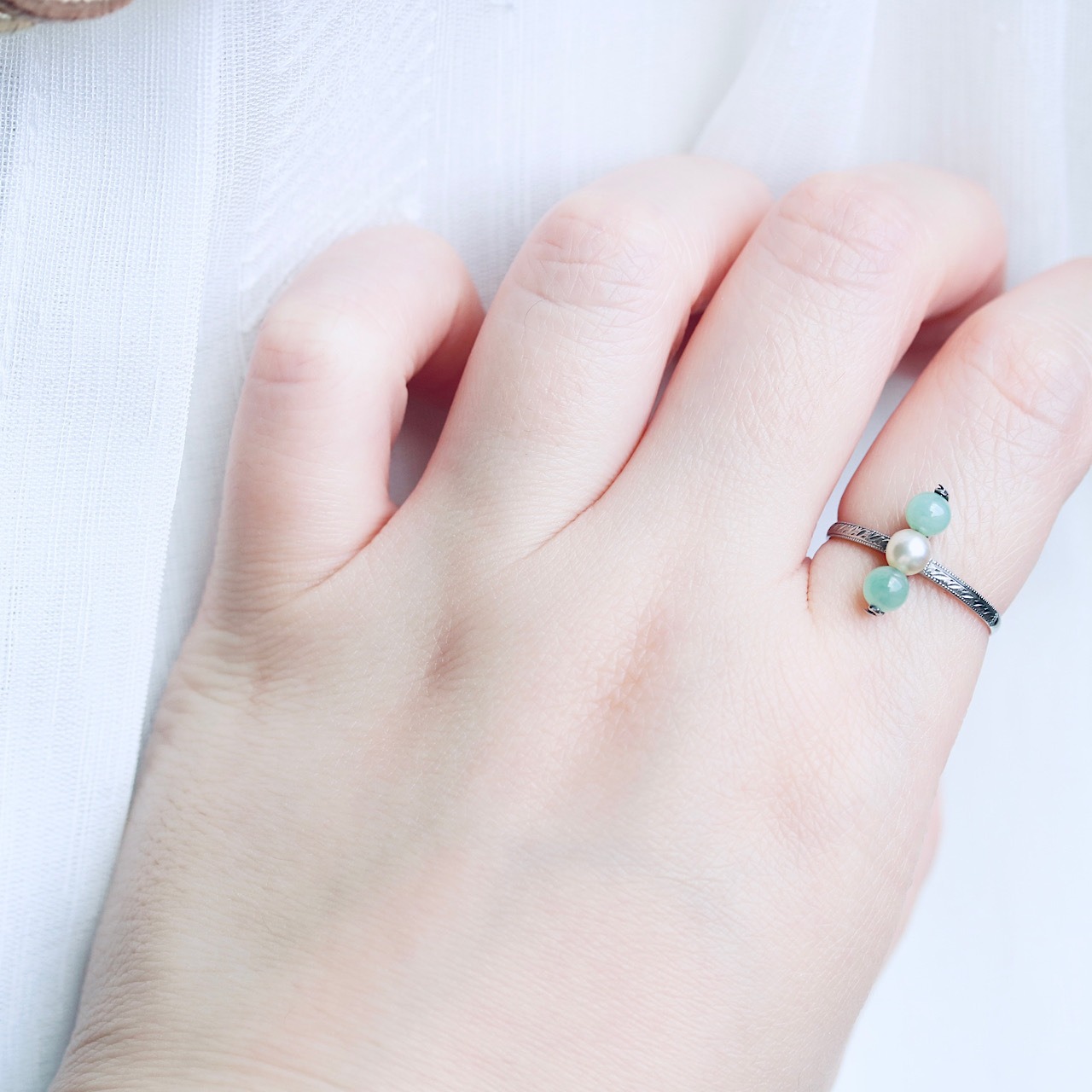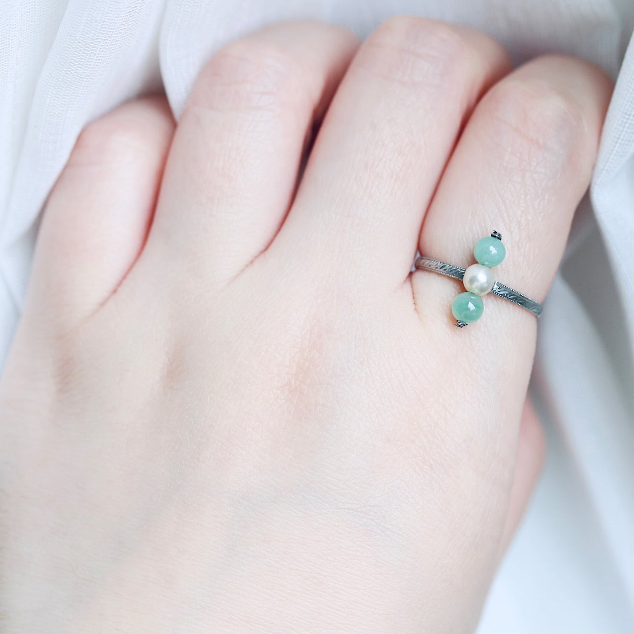 中心に小さなあこや真珠、上下に天然翡翠が並んだ縦長デザインのアールデコリング。
