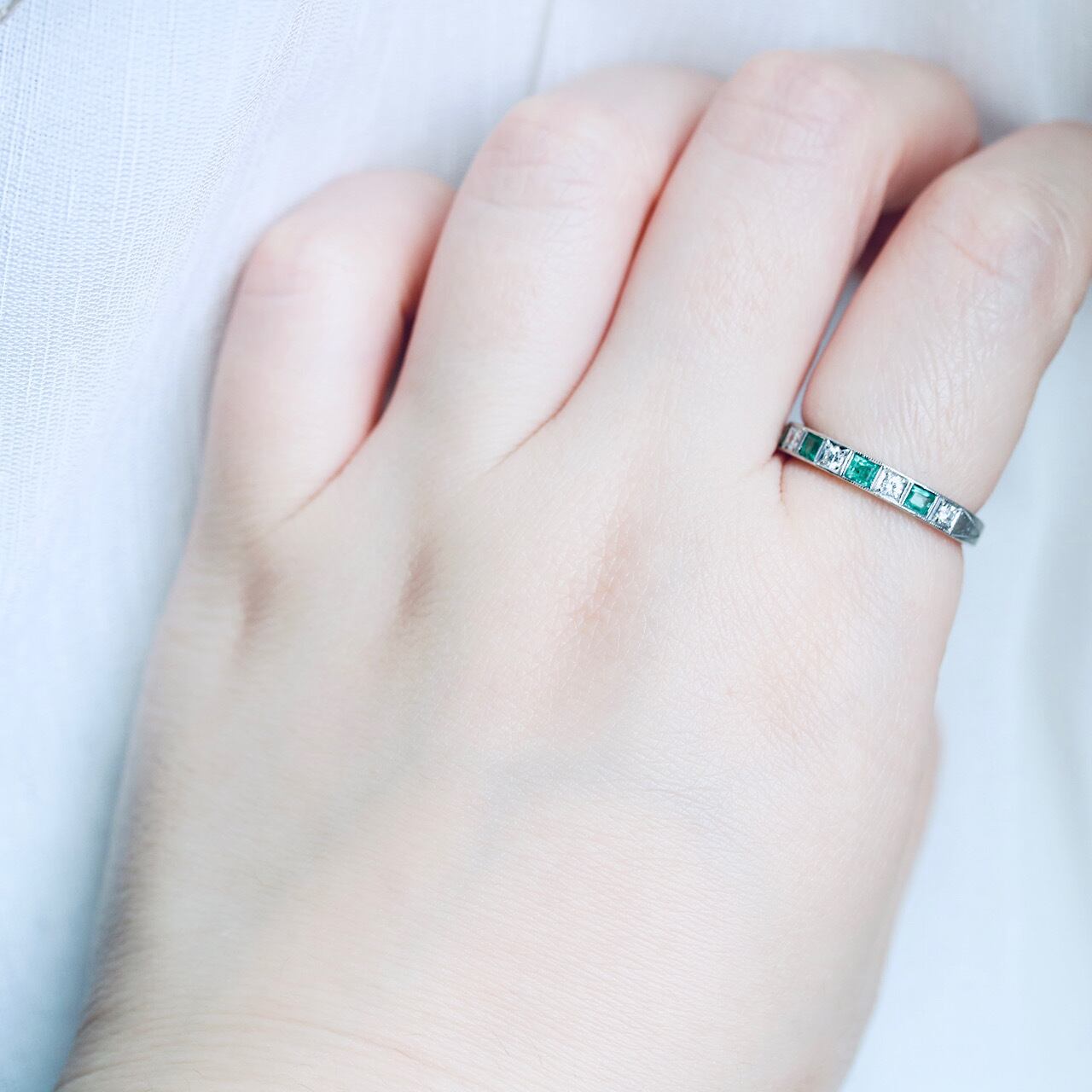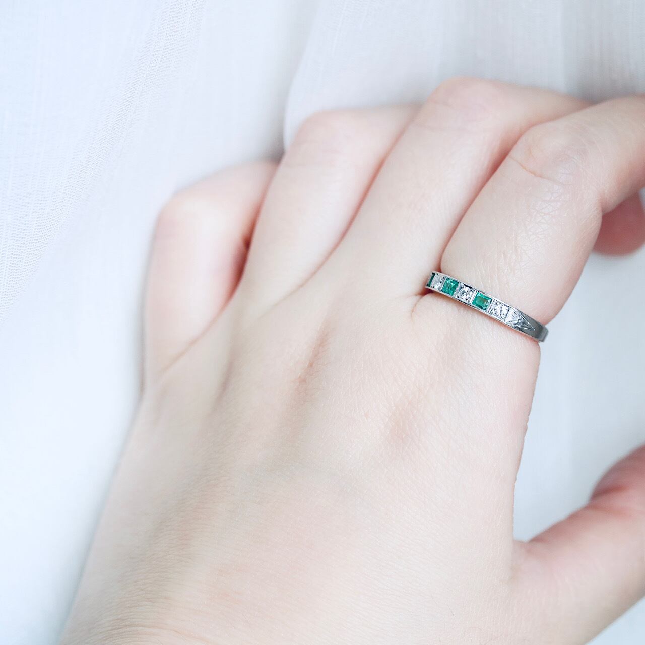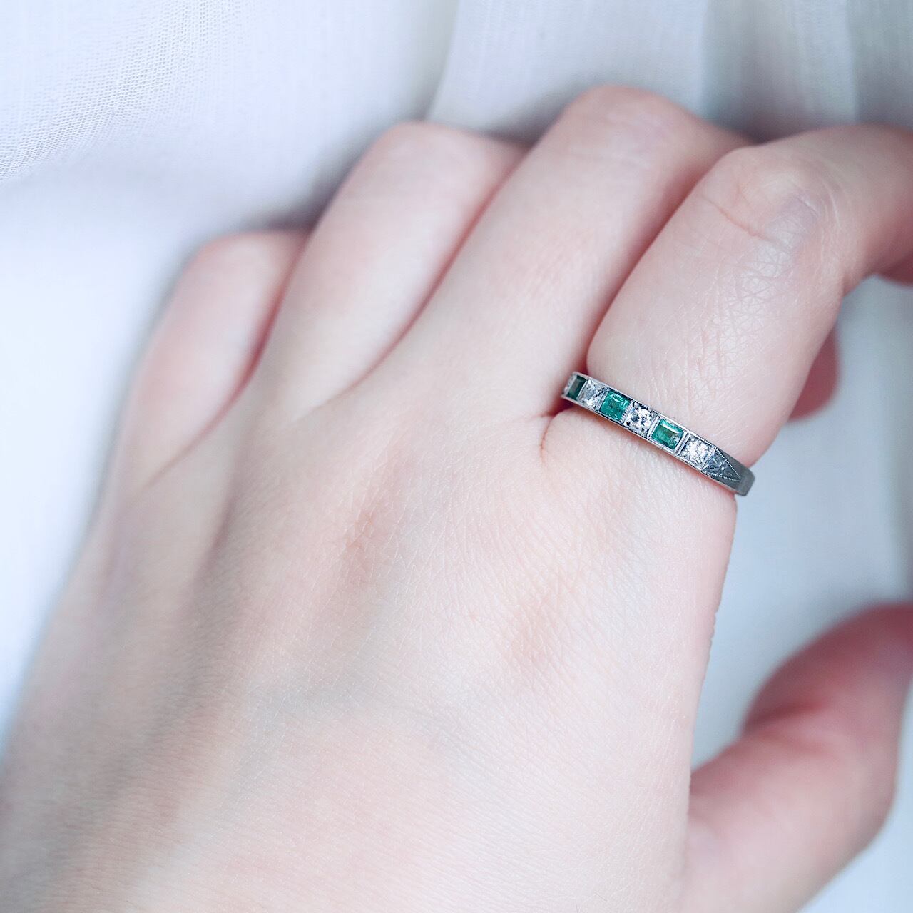 鮮やかなグリーンの天然エメラルドとダイヤモンドが交互に並んだ、贅沢な一文字リング。