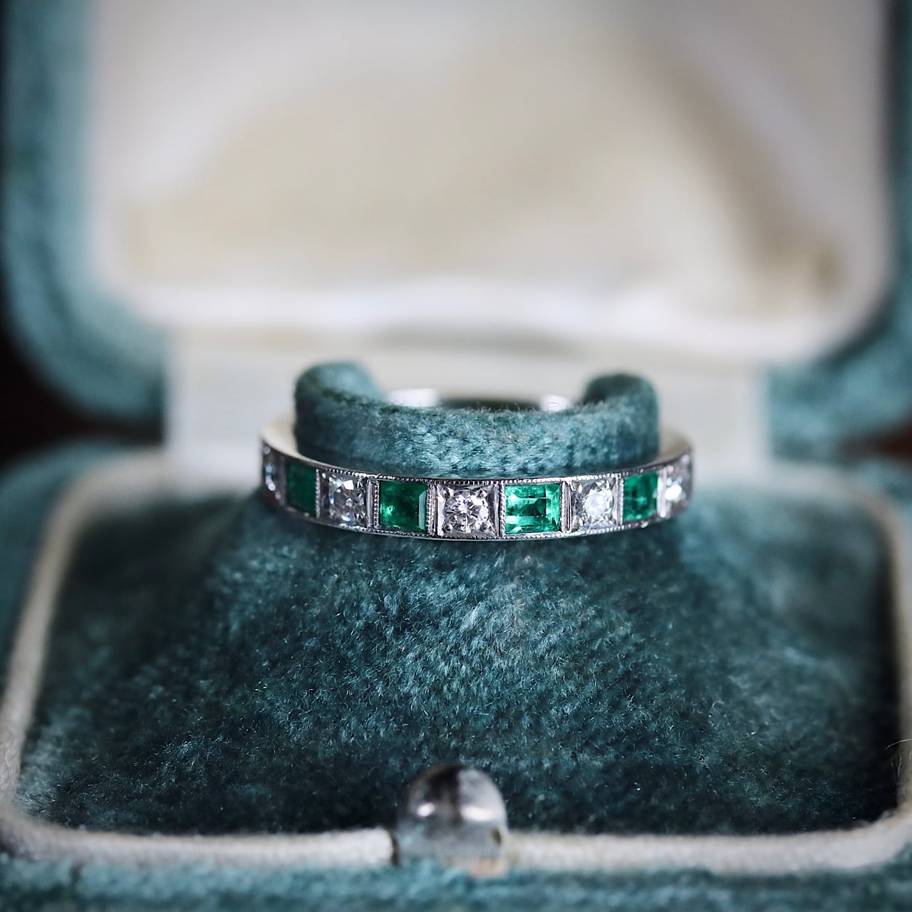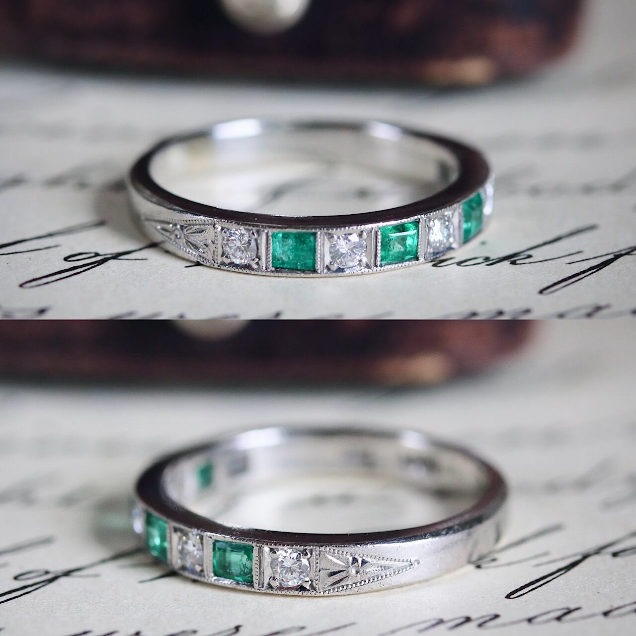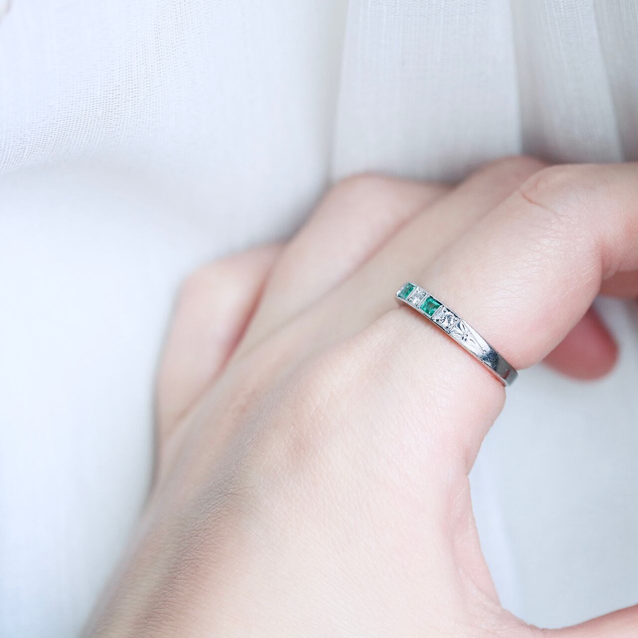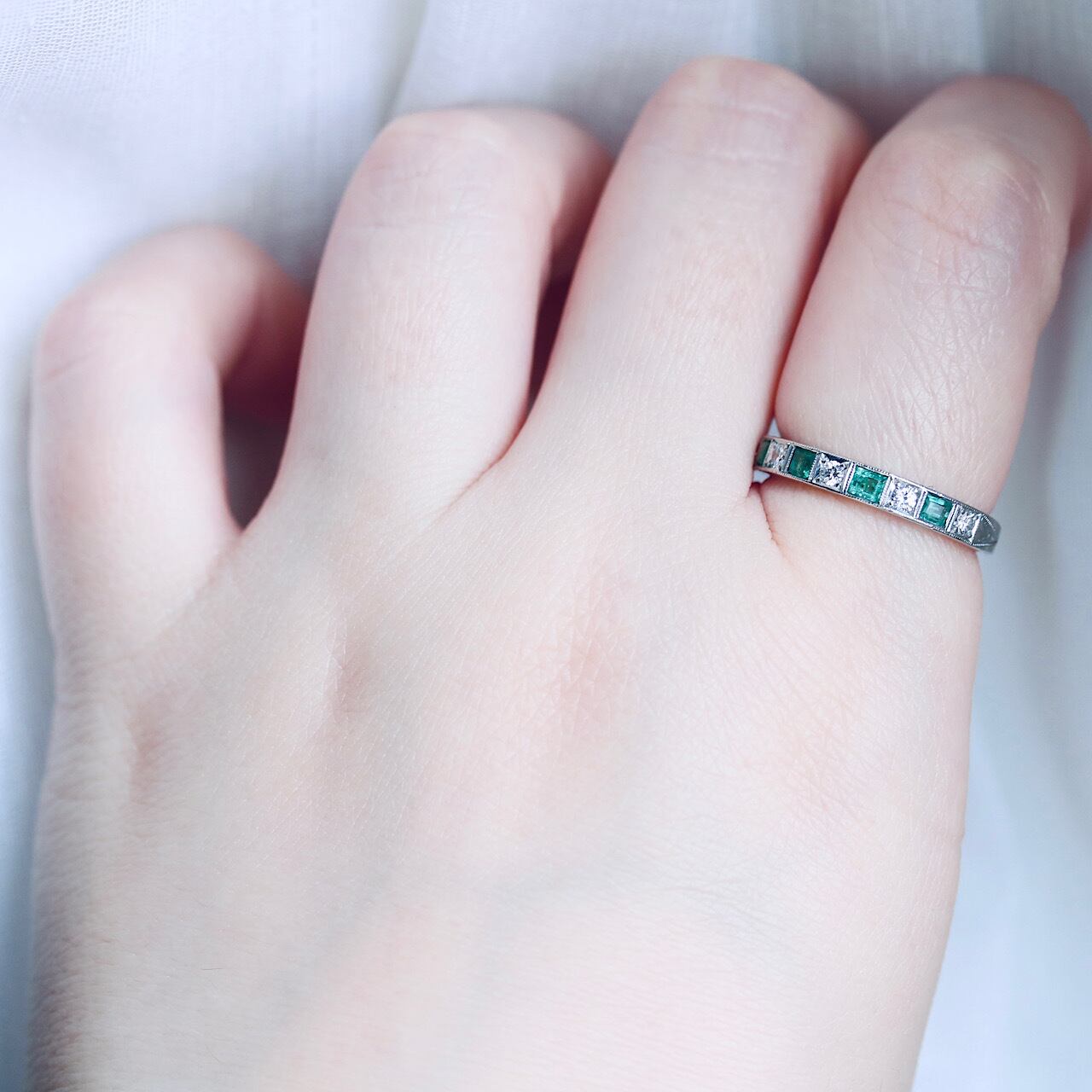 鮮やかなグリーンの天然エメラルドとダイヤモンドが交互に並んだ、贅沢な一文字リング。