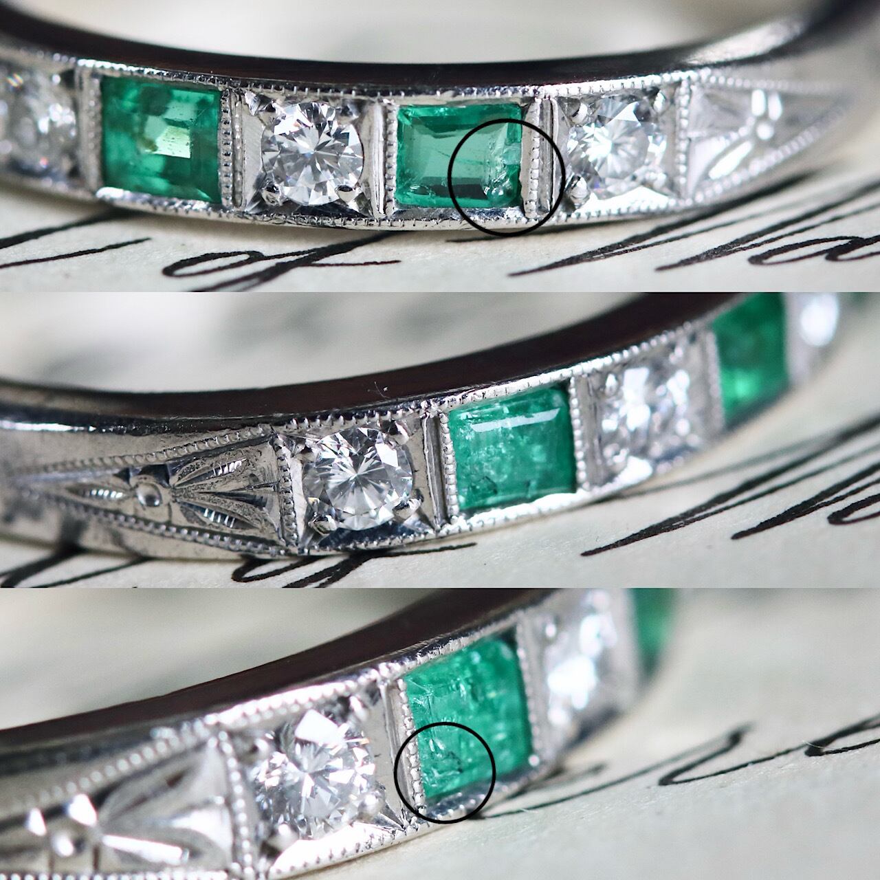 エメラルドに僅かな欠けが見られますが、小さく肉眼では分からない程度のものです。(写真◯印)