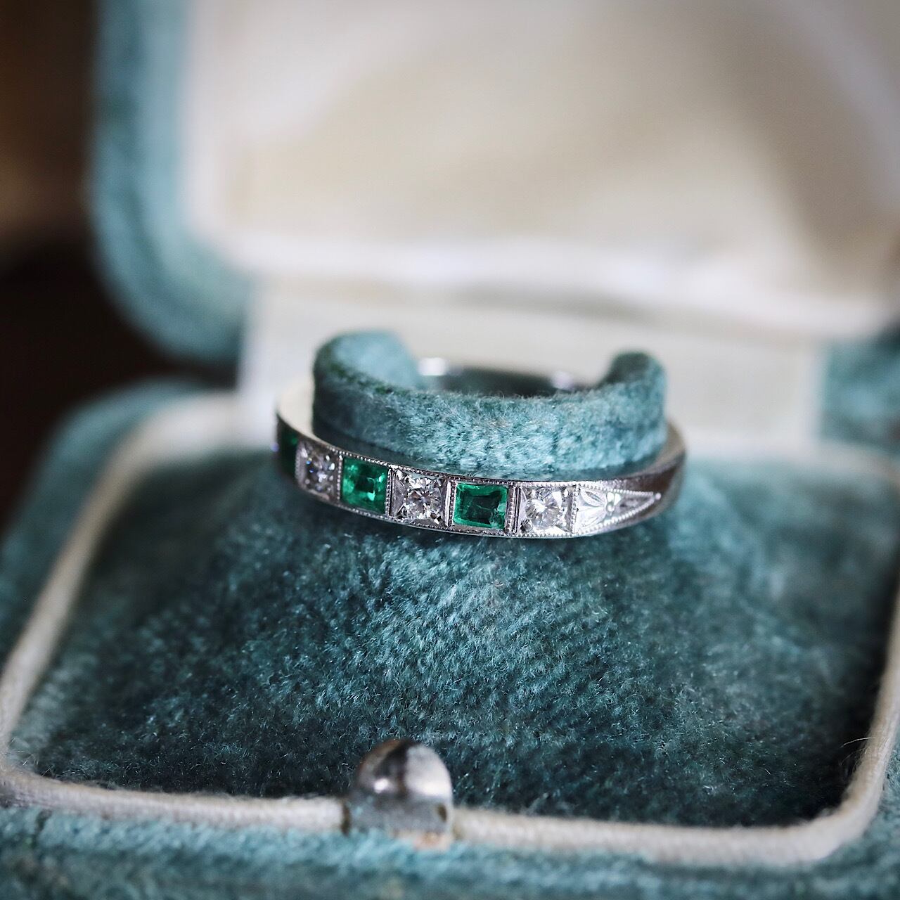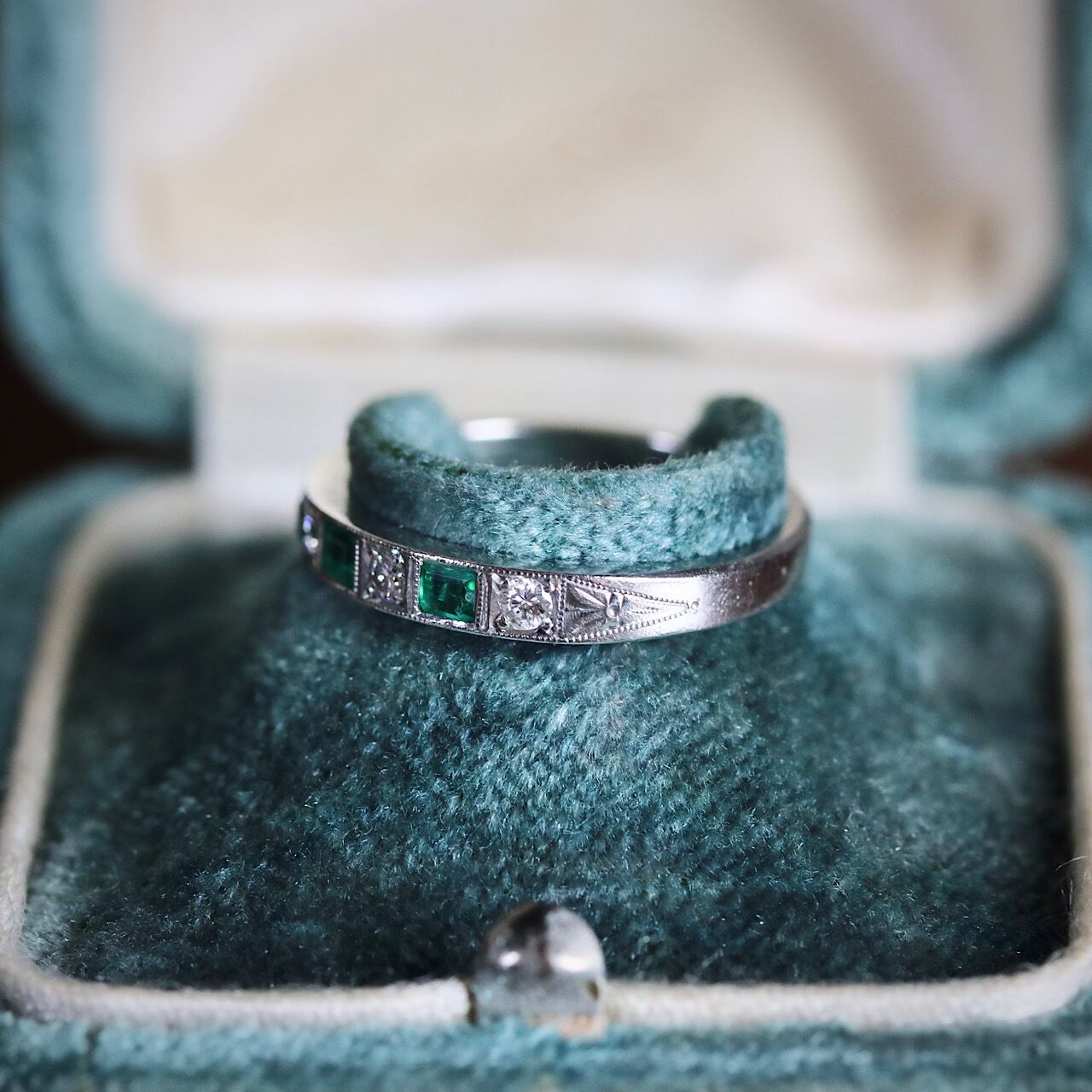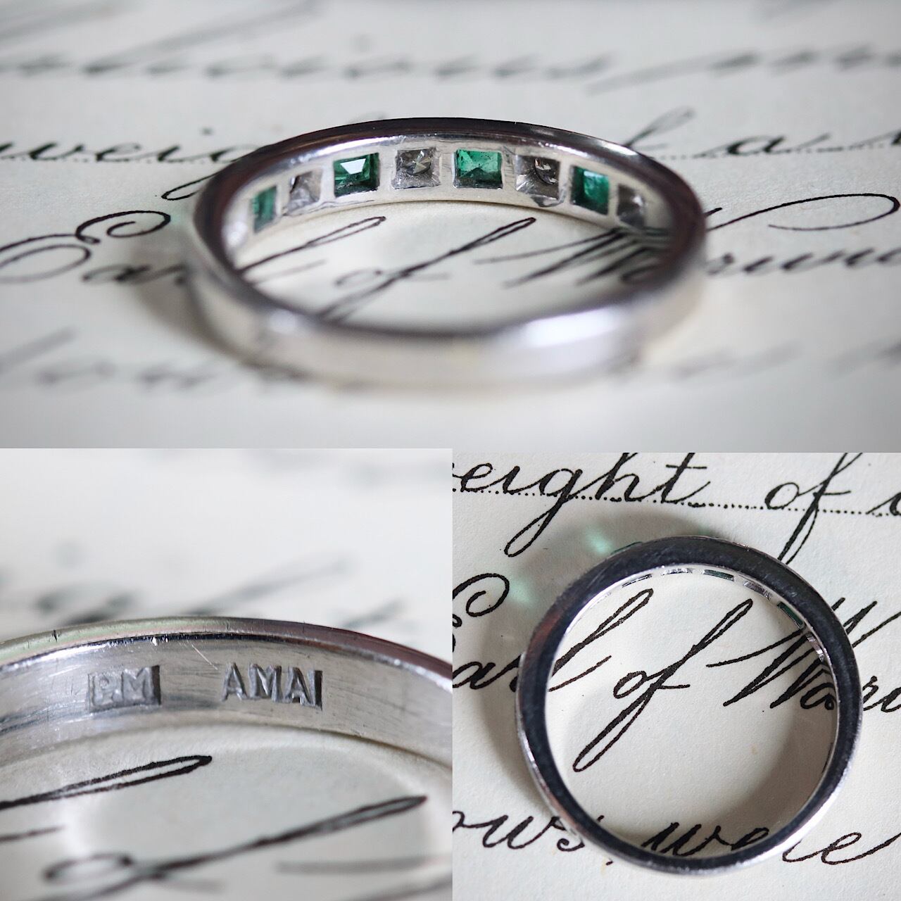 尼伊製 P.M刻印 プラチナ 天然エメラルド 天然ダイヤモンド アールデコ 一文字 ハーフエタニティ ヴィンテージリング ソーティングメモ付