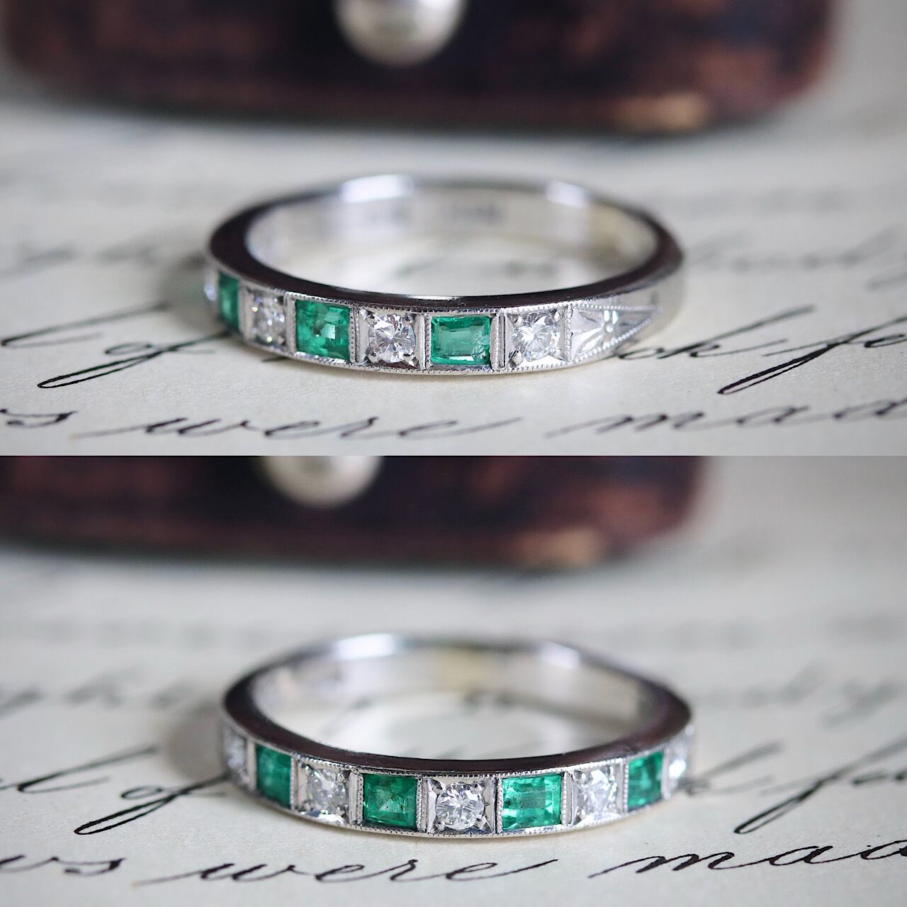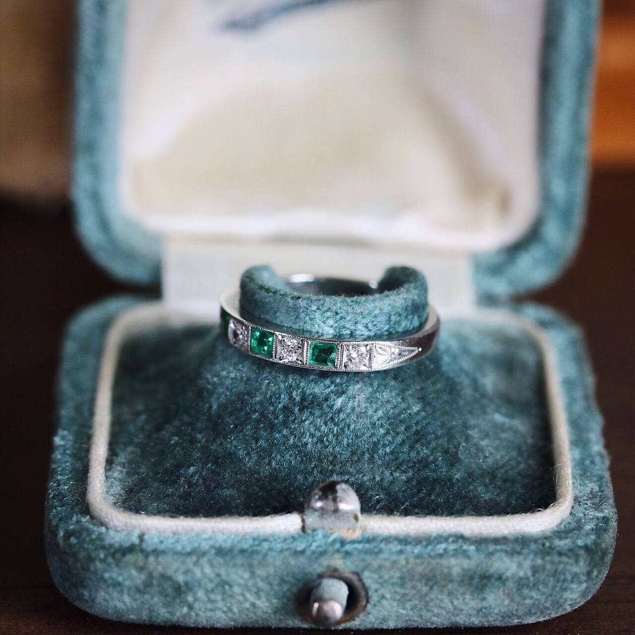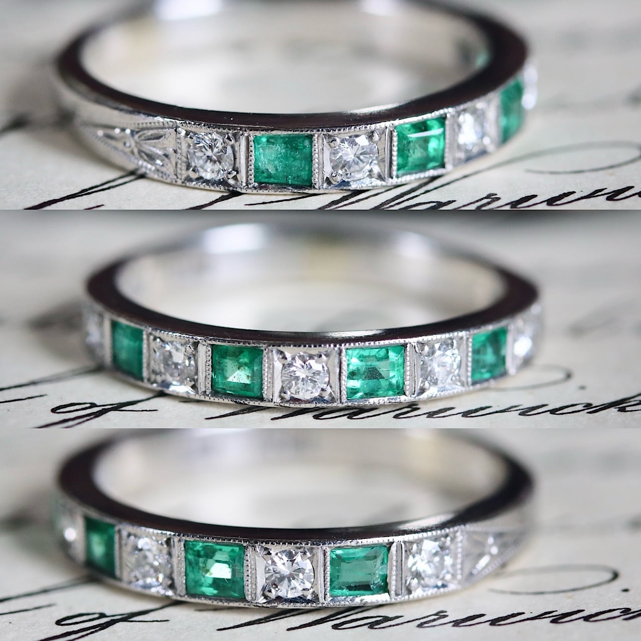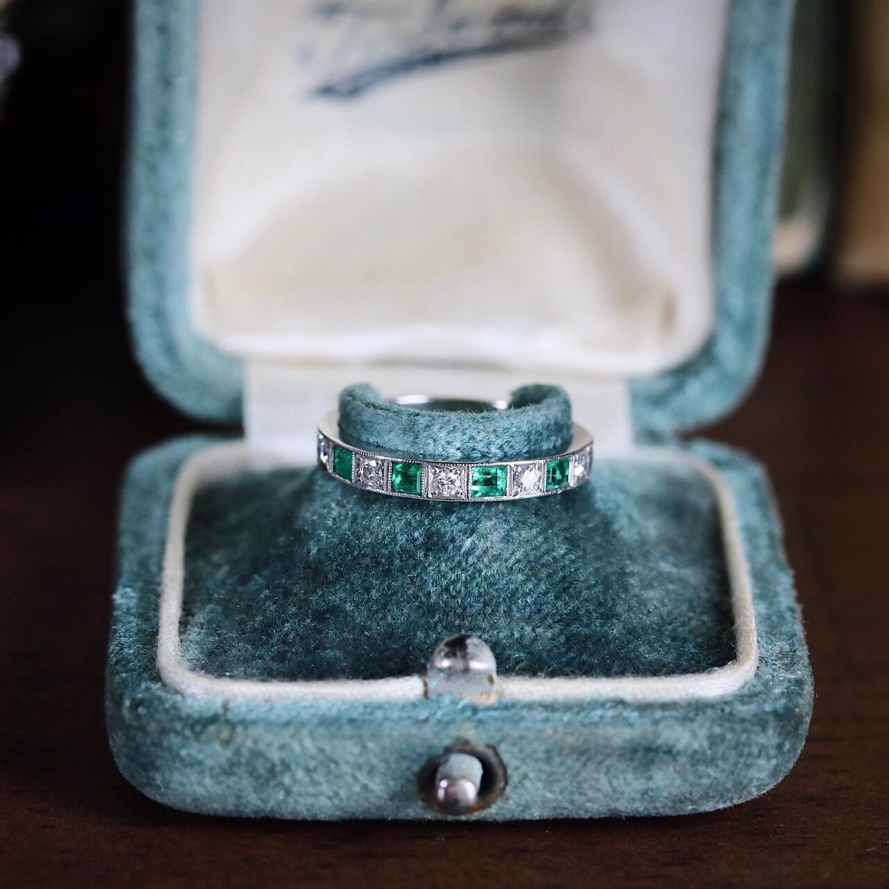 尼伊製 P.M刻印 プラチナ 天然エメラルド 天然ダイヤモンド アールデコ 一文字 ハーフエタニティ ヴィンテージリング ソーティングメモ付