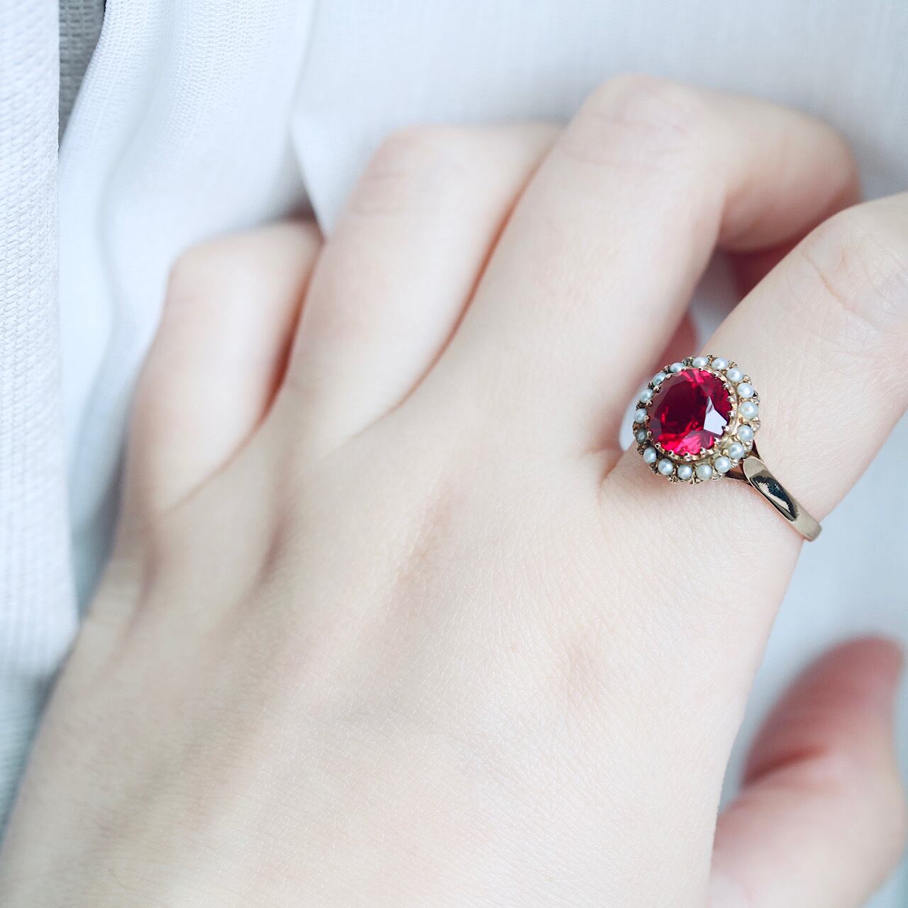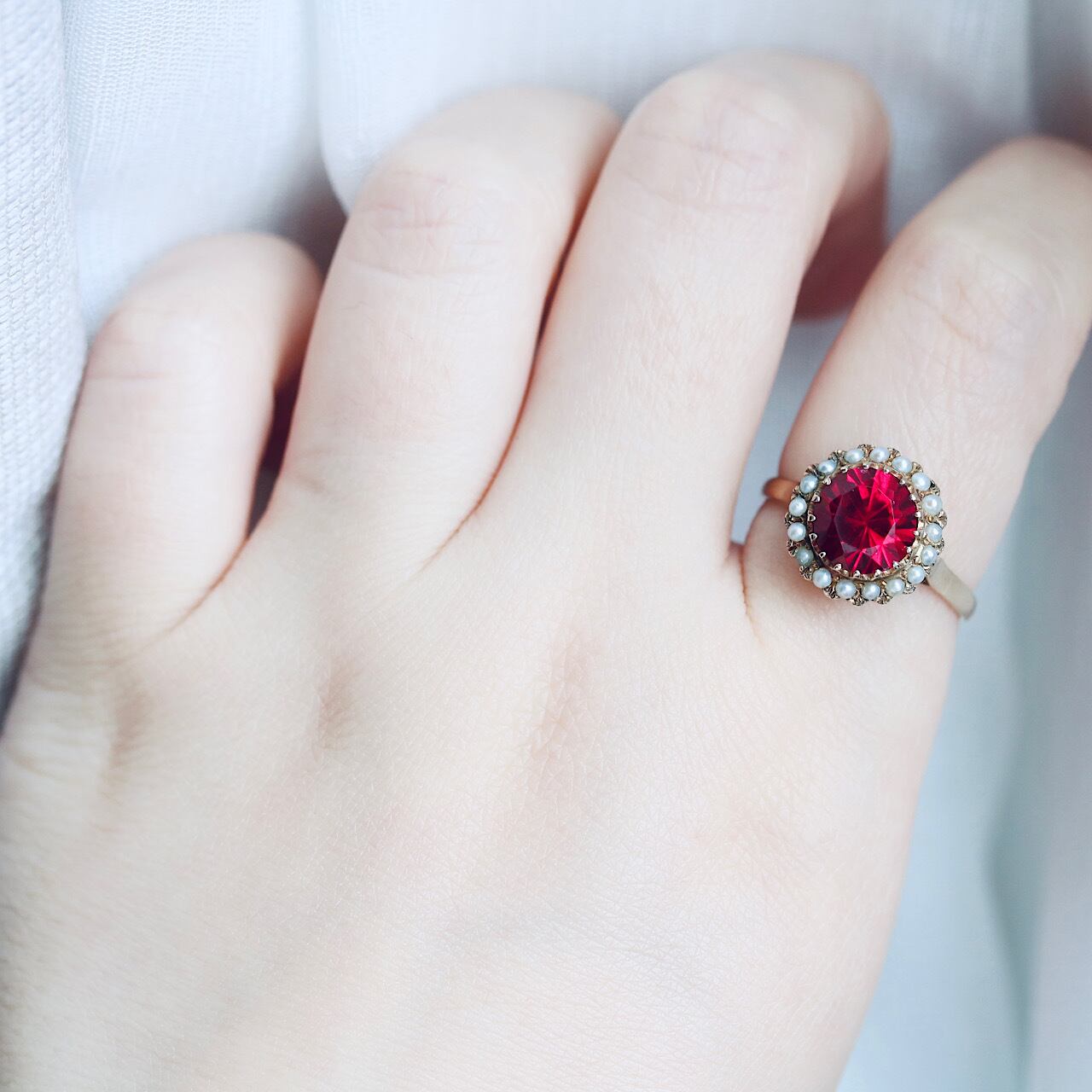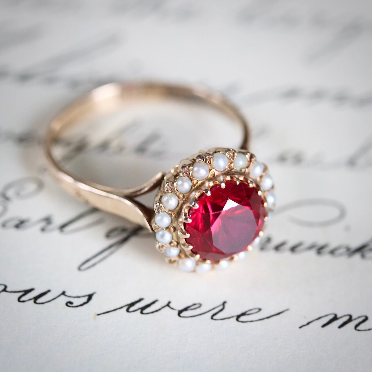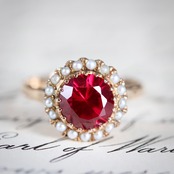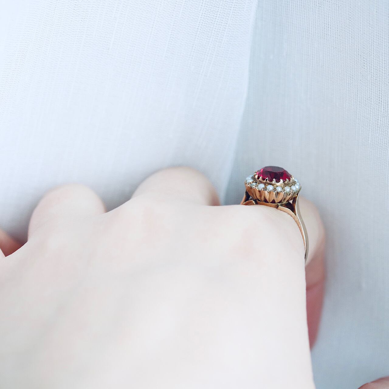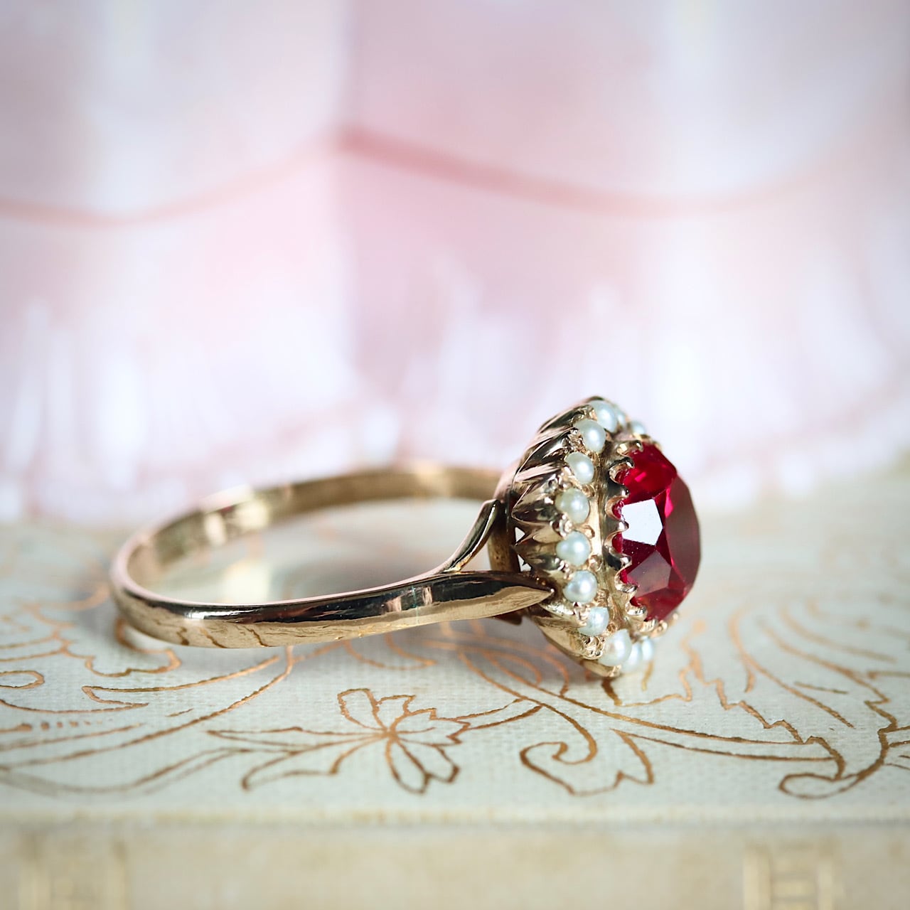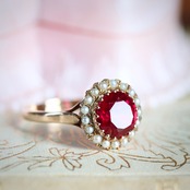 合成ルビーに芥子パールが取り巻いた、乙女心くすぐる可愛らしいヴィンテージリング。