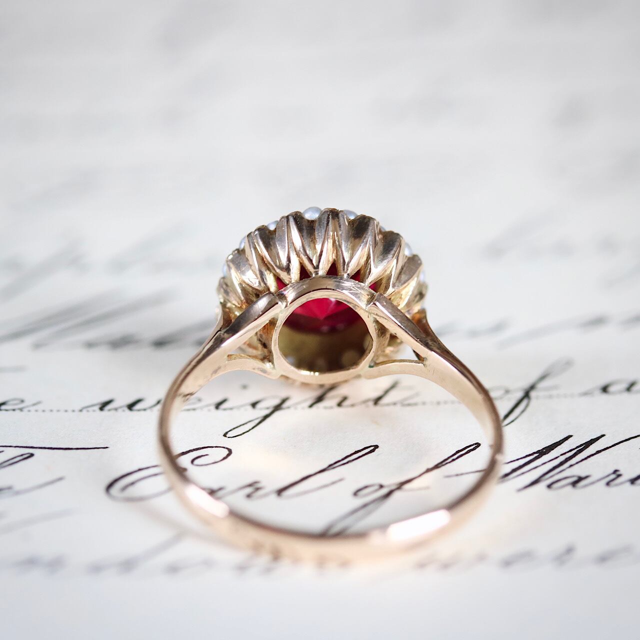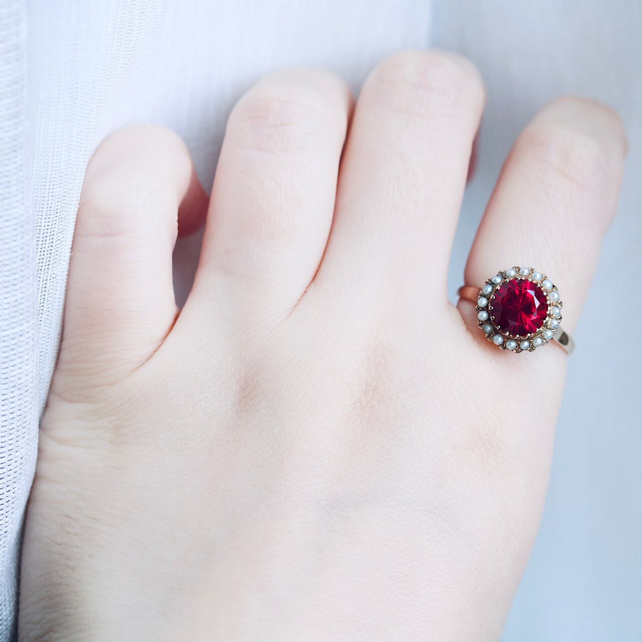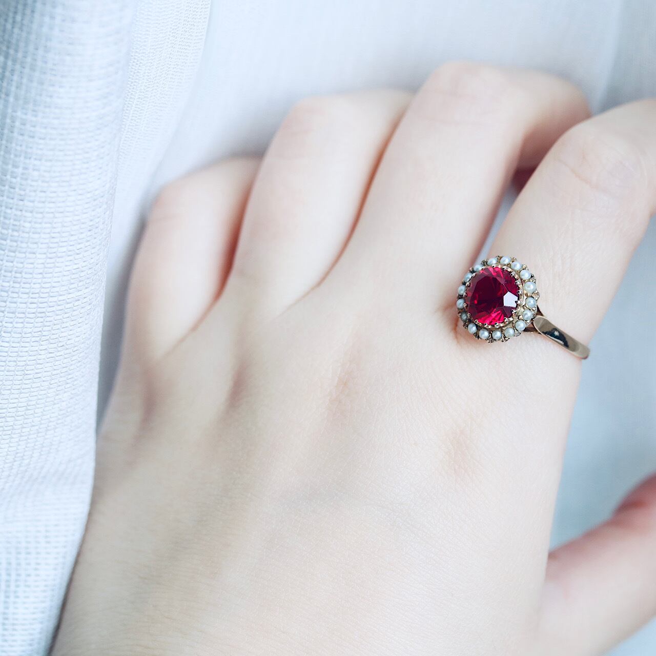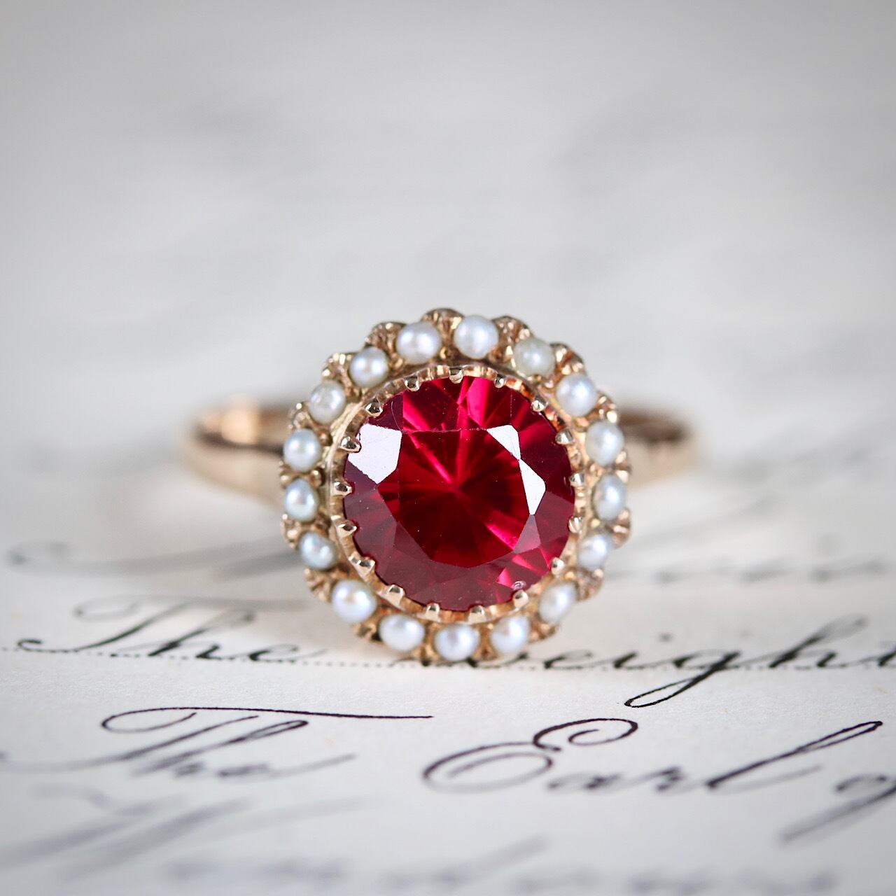 合成ルビーに芥子パールが取り巻いた、乙女心くすぐる可愛らしいヴィンテージリング。