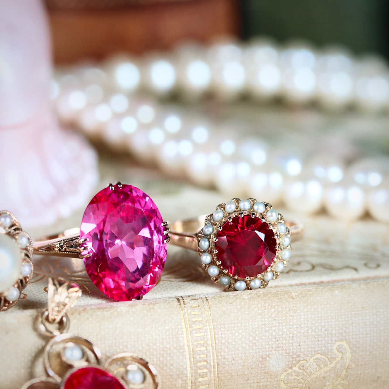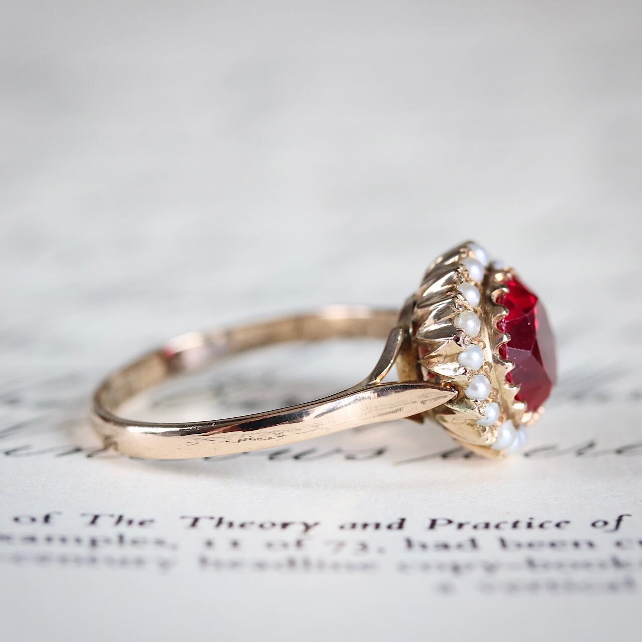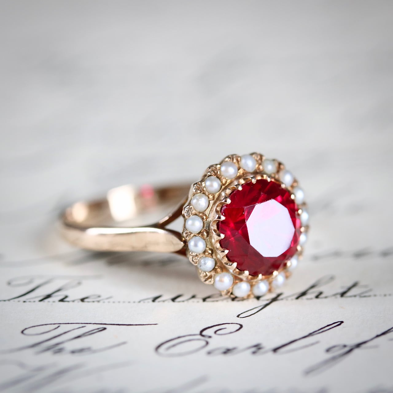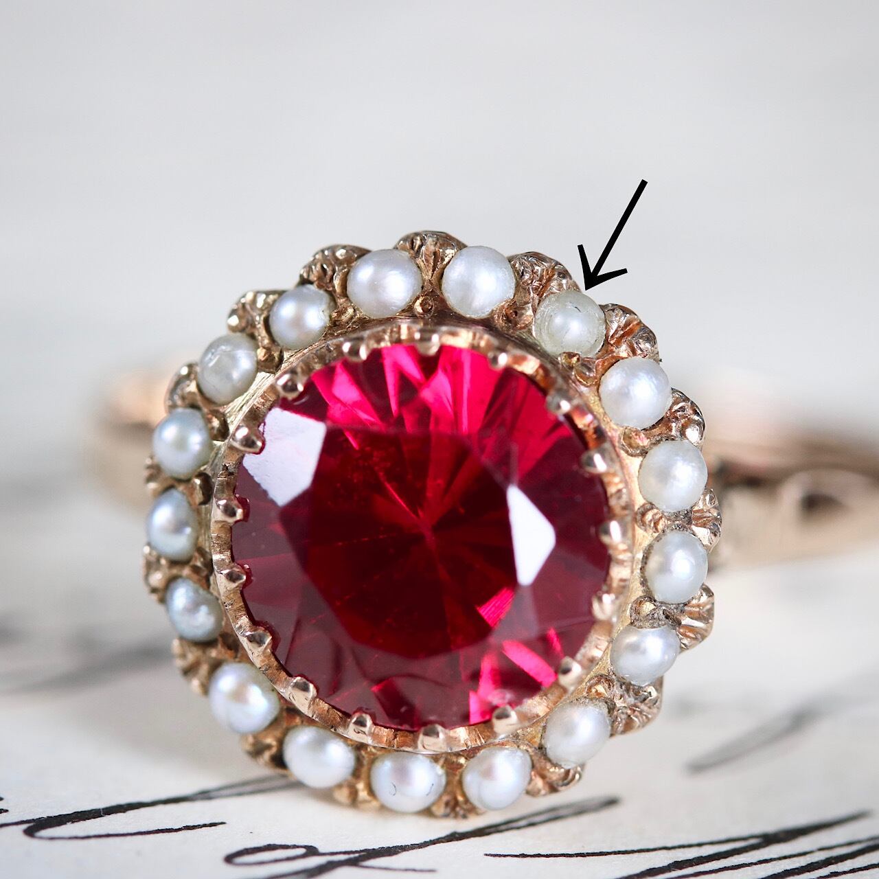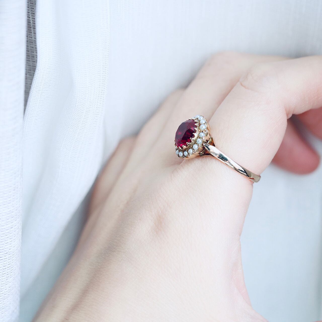 合成ルビーに芥子パールが取り巻いた、乙女心くすぐる可愛らしいヴィンテージリング。
