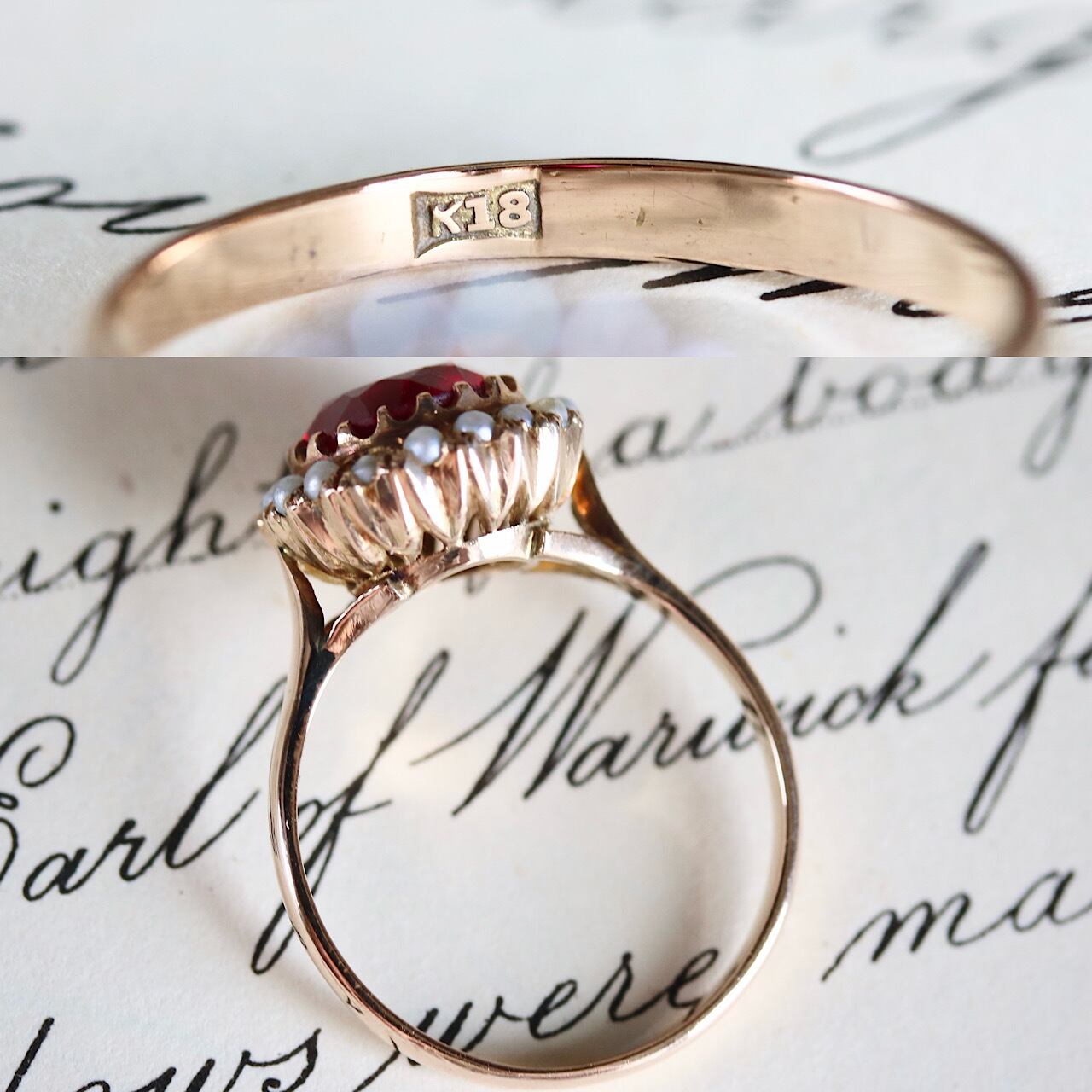 K18 真っ赤な合成ルビー 芥子パール取り巻きのヴィンテージリング。