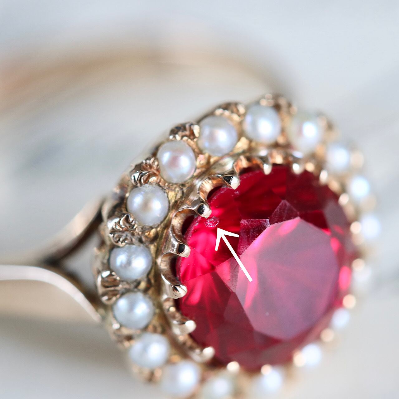 ※芥子パールや合成ルビーに僅かな傷が見られますが、肉眼では分からない程度のもので美観に影響はありません。(写真矢印参照)