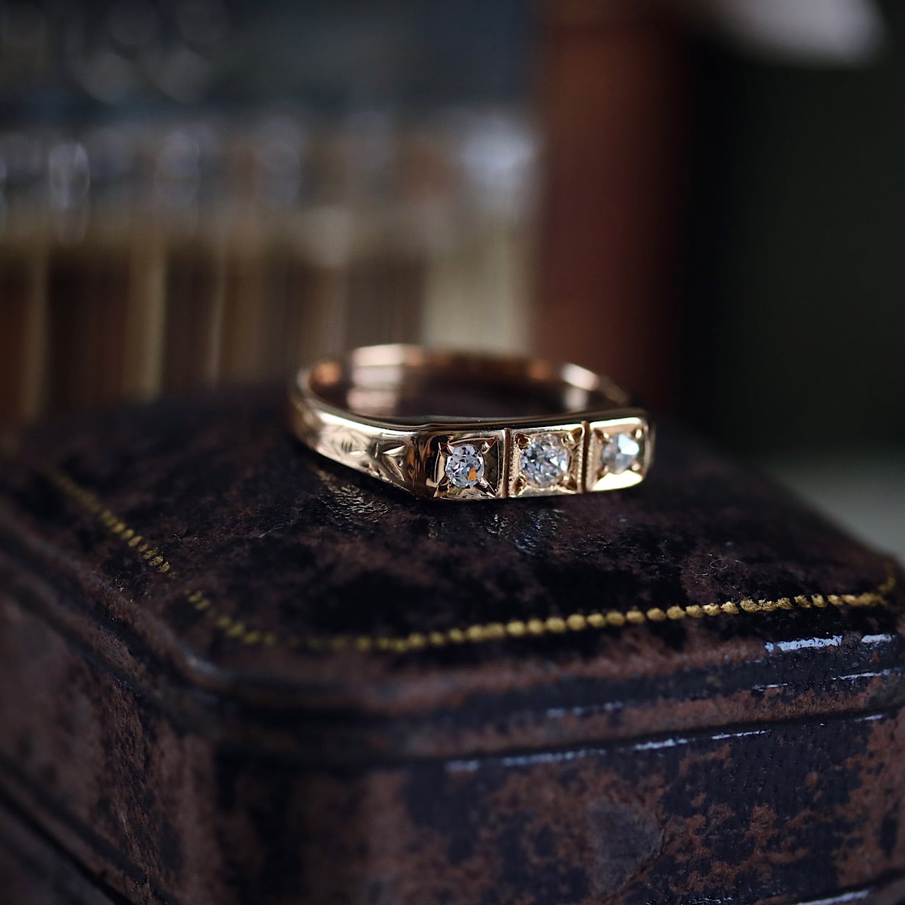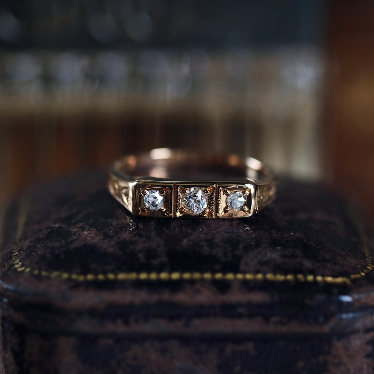 3石のアンティークダイヤモンドが煌めくスリーストーンデザインのヴィンテージリング。