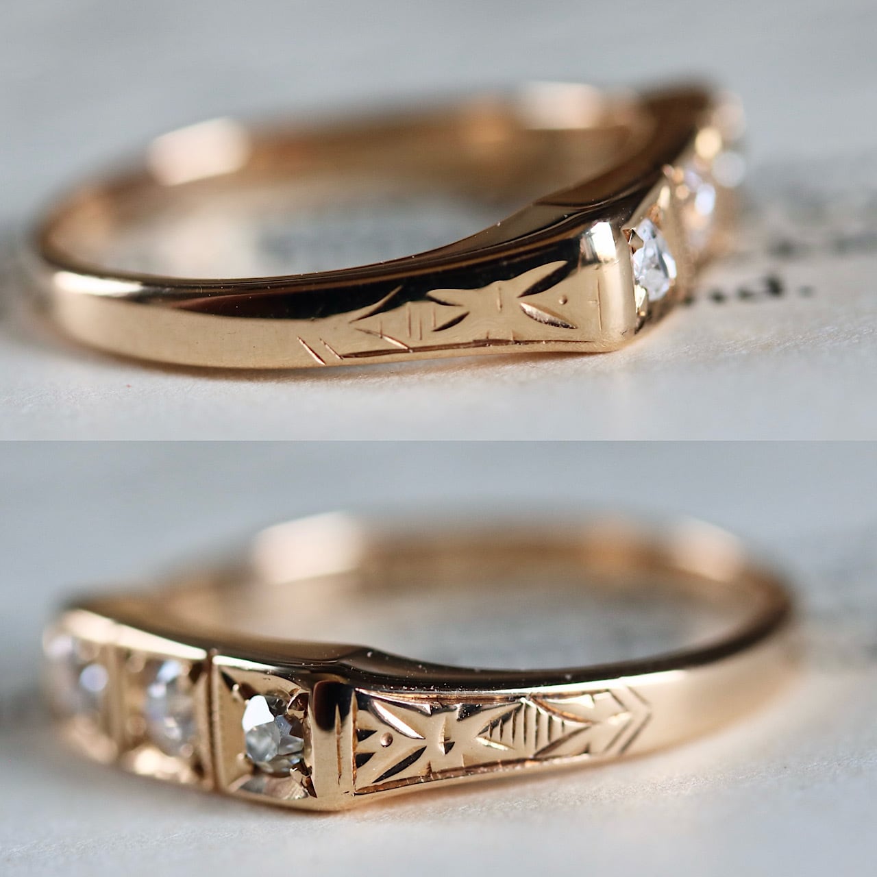 K18 オールドヨーロピアンカットダイヤモンド スリーストーン アールデコリング。