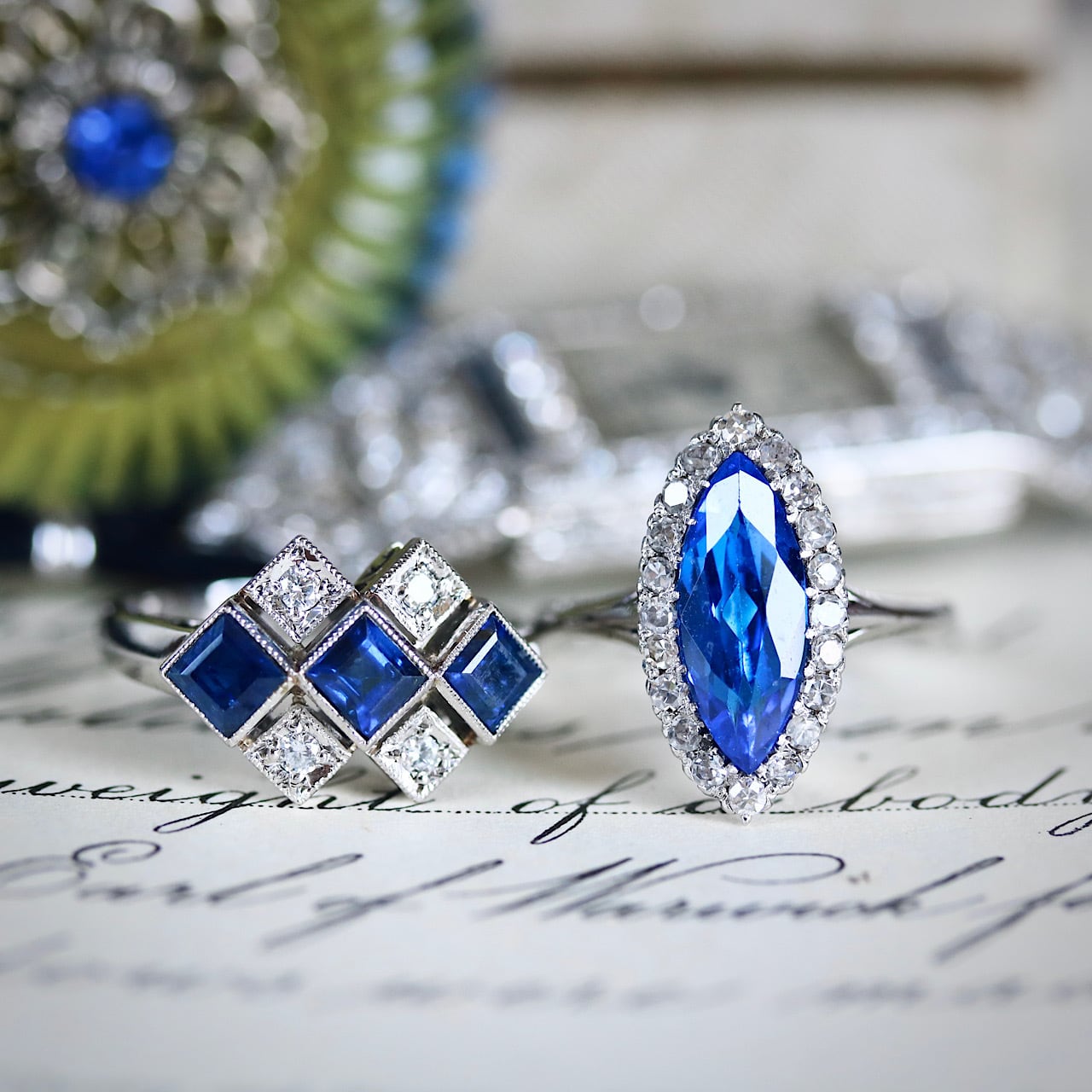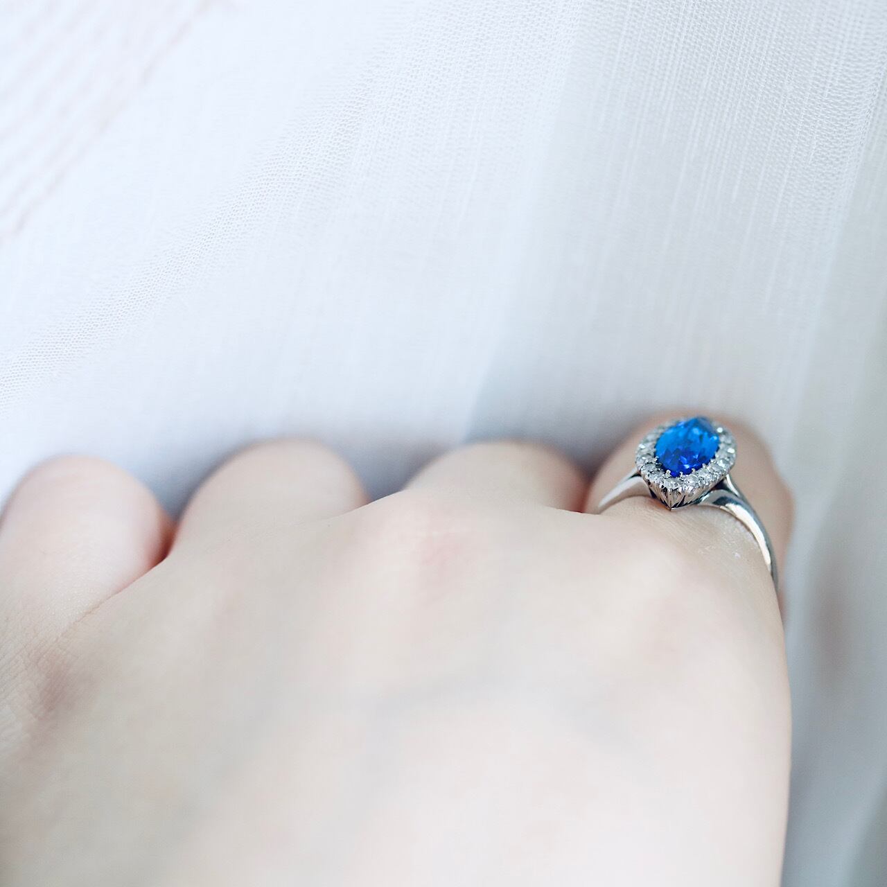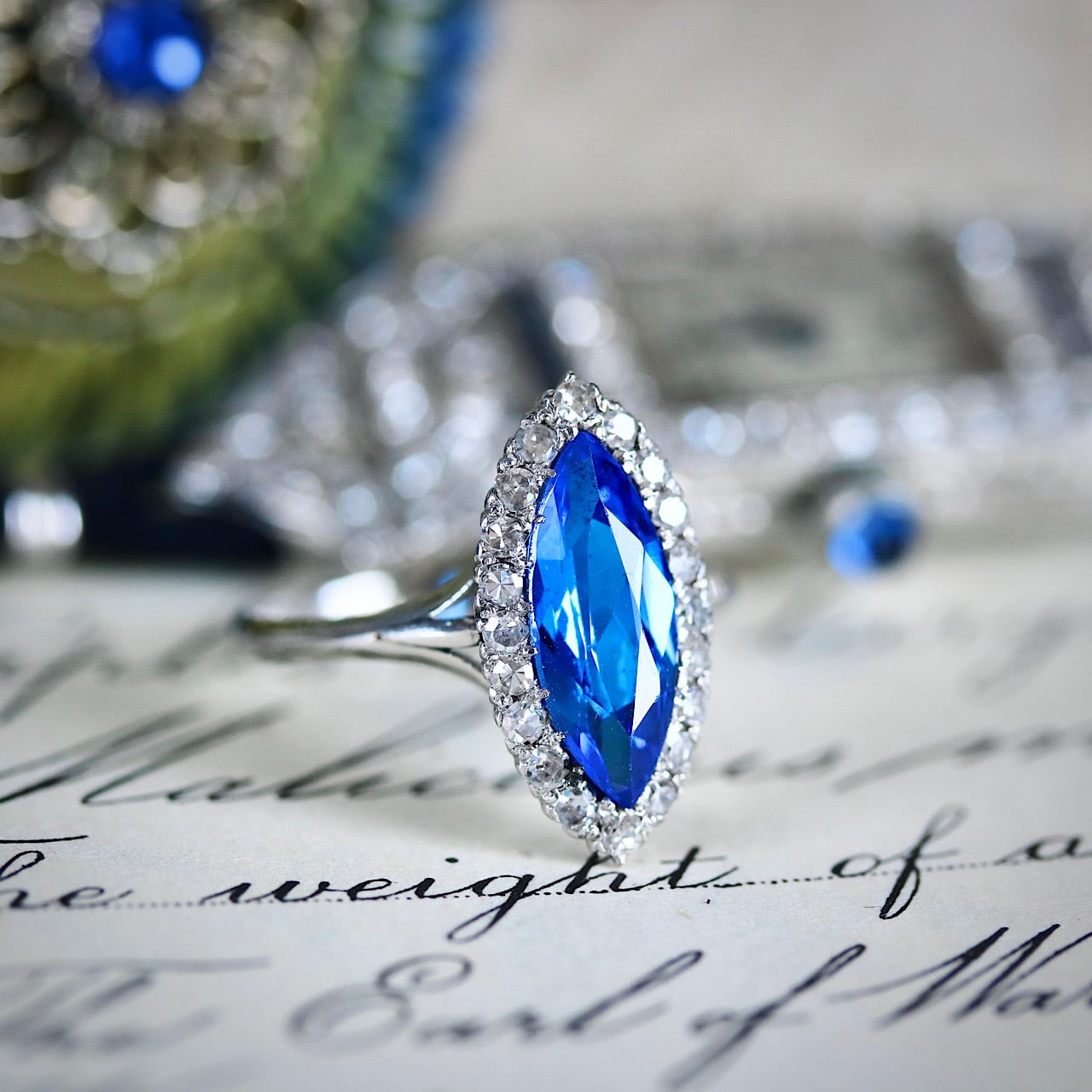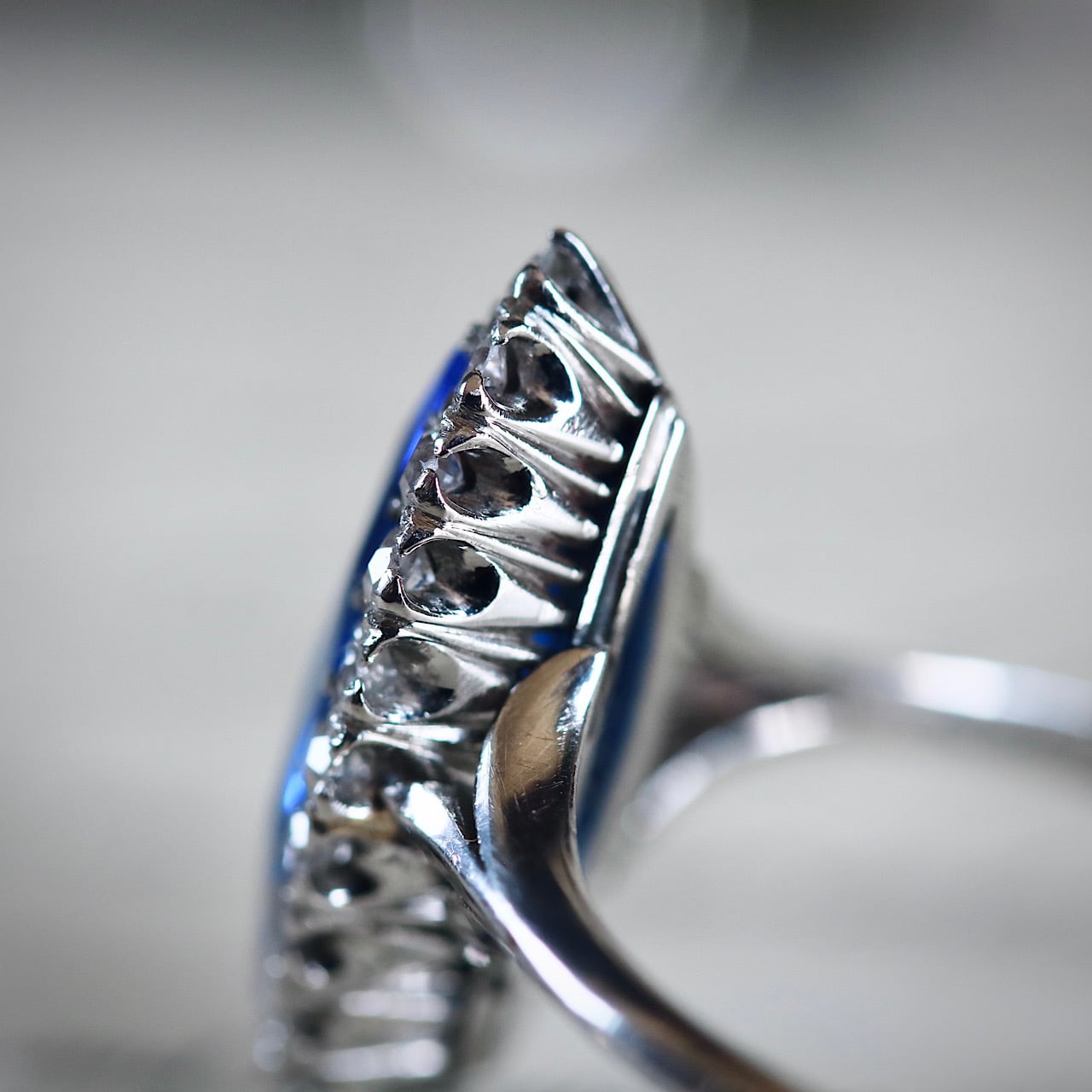 ロイヤルブルーの合成スピネルにダイヤモンドが取り巻いた、高級感のある美しいヴィンテージリング。