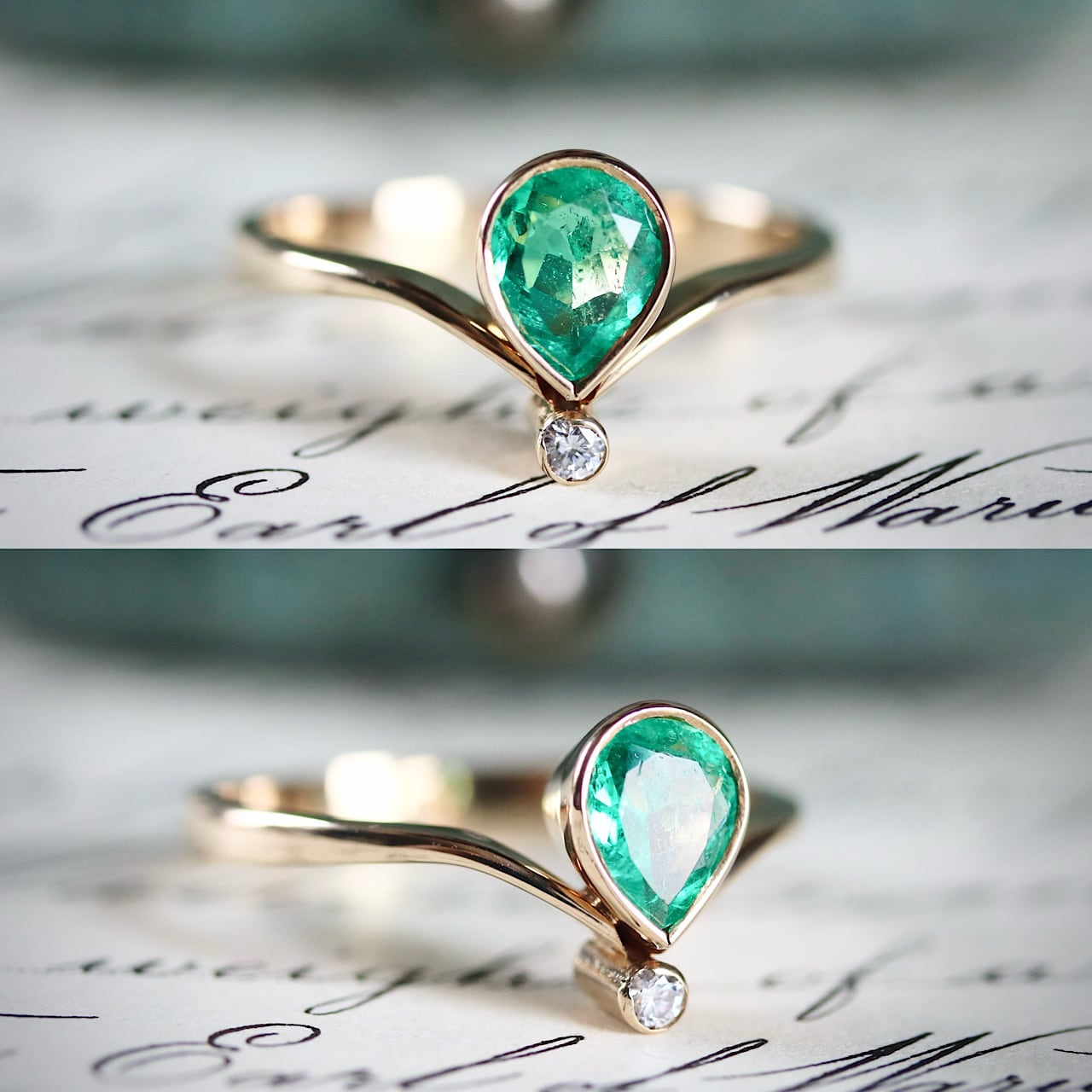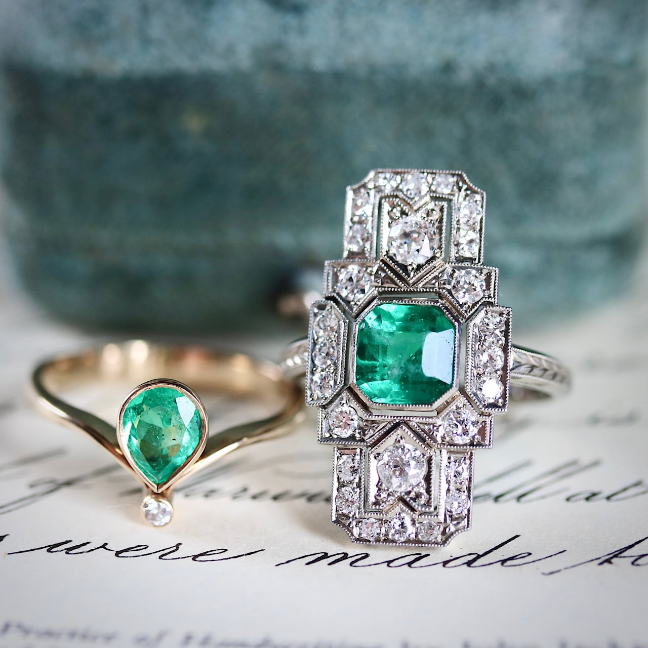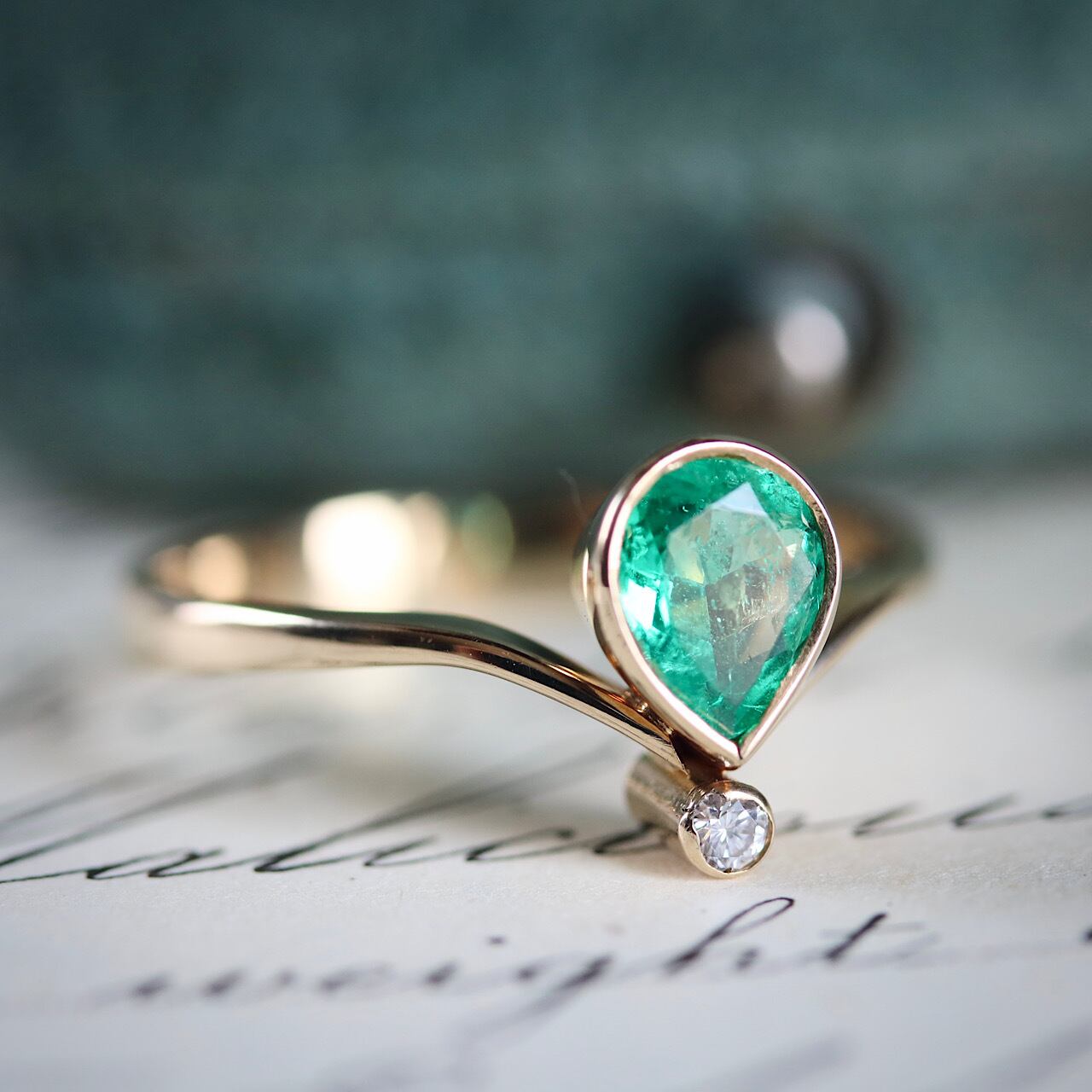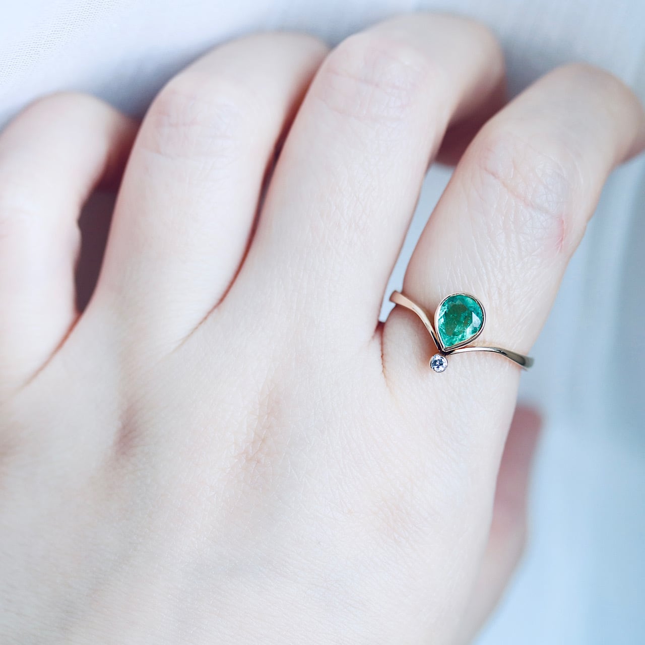 雫を思わせるようなペアシェイプカットの天然エメラルドにダイヤモンドが添えられた、上品なヴィンテージリング。