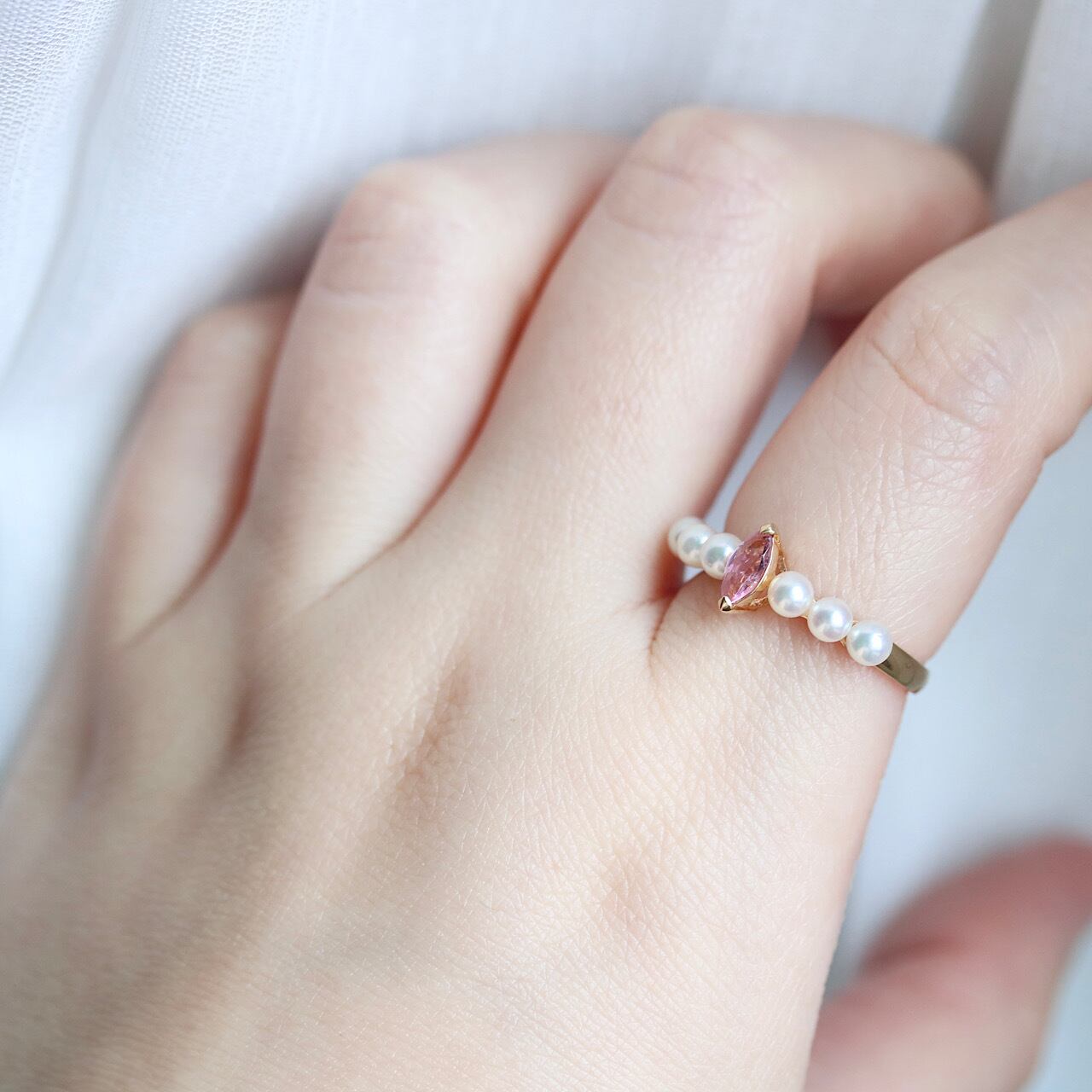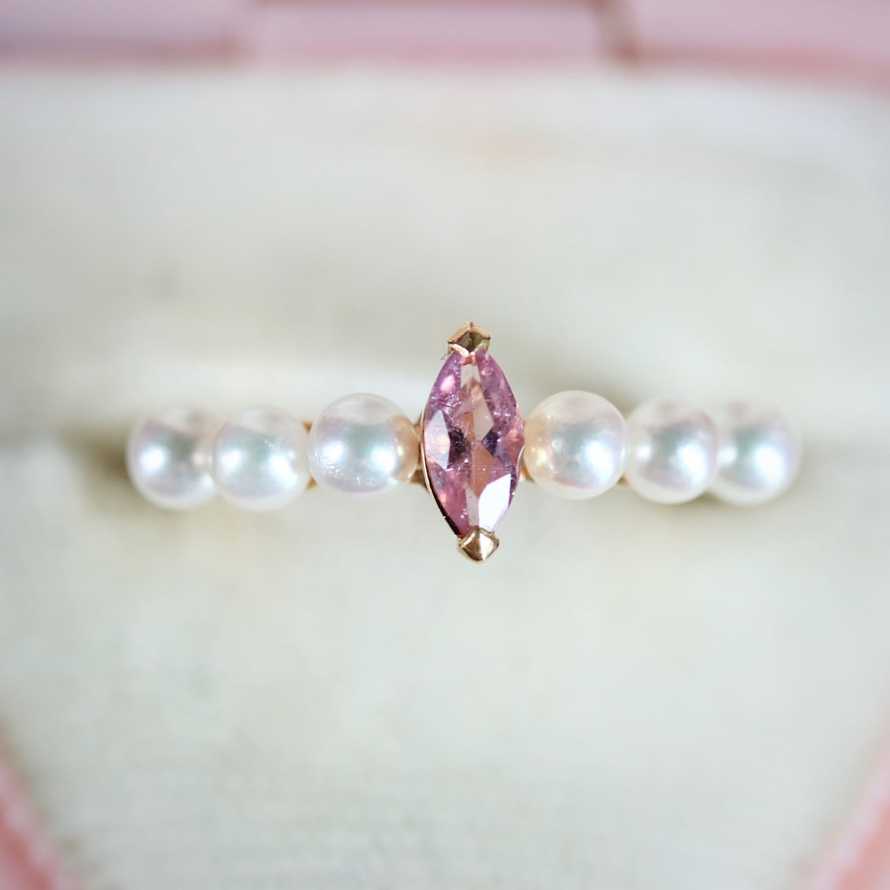 可愛らしいピンクカラーの天然ピンクトルマリンと上品なあこやベビーパールの組み合わせが愛らしい、乙女チックなヴィンテージリング。