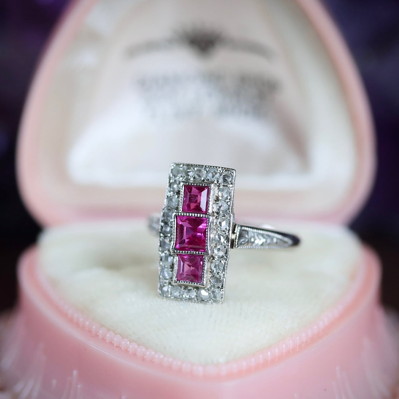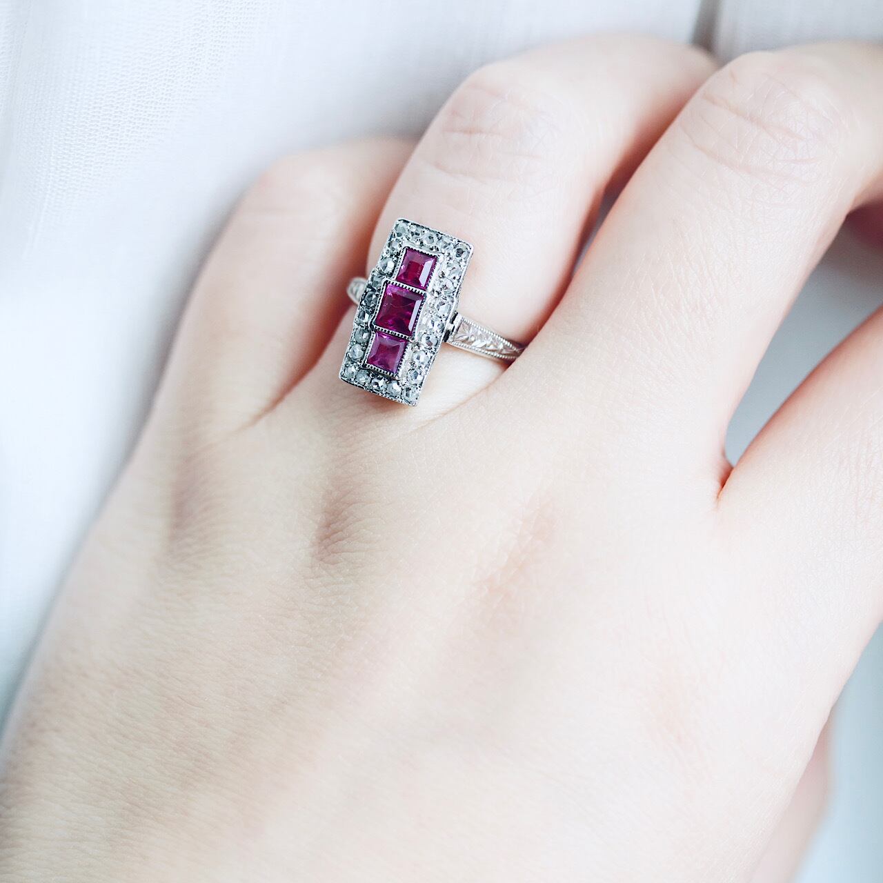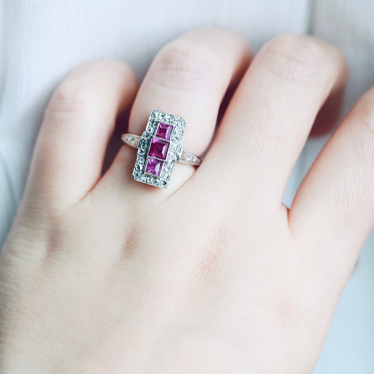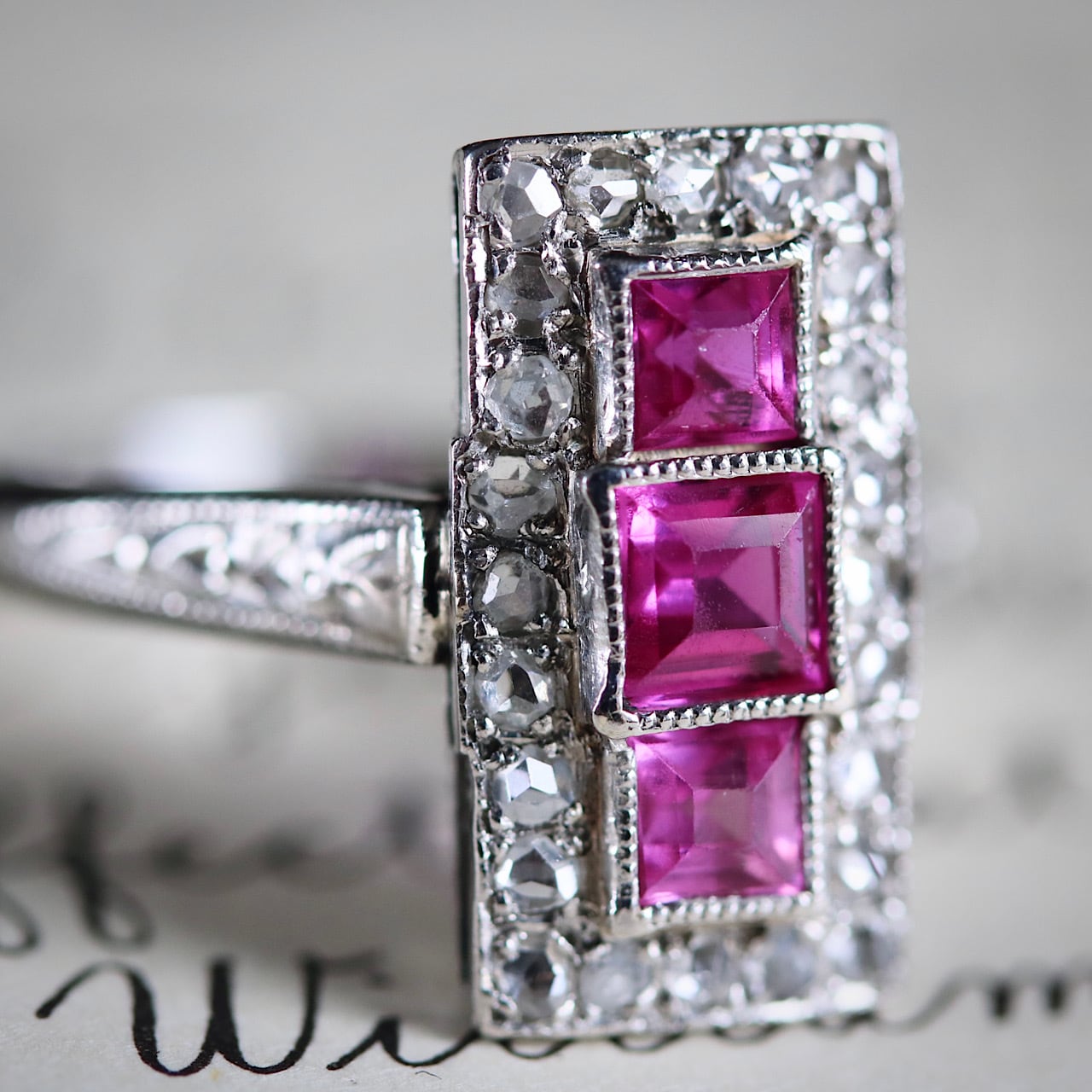P.m 900 プラチナ製 合成ピンクサファイア&アンティークダイヤモンドのアールデコリング。