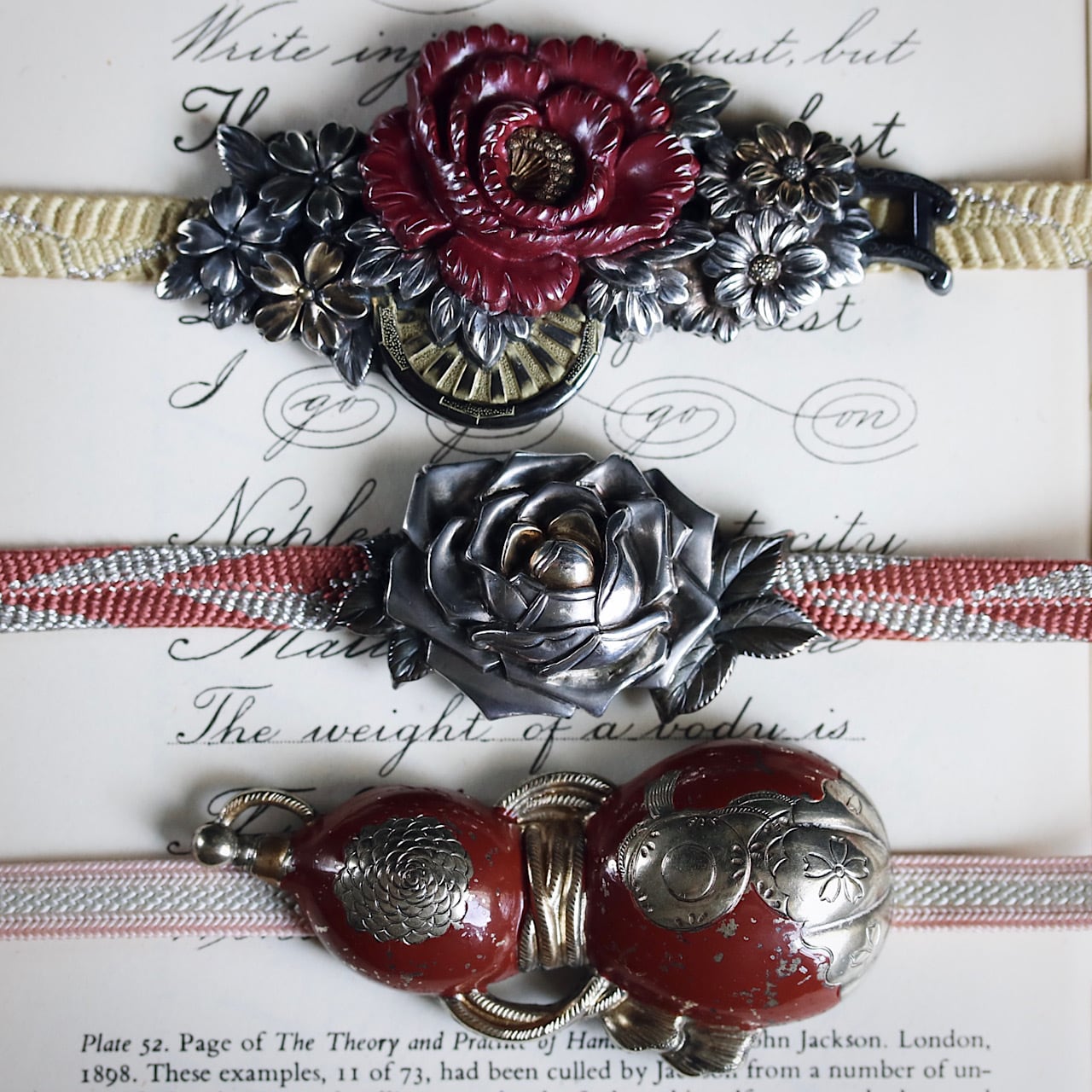 ロマンティックな薔薇モチーフのアンティーク帯留めになります。