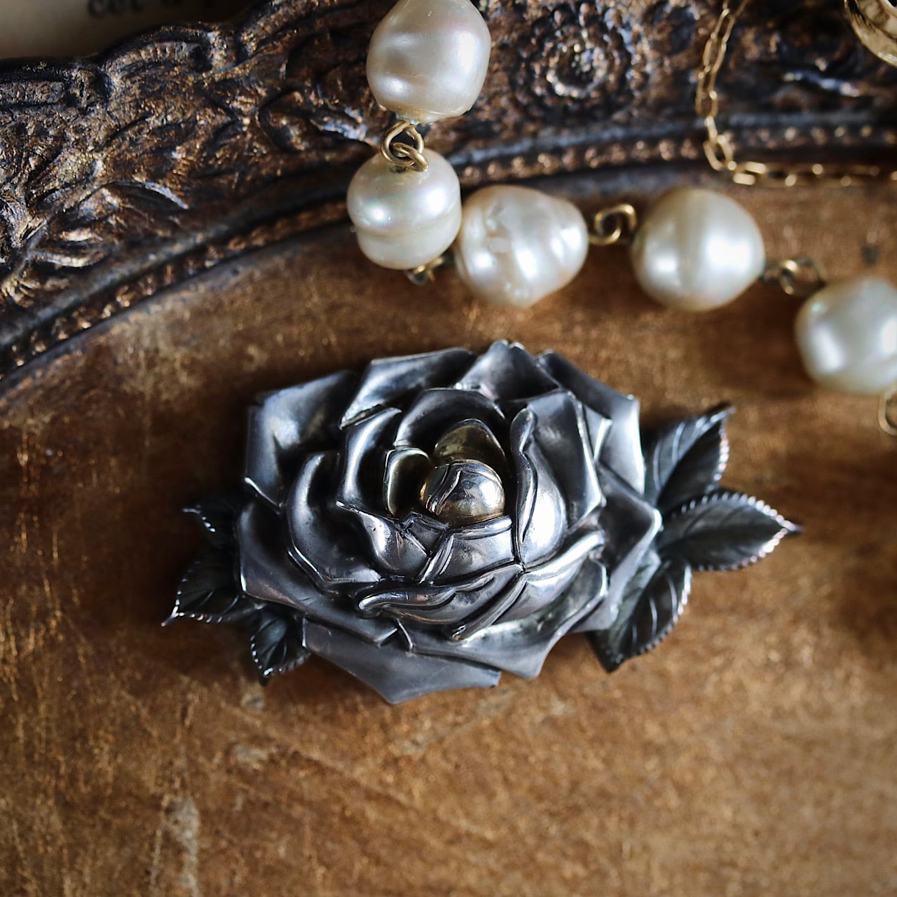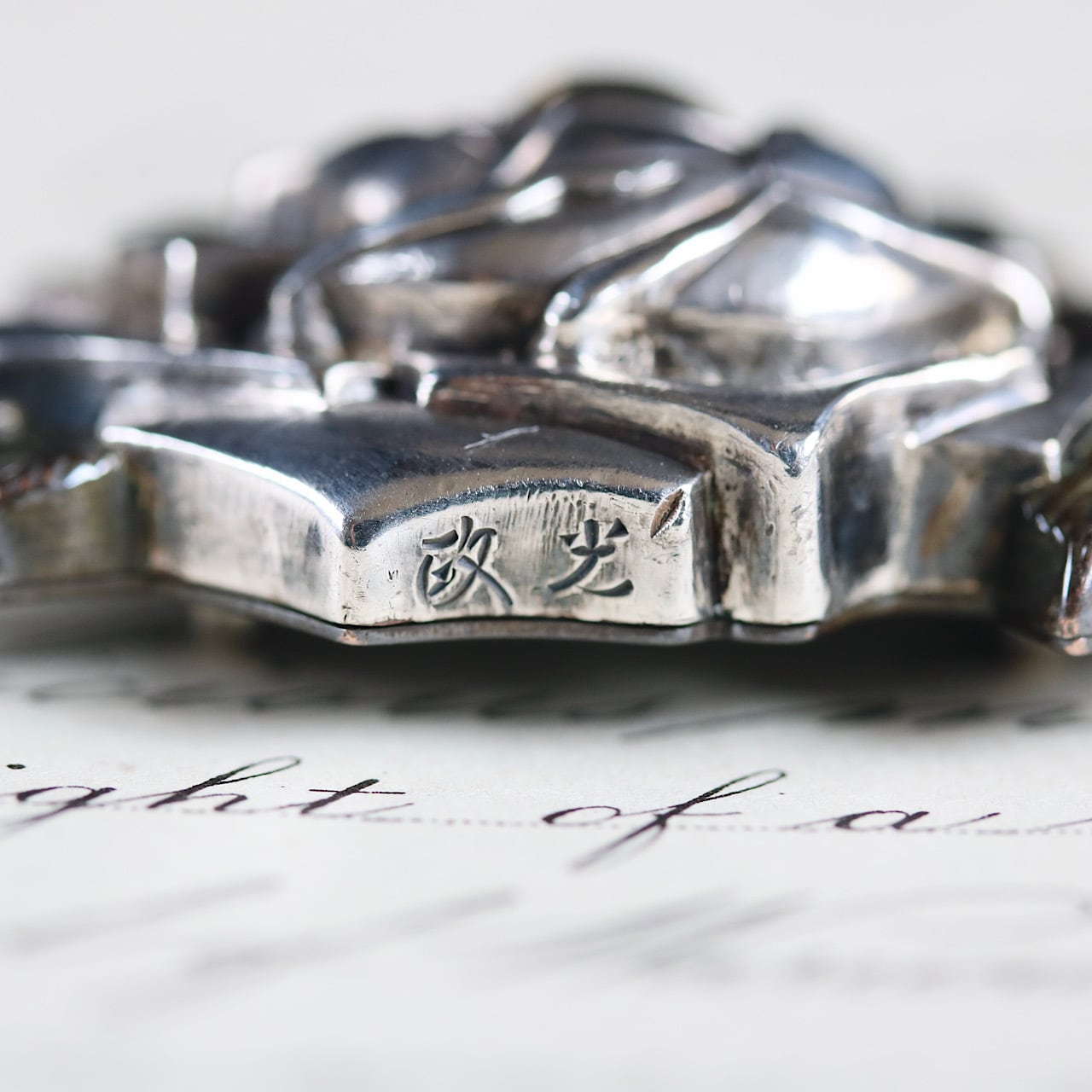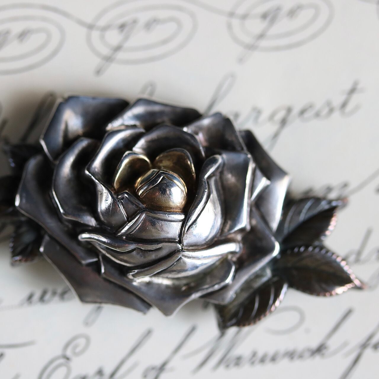 銀製 薔薇の図 彫金のアンティーク帯留め。