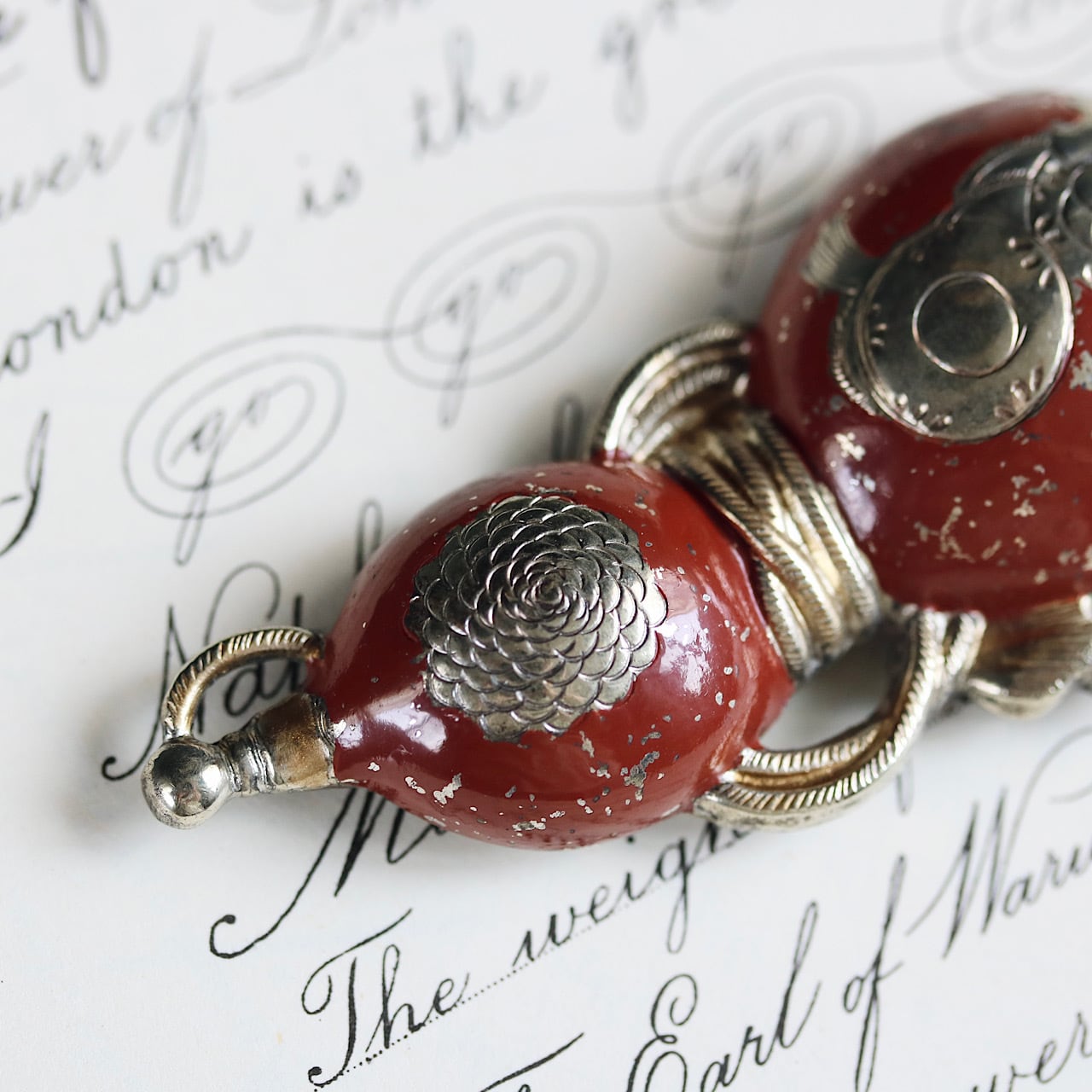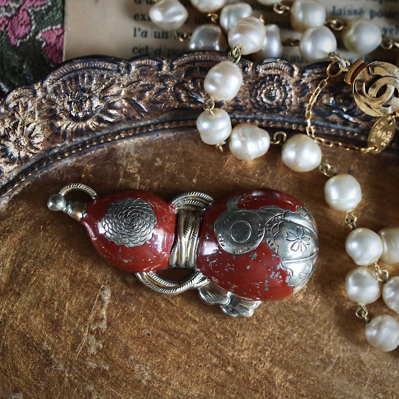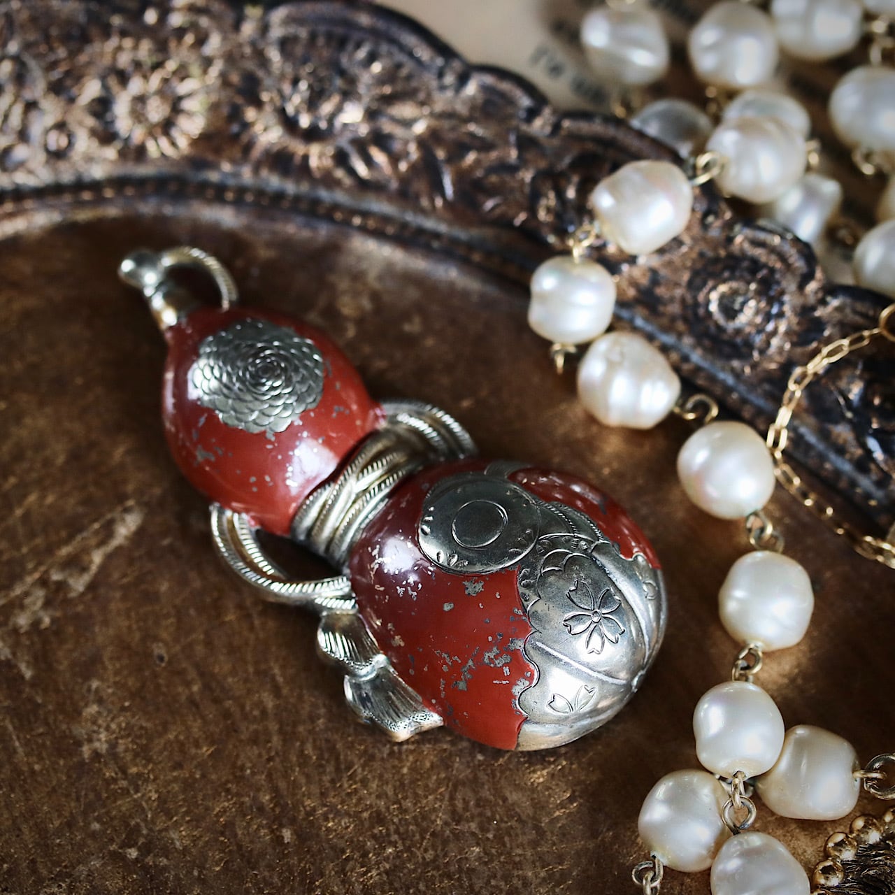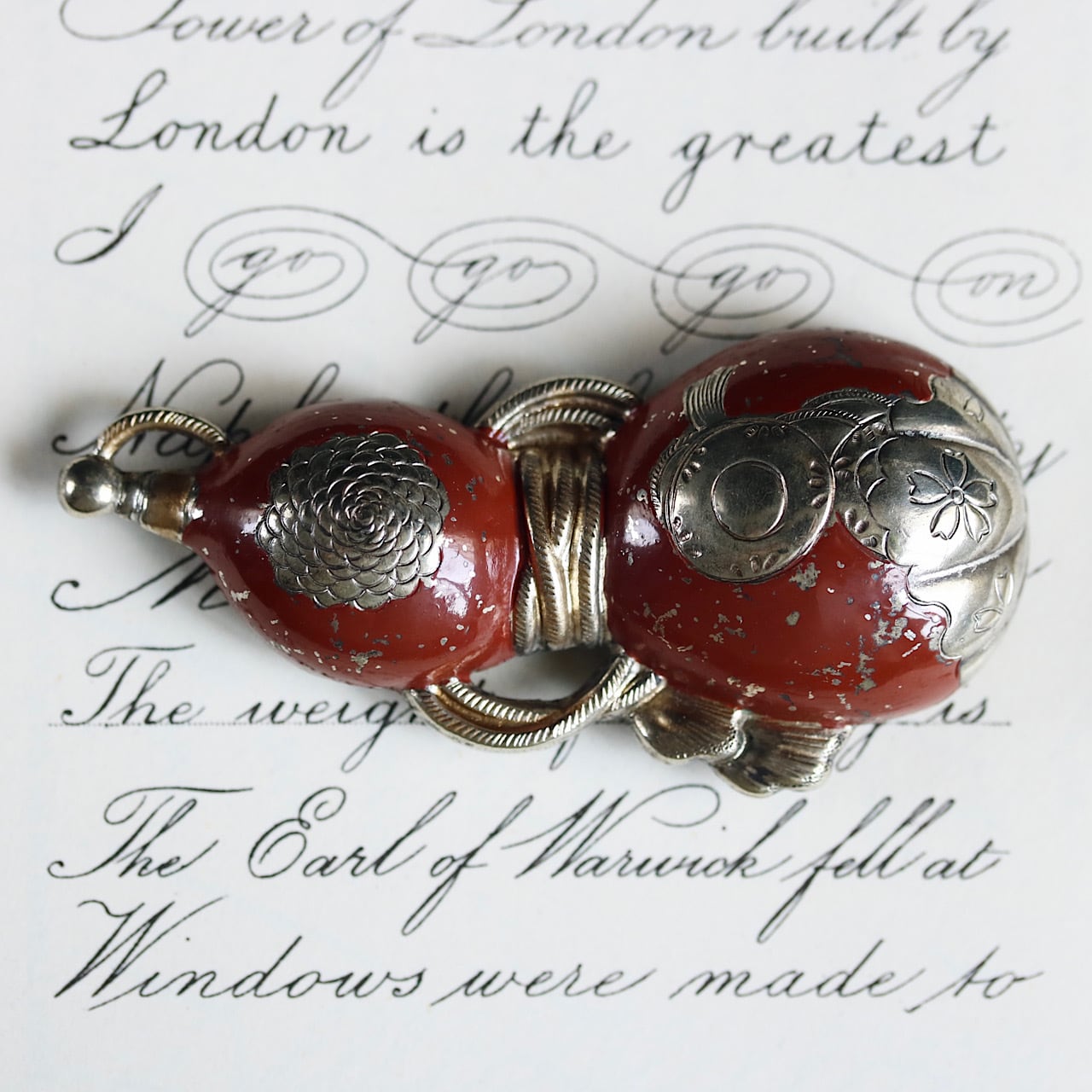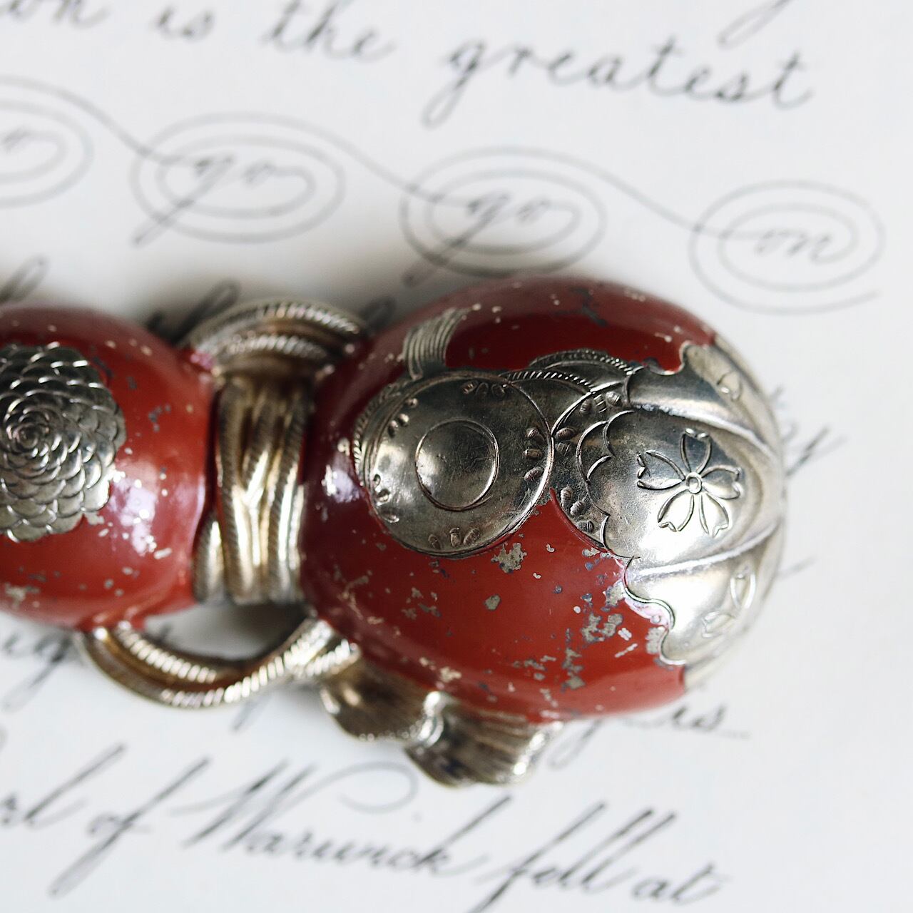 落ち着いた朱色の瓢箪の中に禿菊や鼓、桜が彫られた美しいアンティーク帯留め。