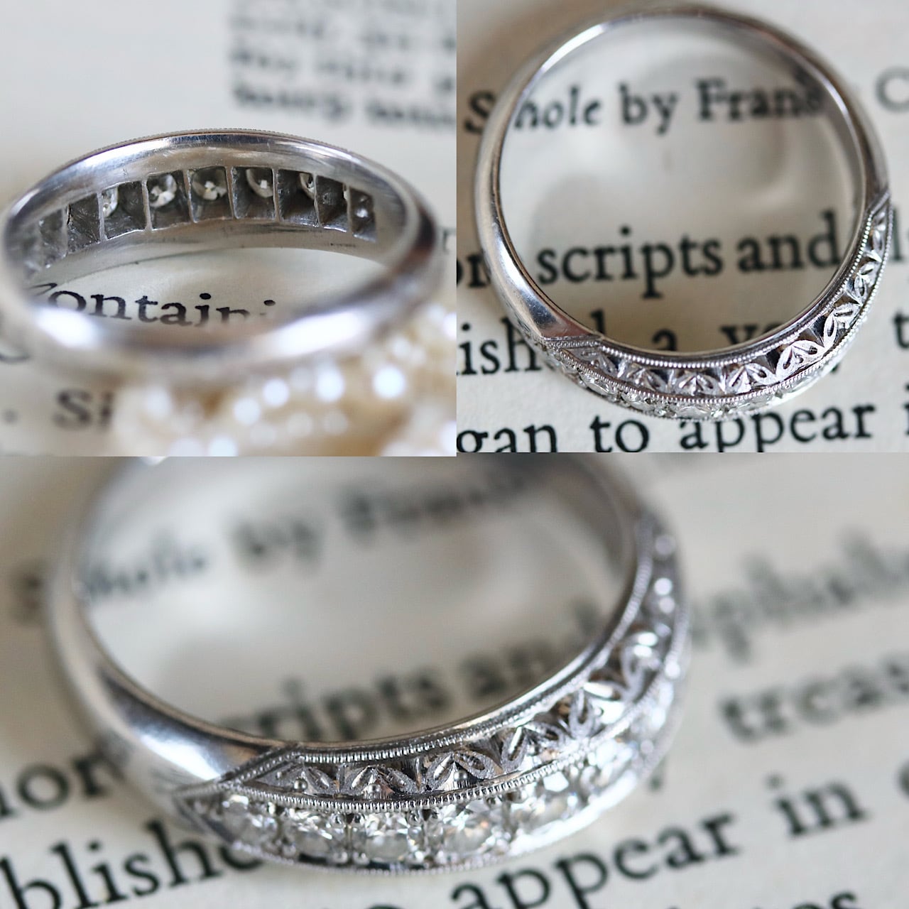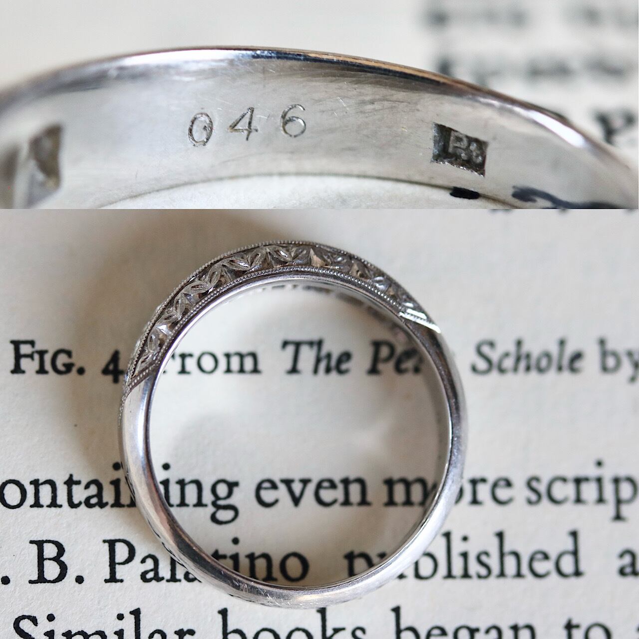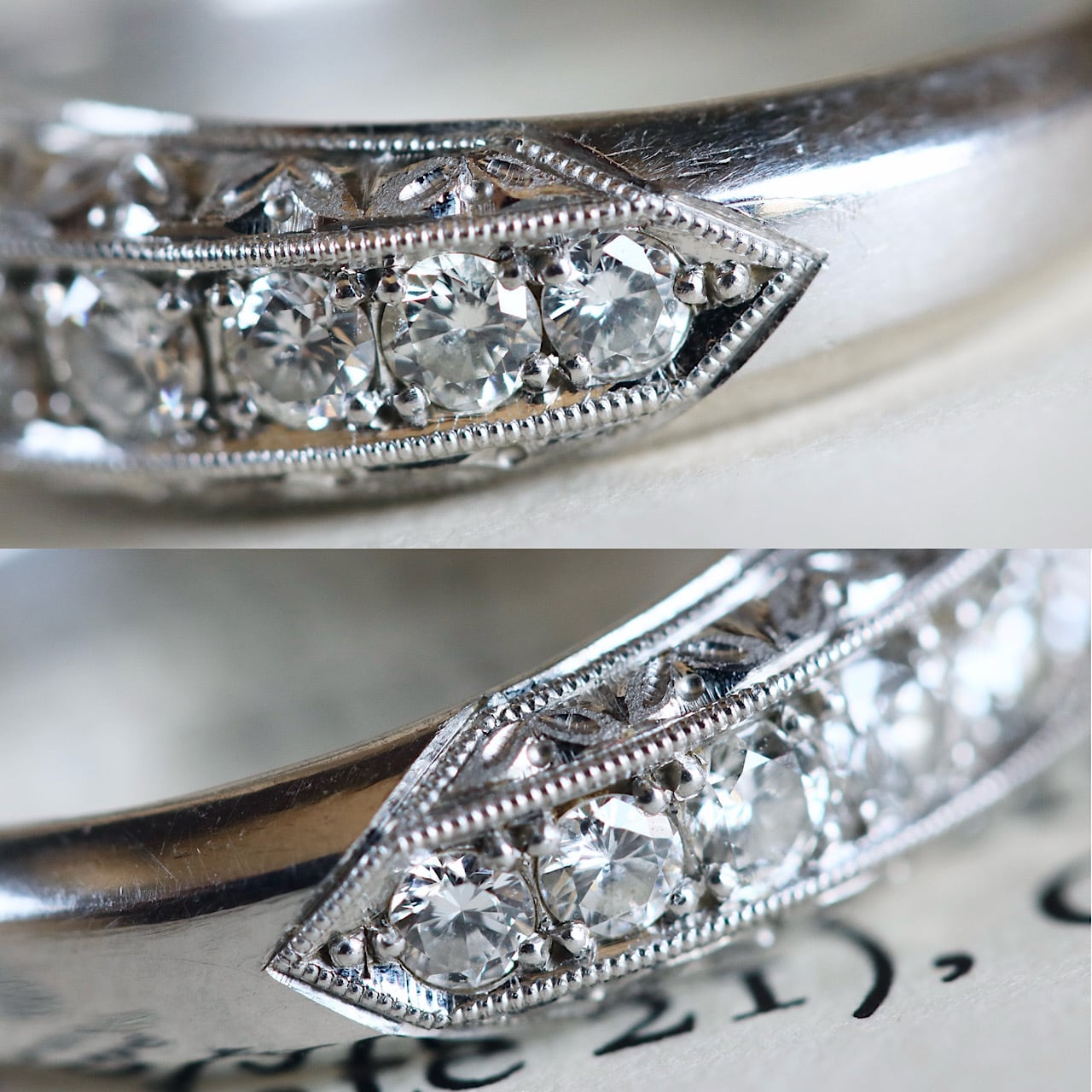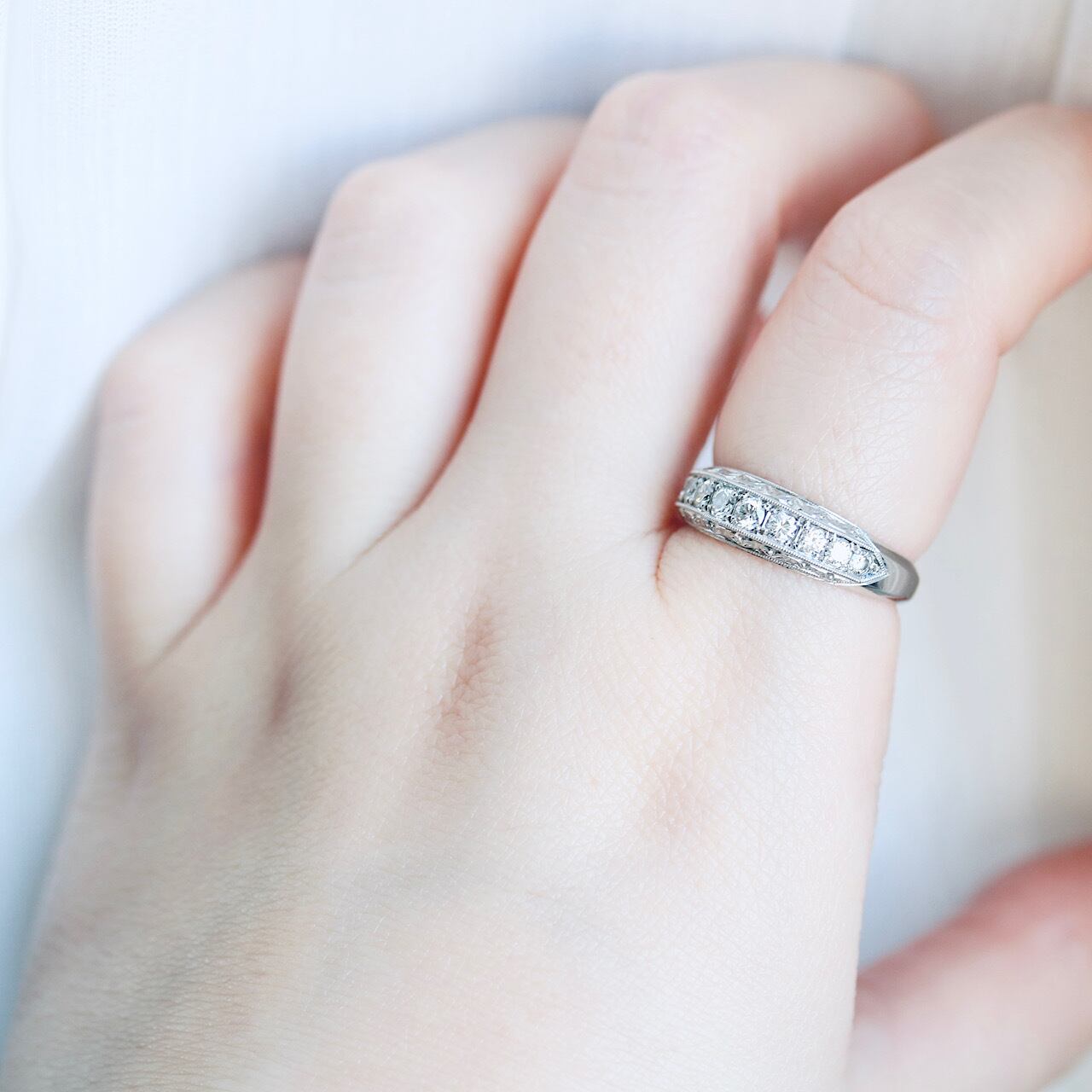 現代でも人気のある一文字リングですが、こちらはダイヤモンド周りに細やかなミルグレインやリーフの和彫がたっぷりと施されていたりと、ヴィンテージらしい美しいデザインとなっています。