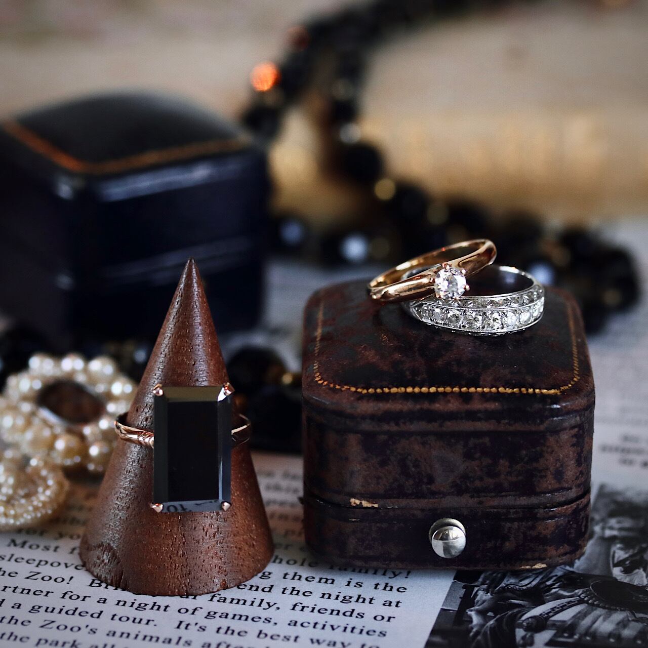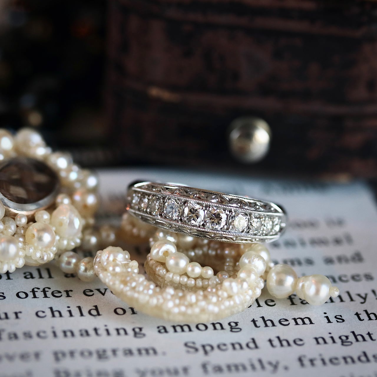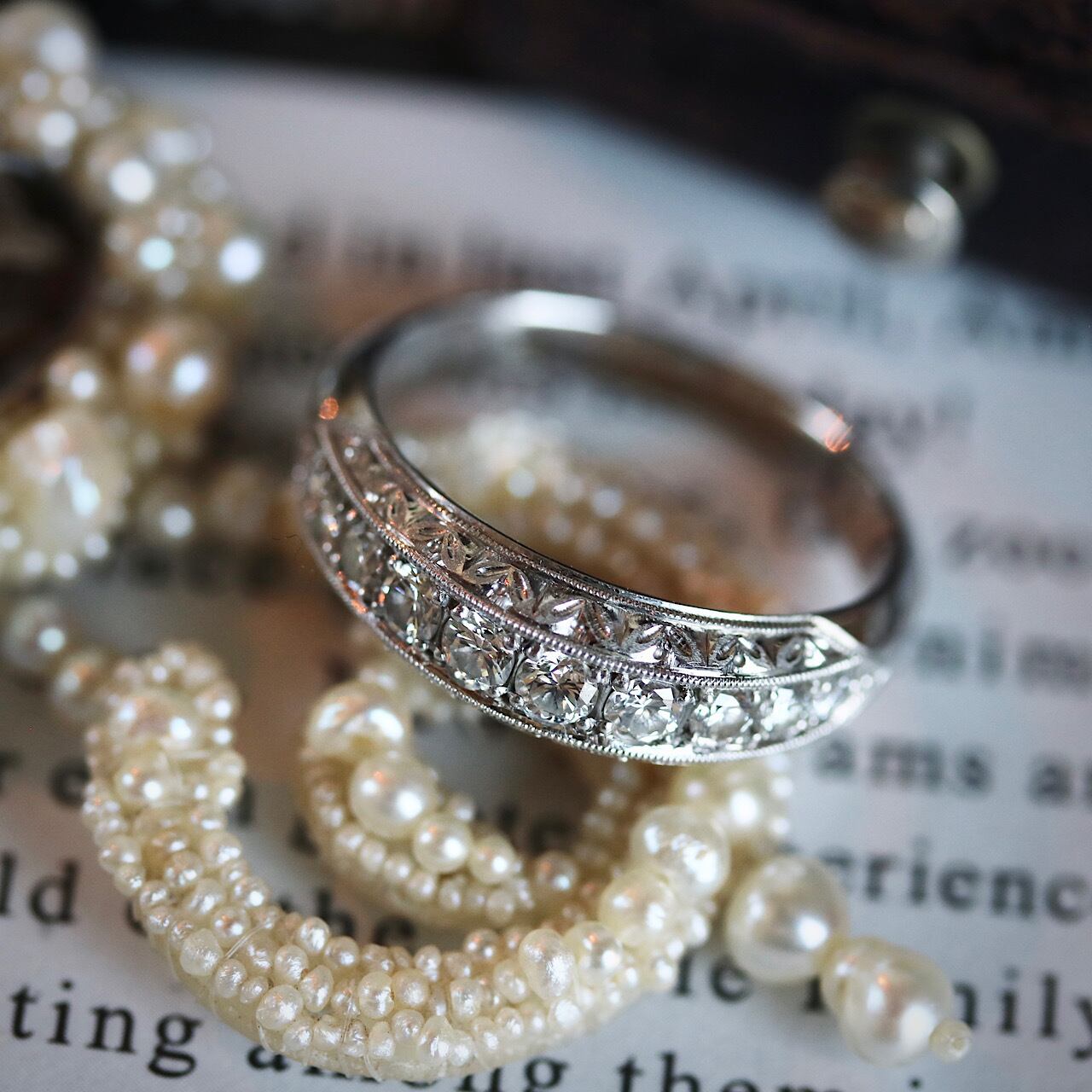 ダイヤモンドが一列に並んだ、煌びやかな一文字デザインのヴィンテージリング。