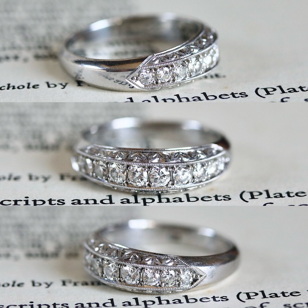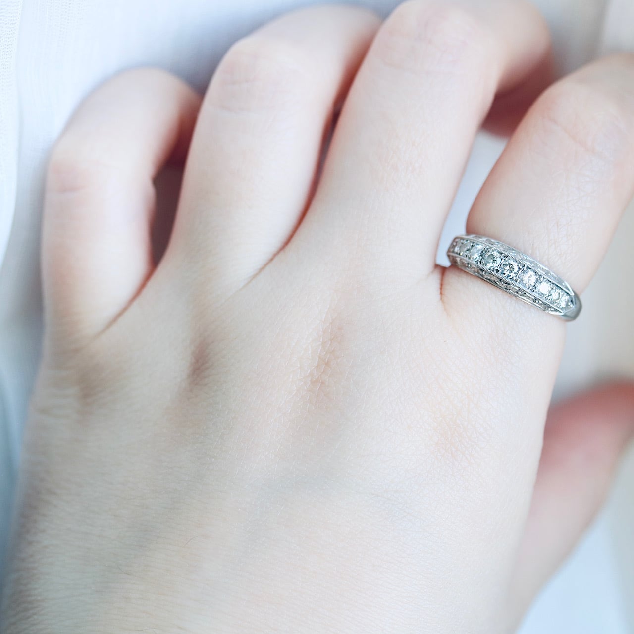 P.t プラチナ製 ダイヤモンドの和彫デザインの一文字(ハーフエタニティ)ヴィンテージリング。