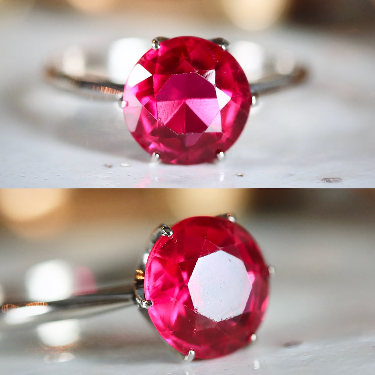 合成ルビーは、鮮やかなベリーピンク色のものが使用されており、クラウン型の立爪セッティングがシンプルながらも、さり気ないお洒落さを感じさせてくれるヴィンテージリングです。