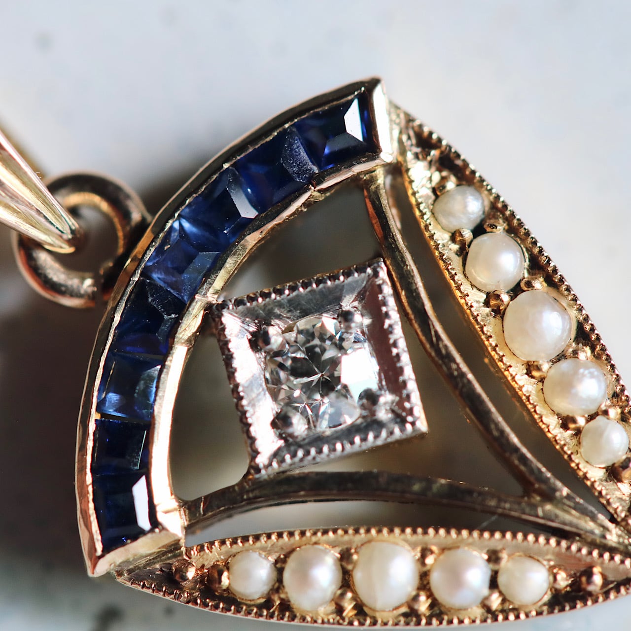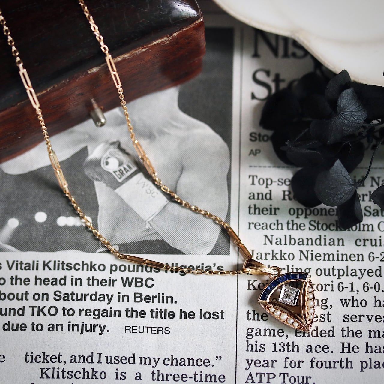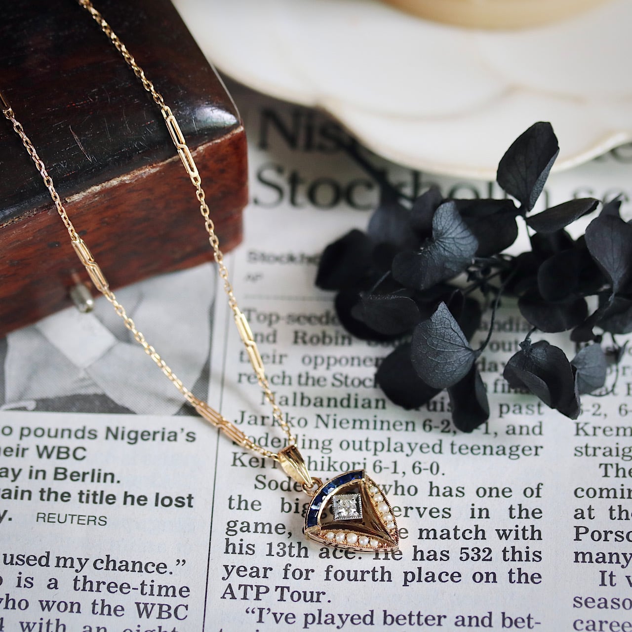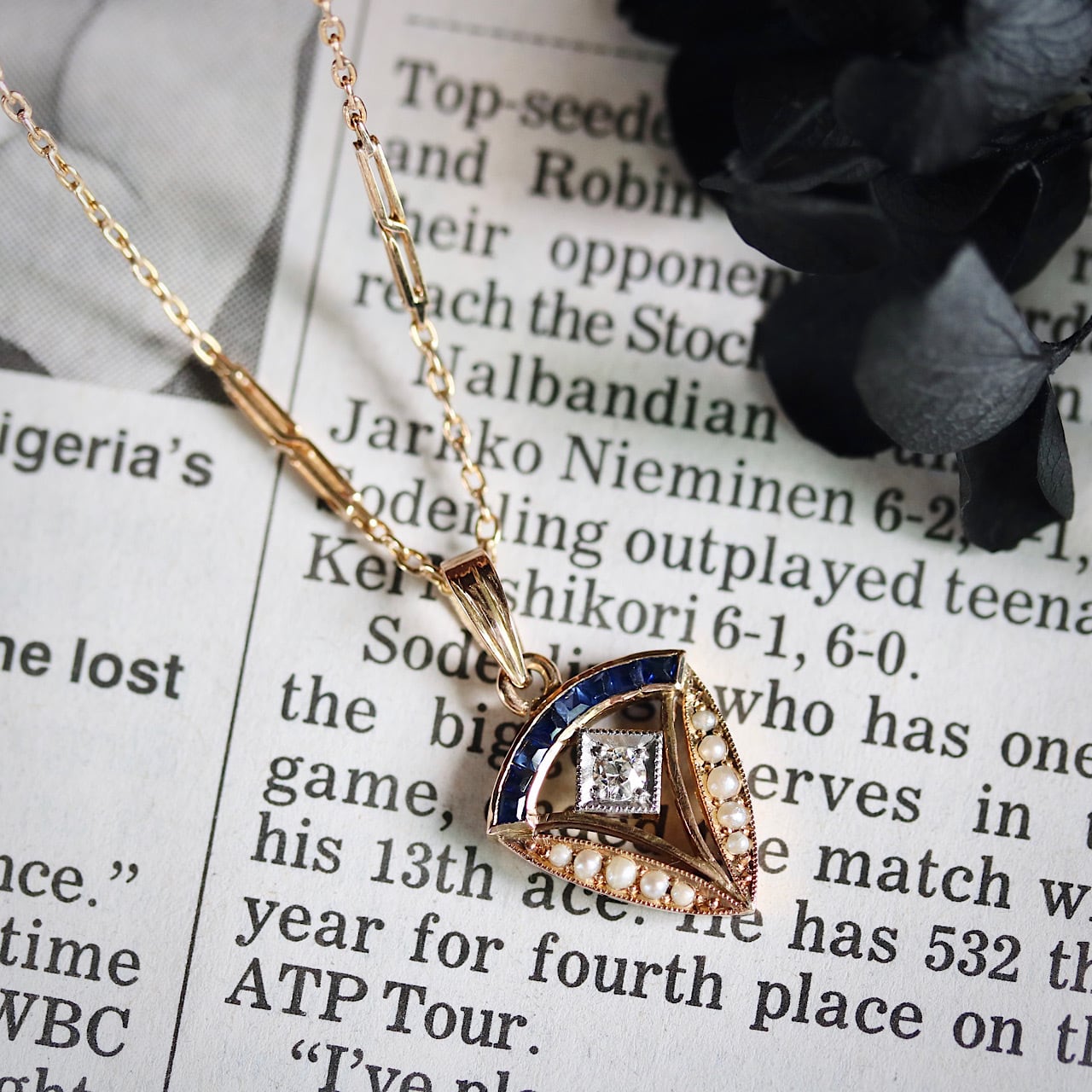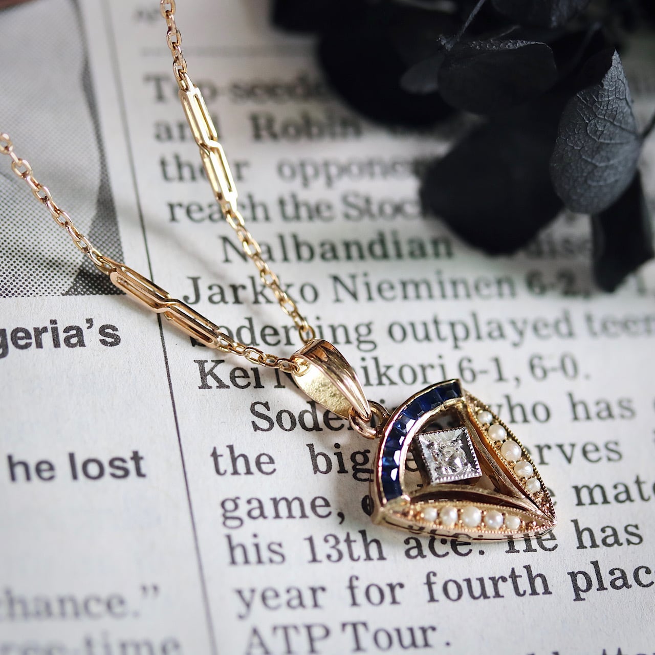 K18 オールドヨーロピアンカットダイヤモンド&合成サファイア&芥子パールの和製アールデコネックレス (K18チェーン付)