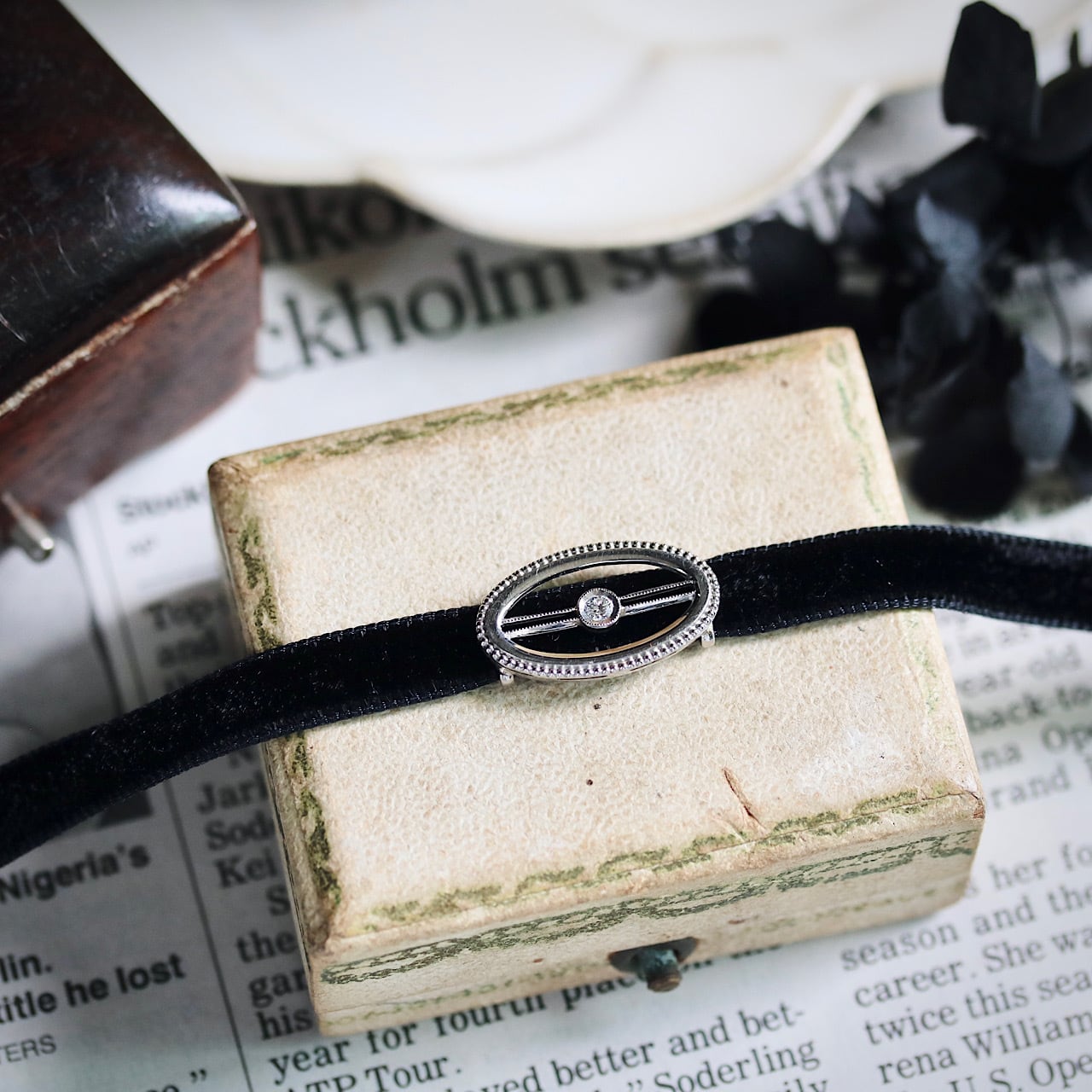 アールデコらしい直線的なデザインに、オールドカットのダイヤモンドが輝く小さな帯留め。