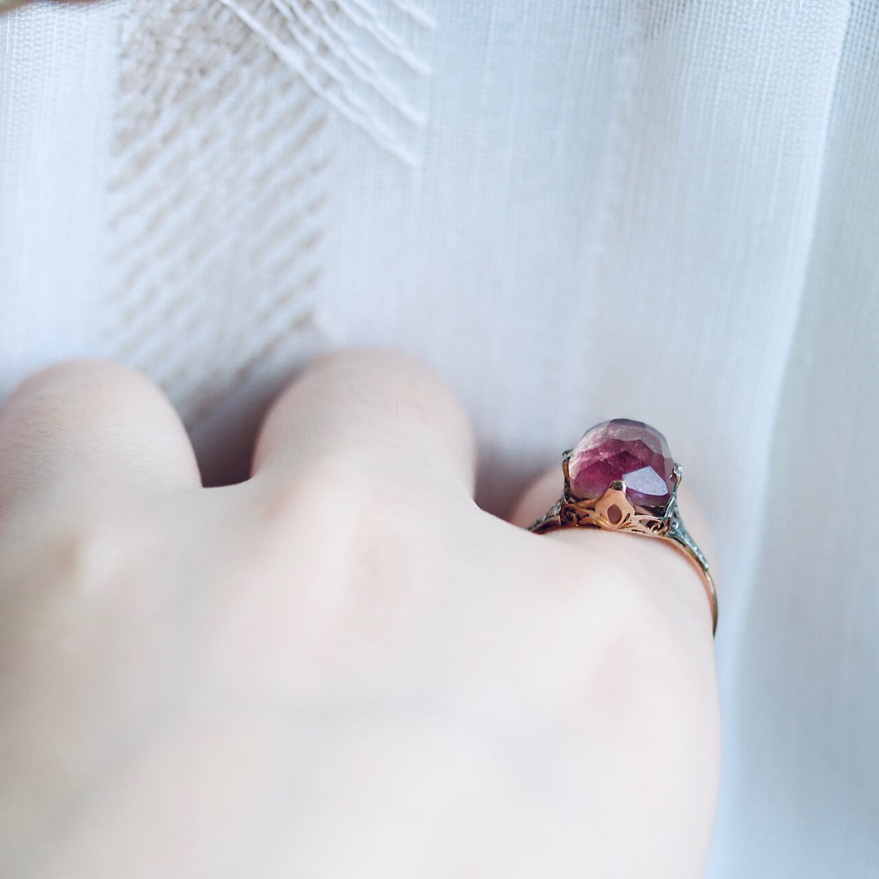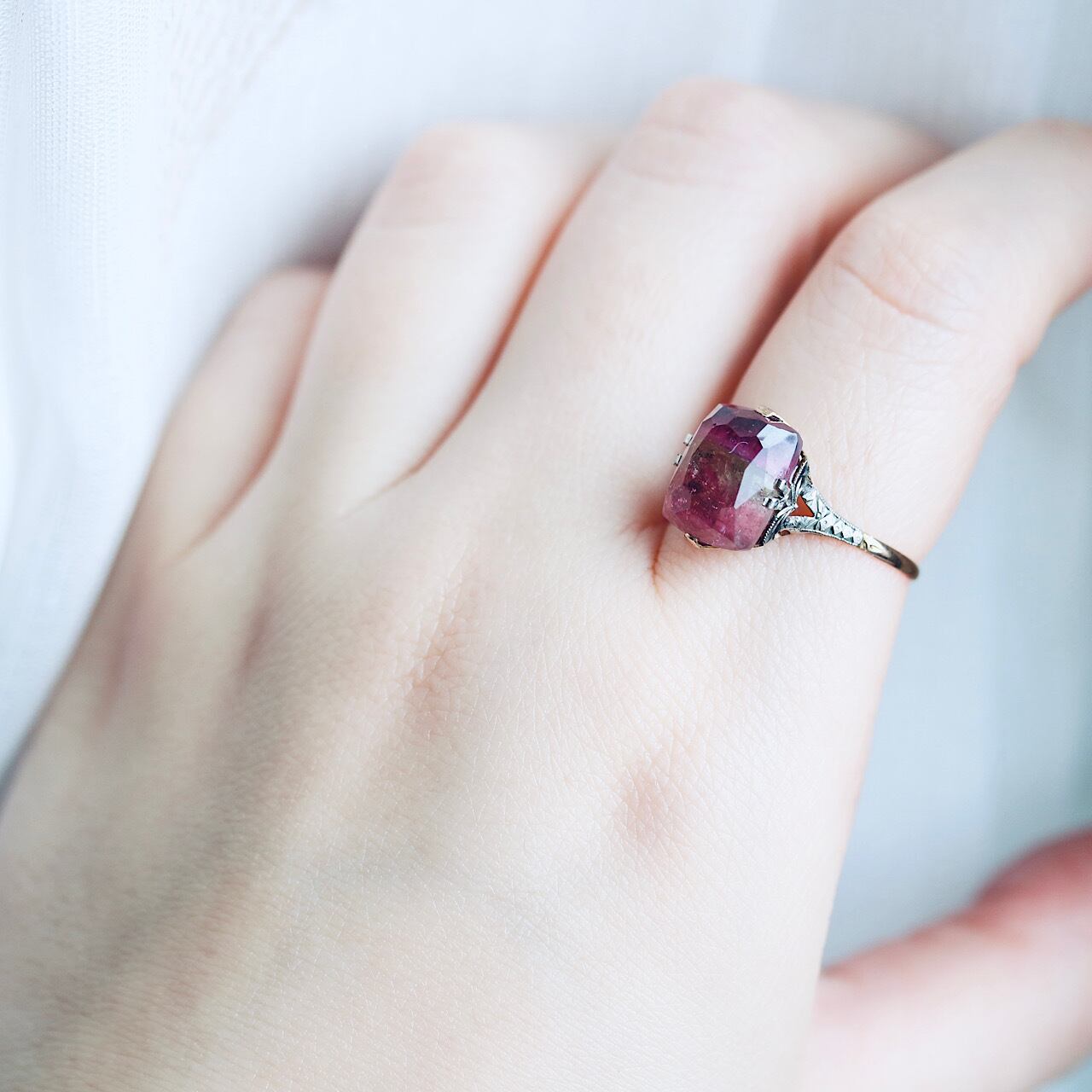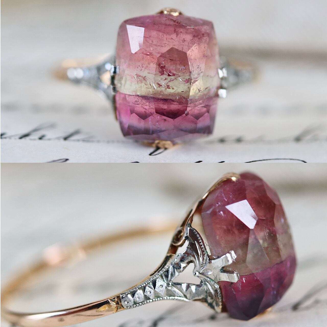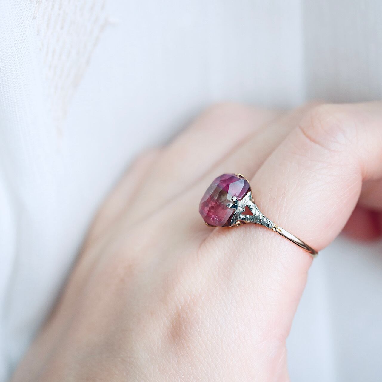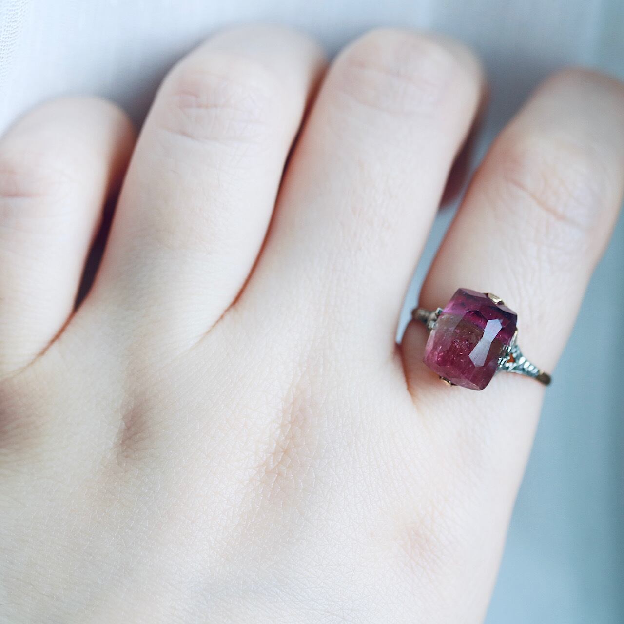 赤紫〜ピンクのグラデーションと淡いグリーンが合わさったバイカラートルマリンが使用された個性的なヴィンテージリング。