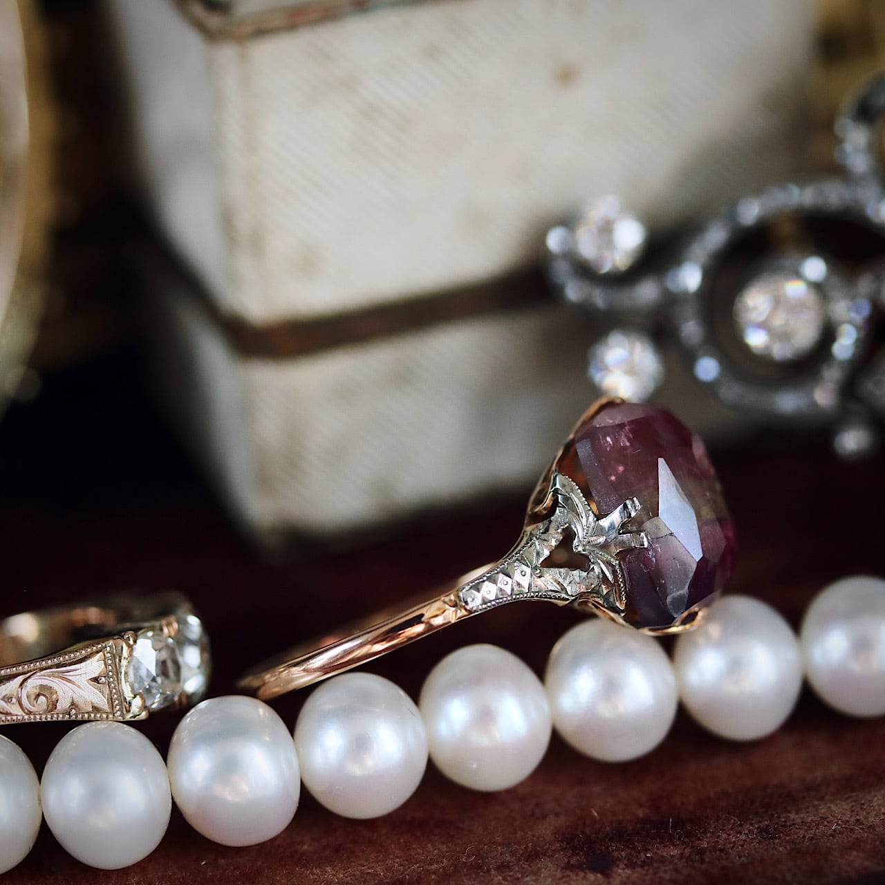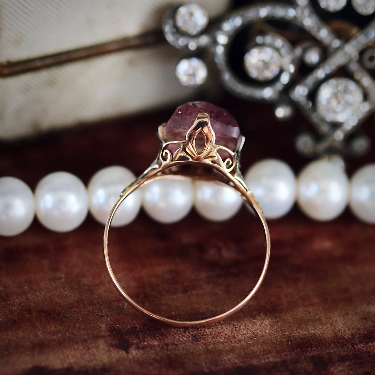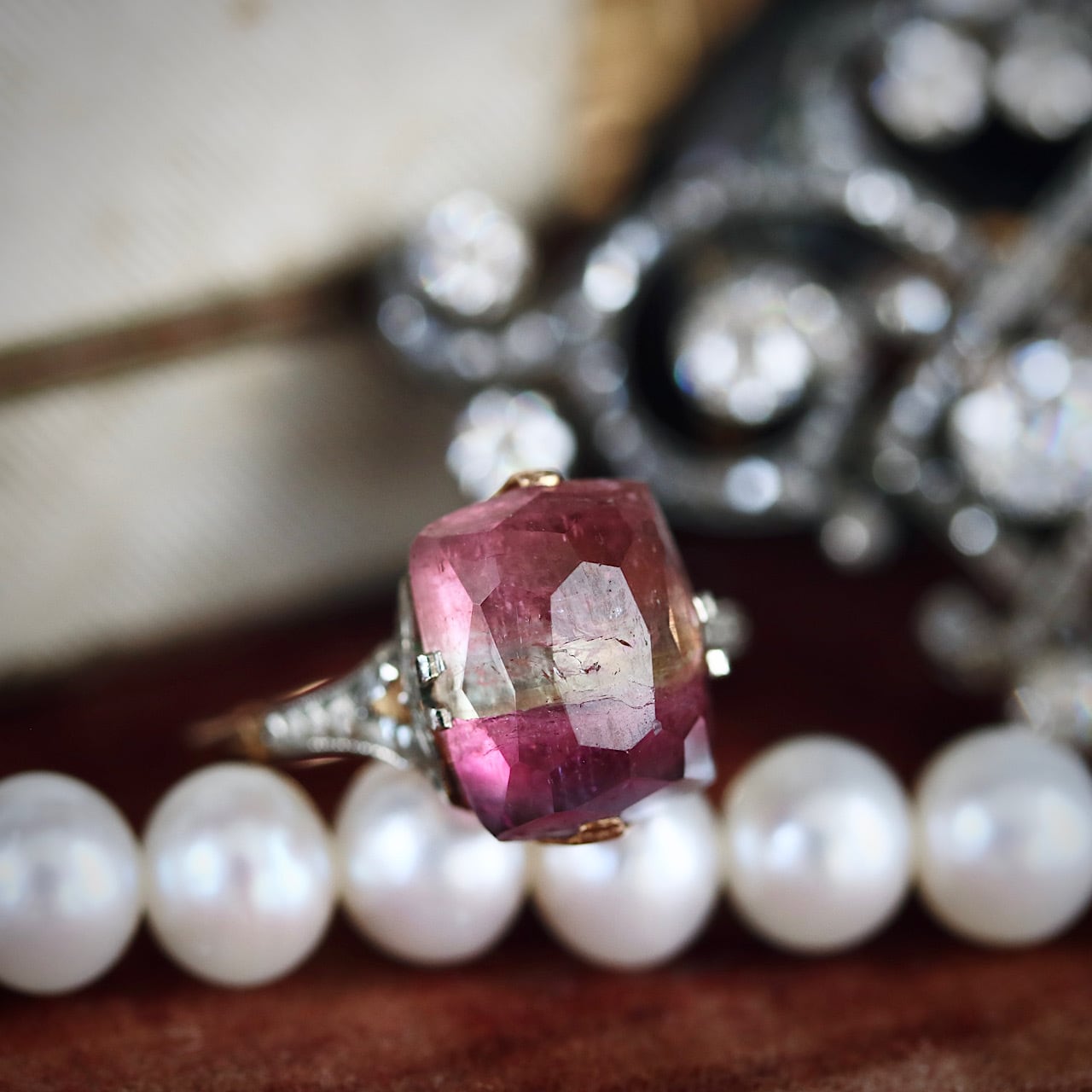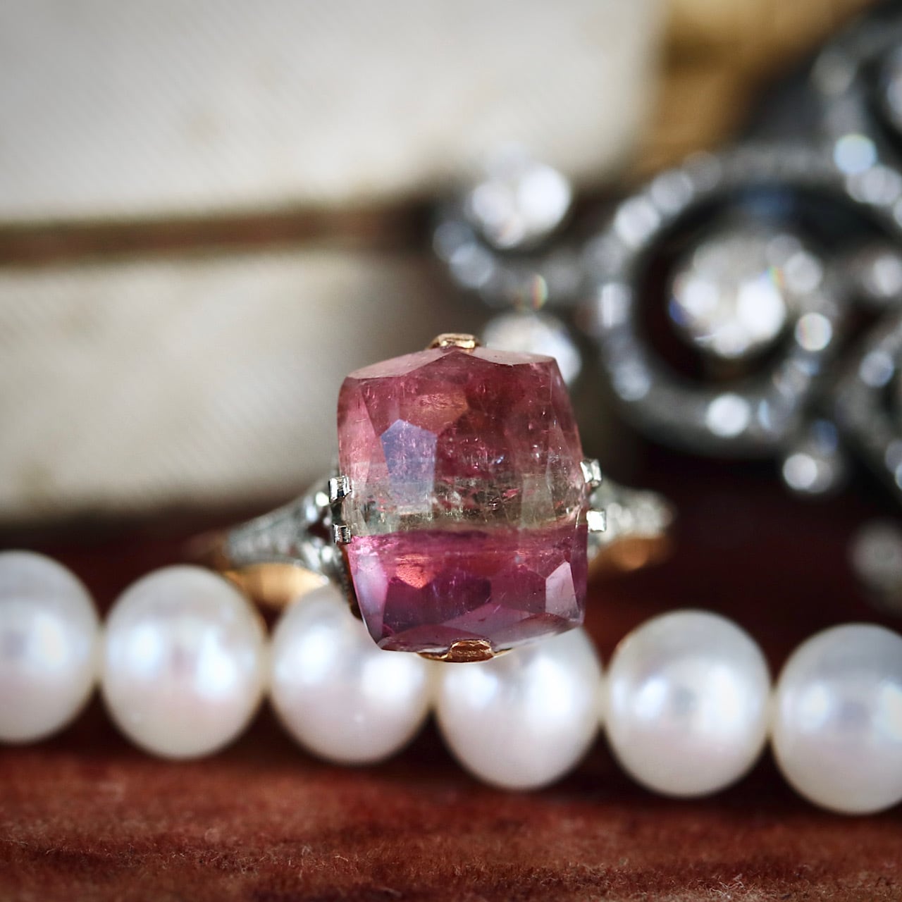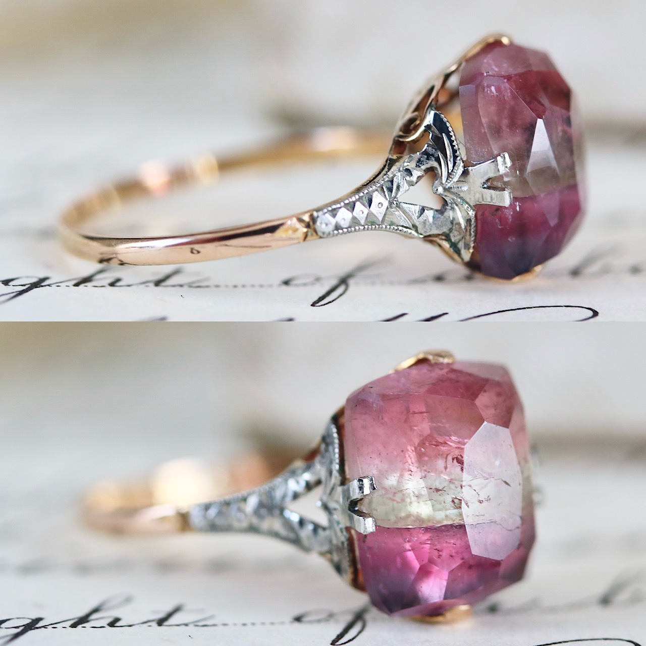 赤紫〜ピンクのグラデーションと淡いグリーンが合わさったバイカラートルマリンが使用された個性的なヴィンテージリング。