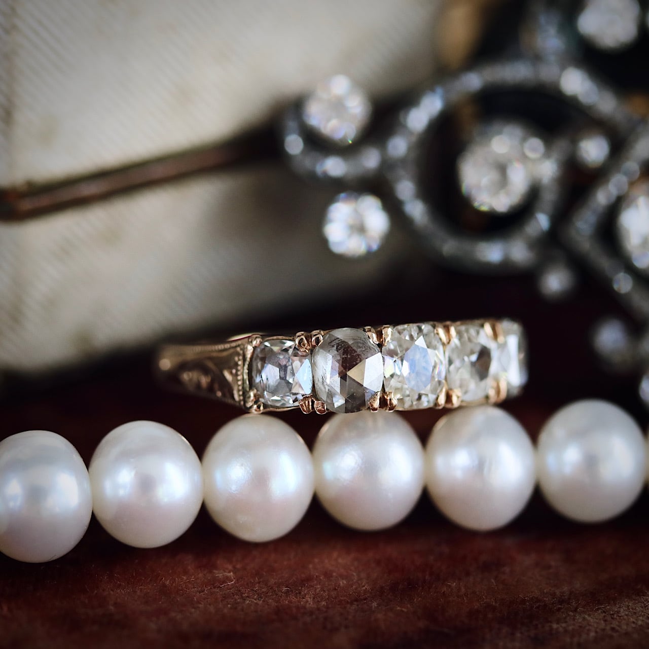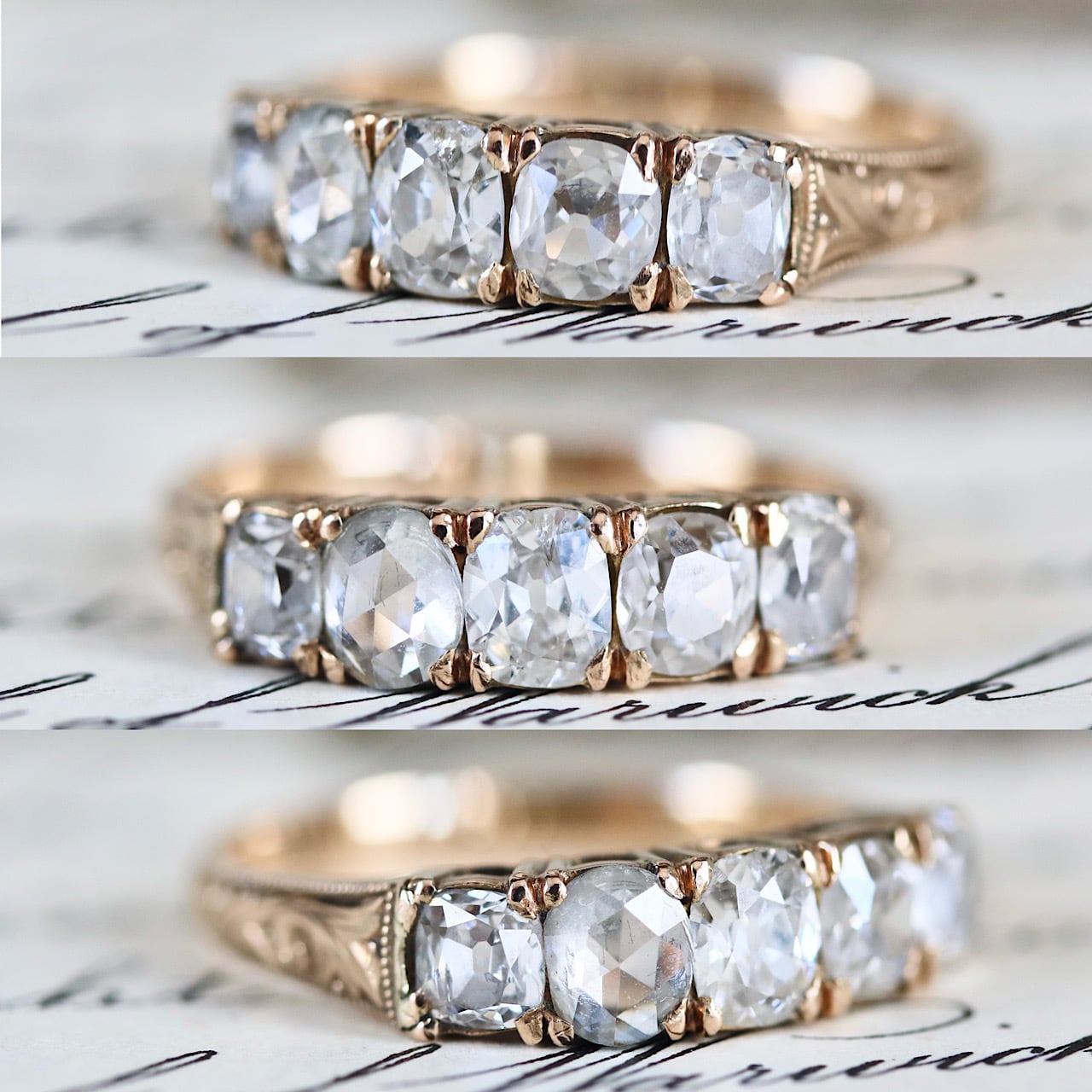 ごろっとした大きなアンティークダイヤモンドが5つ並んだ一文字デザインのヴィンテージリング。