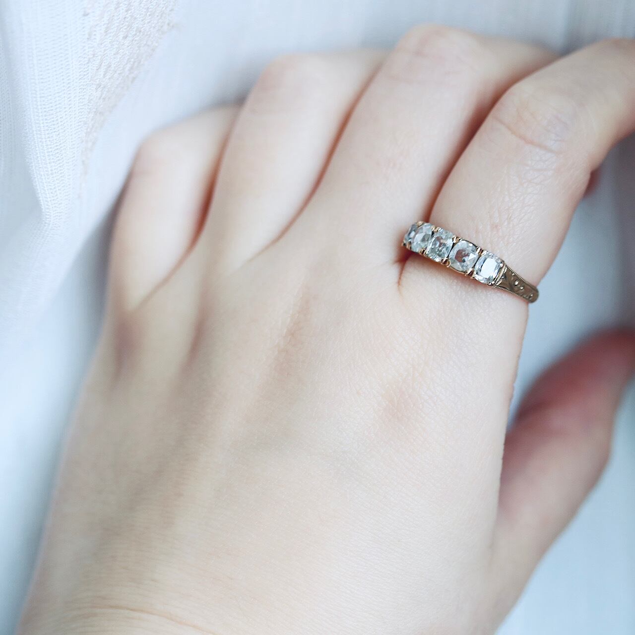 K18 オールドマインカットダイヤモンド&ローズカットダイヤモンドの一文字リング。