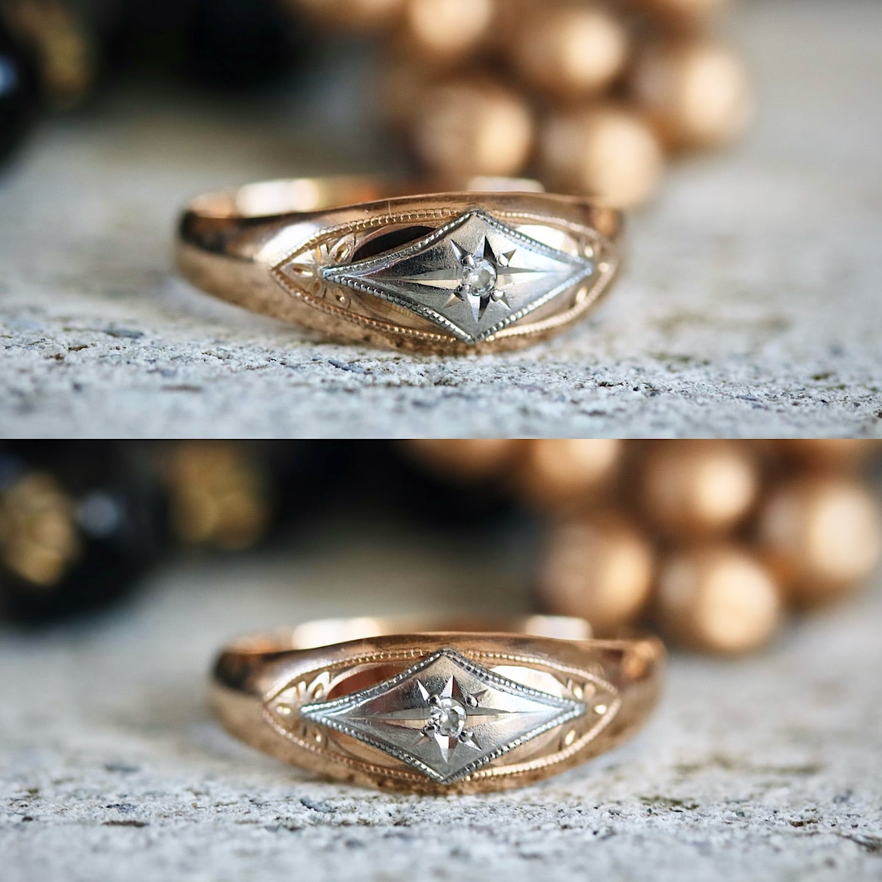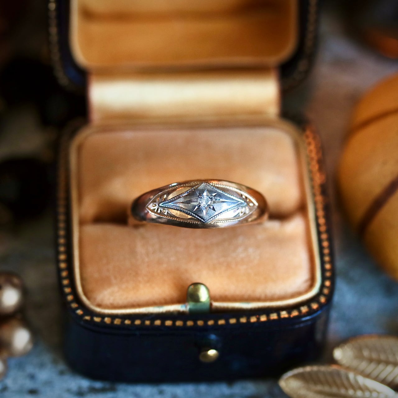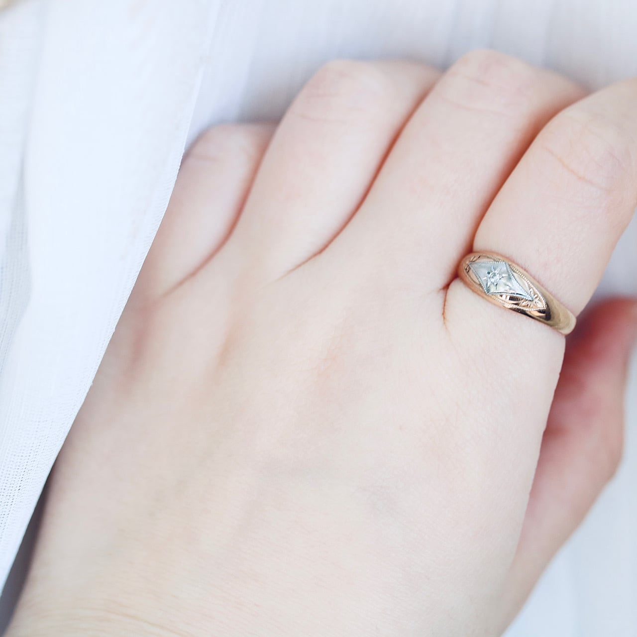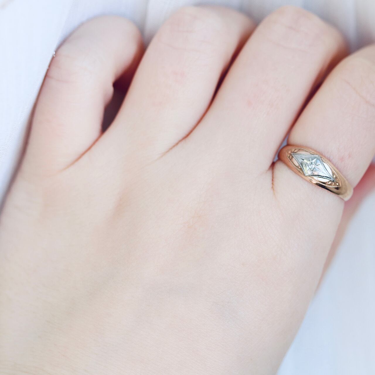 中心に星留めの小さな一粒ダイヤモンドがセッティングされたヴィンテージリング。